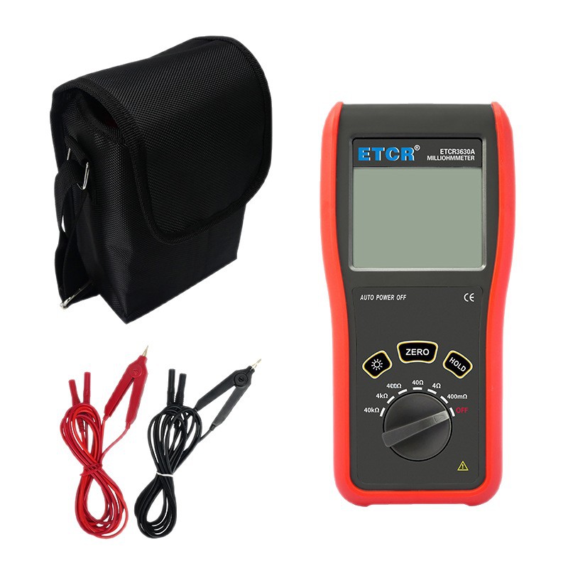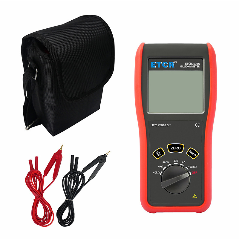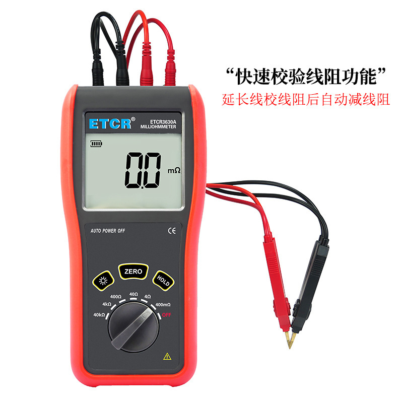 ETCR3640便携式微欧计由主机、测试线组成。主机大屏LCD显示,一目了然。能存储200组数据,电阻测量范围:1uΩ~200Ω,最大测试电流:5A,采用可充电锂电池,电池容量2600mAh,仪表操作简易,携带方便。