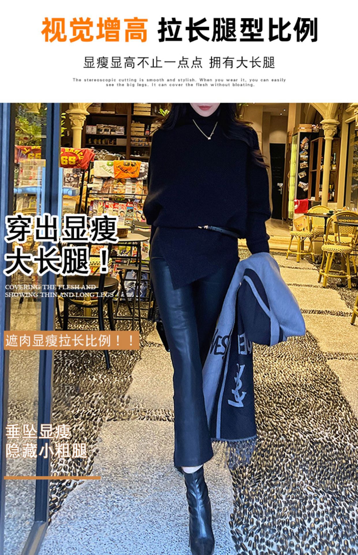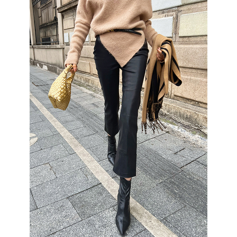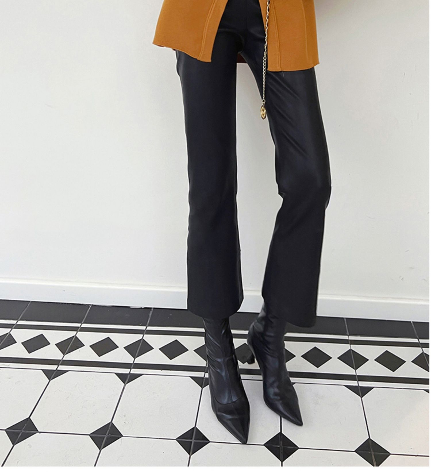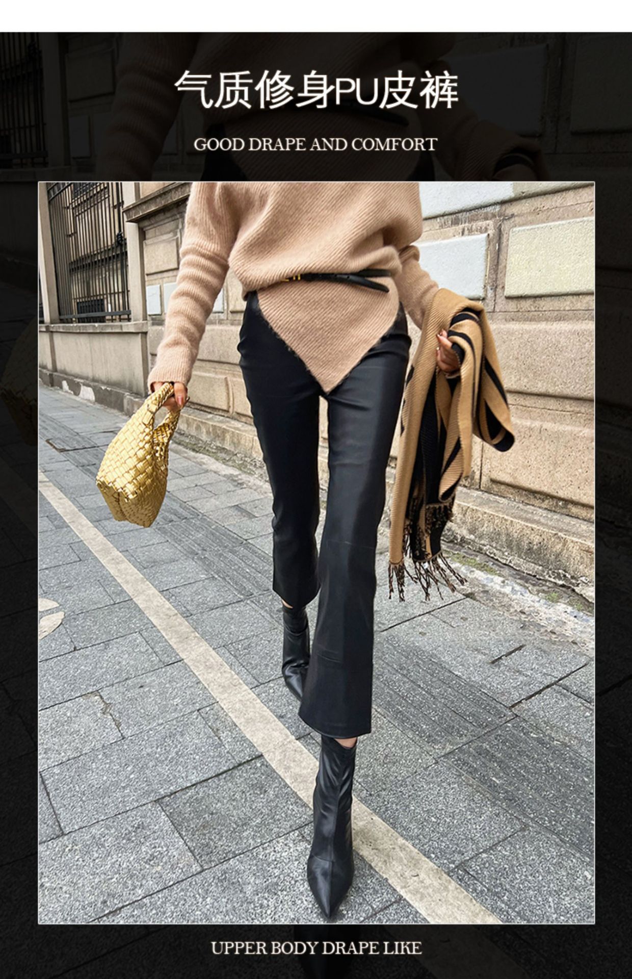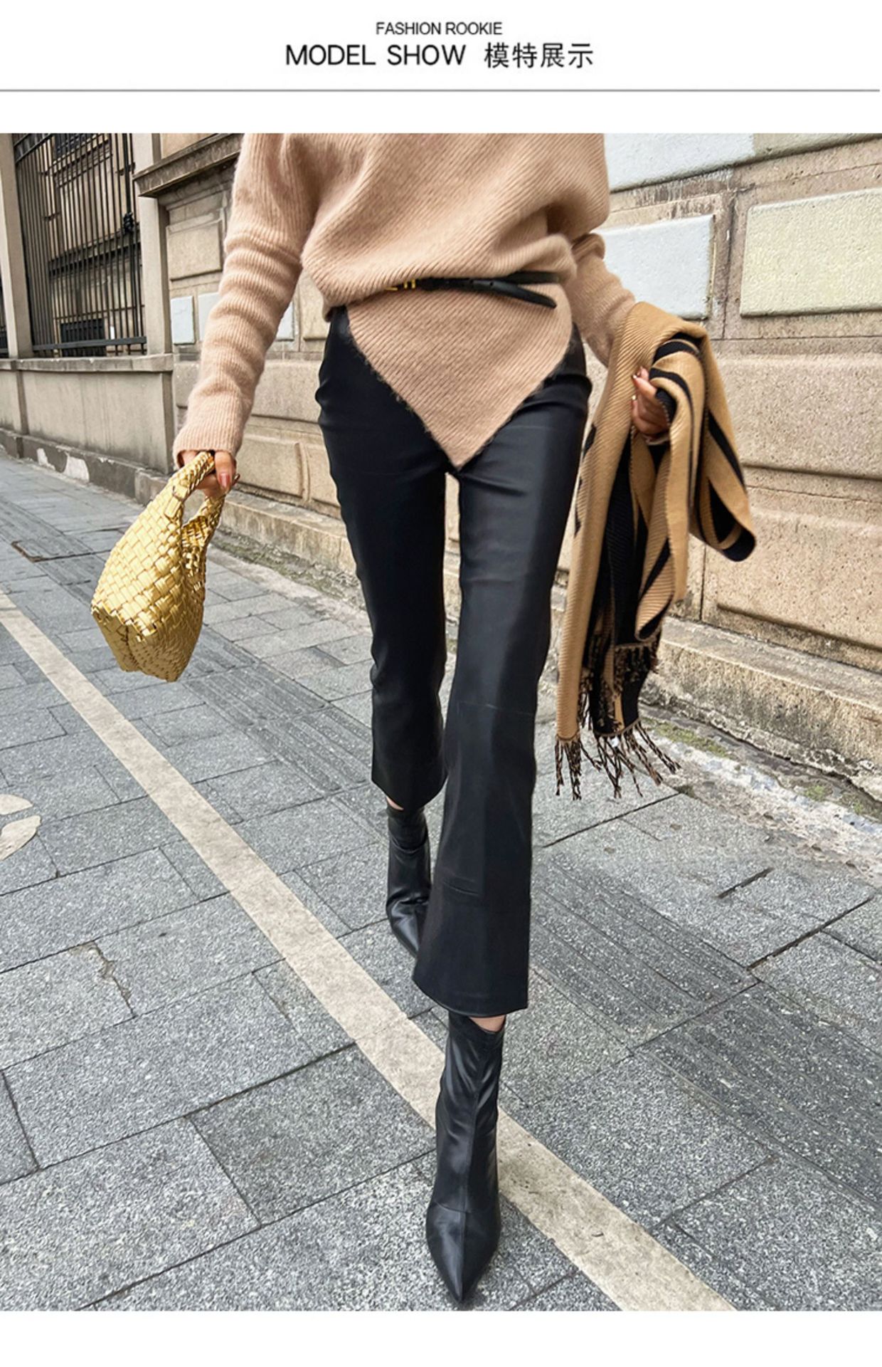Черные укороченные кожаные брюки для женщин, леггинсы, осенне-зимний стиль, европейские товары, популярные кожаные брюки 2025 года, высококачественные повседневные расклешенные брюки