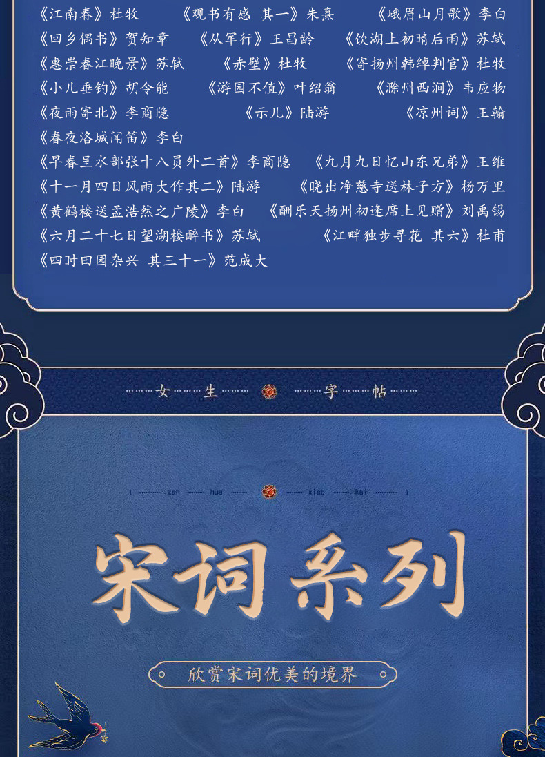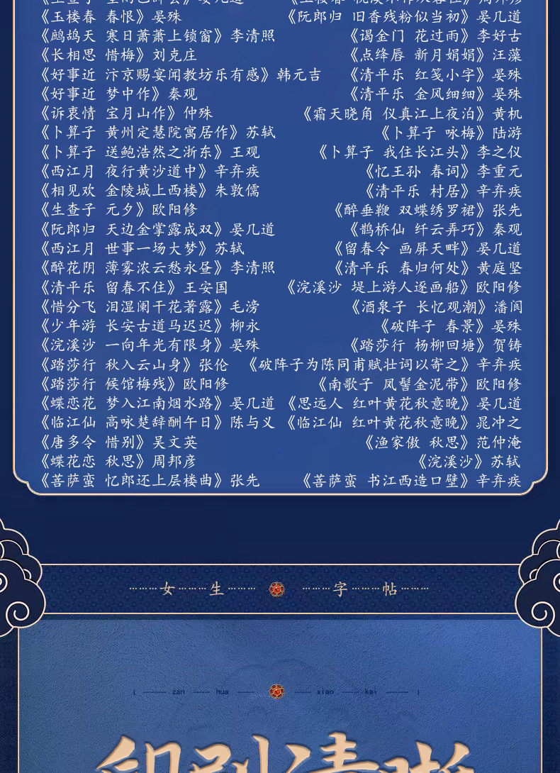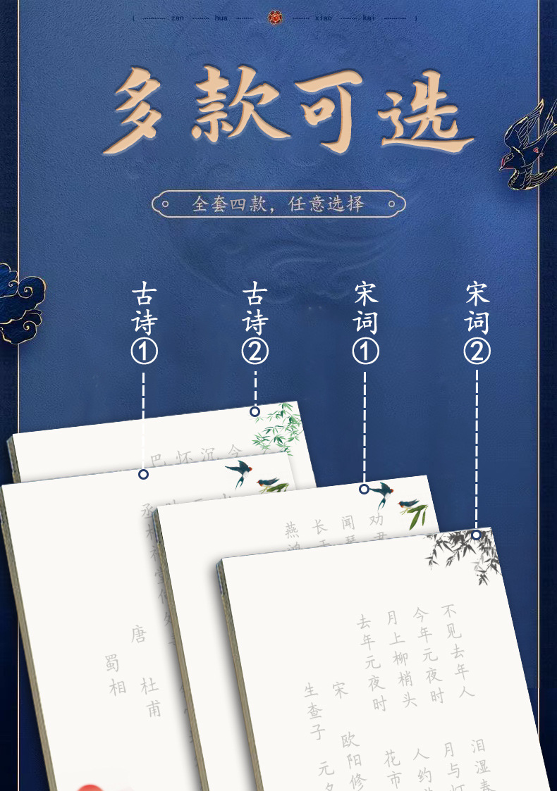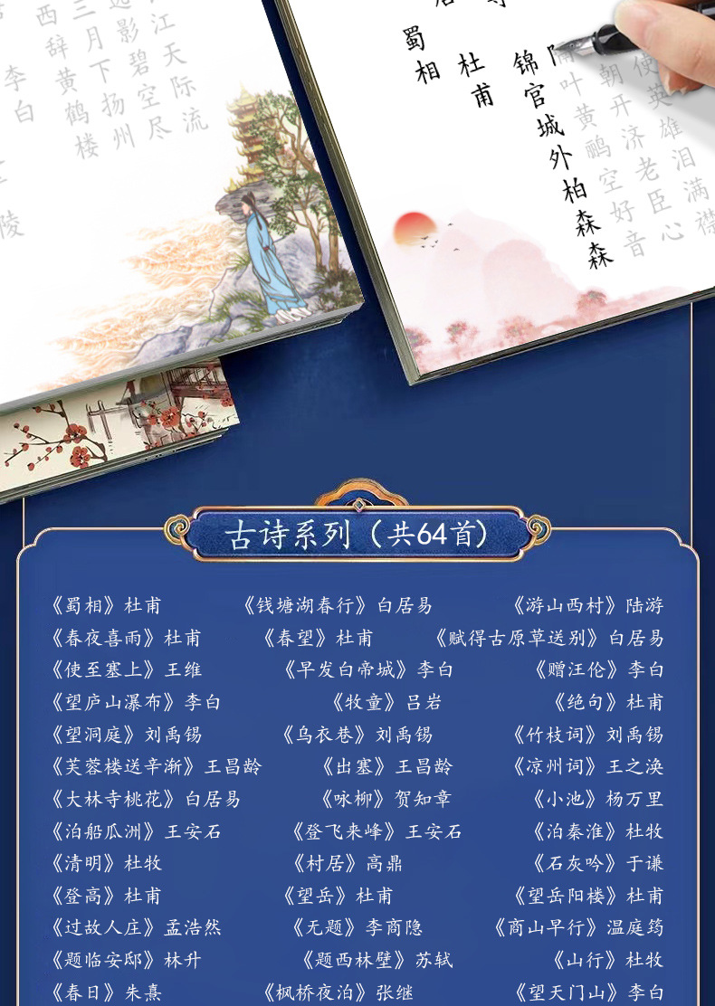 Поэзия Тан 1 [32 штуки в копии]; Поэзия Тан II [32 штуки в копии]; Песня Ки 1 [32 листа в экземпляре]; Песня Ки II [32 штуки в копии]