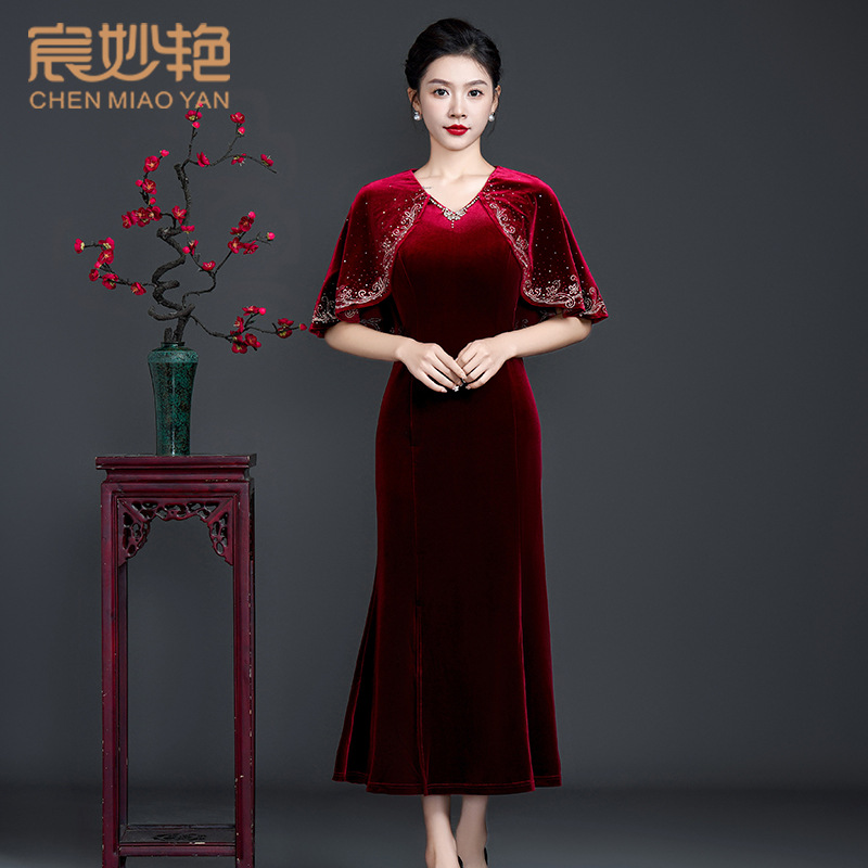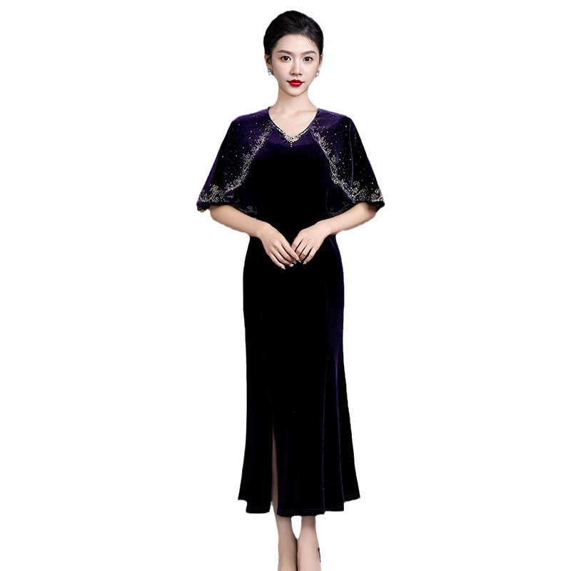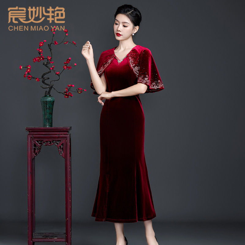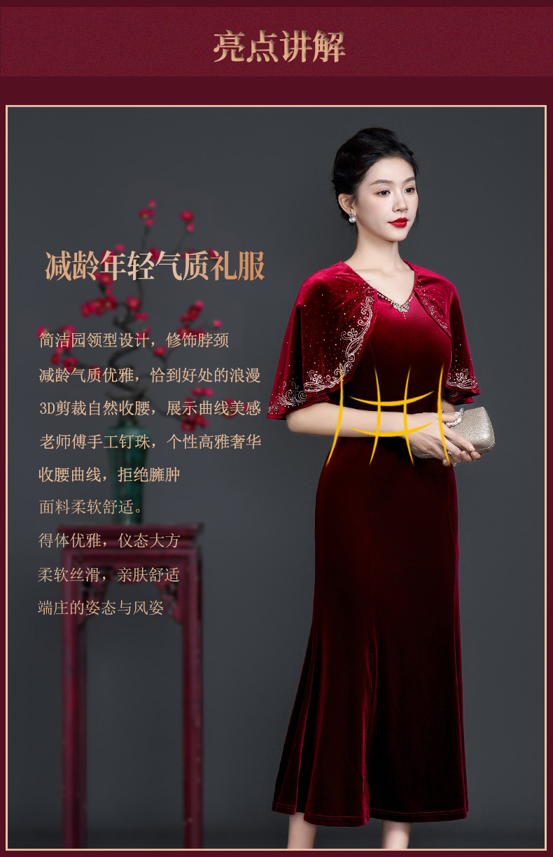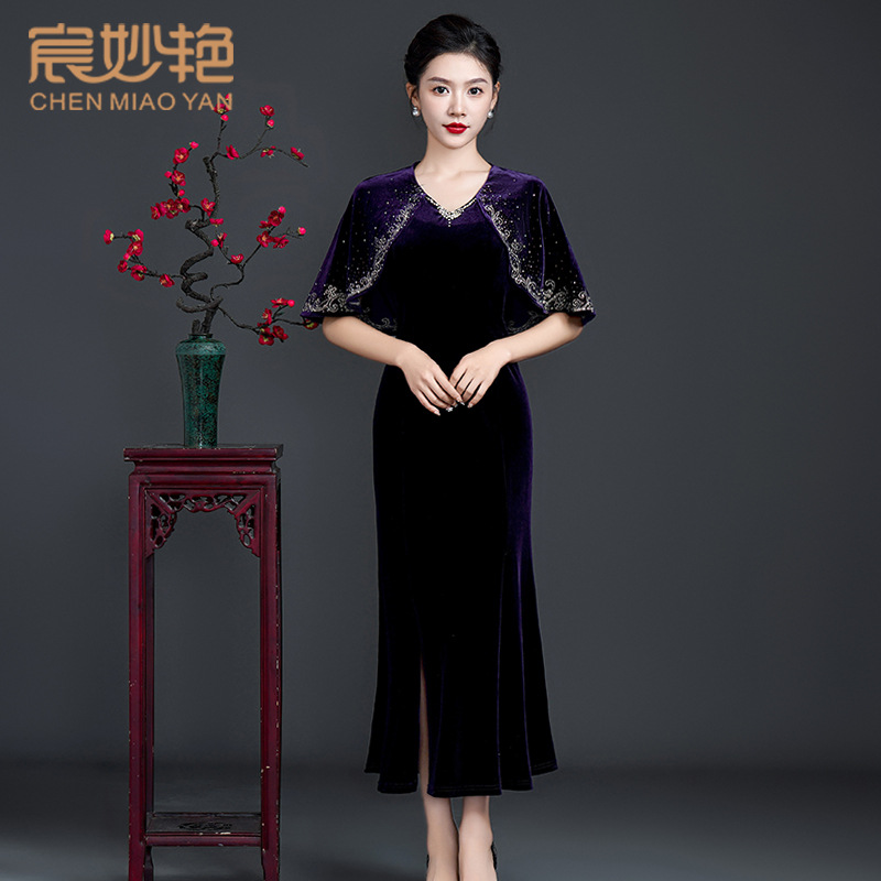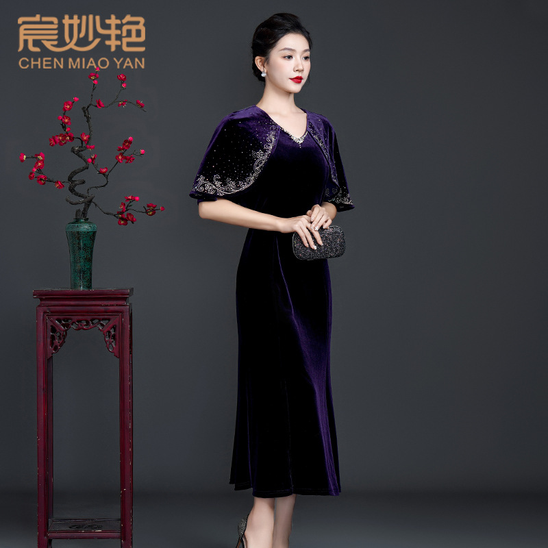 Среднее и старое женское платье 2024 новый весенний и осенний темперамент свекрови благородное золотое бархатное платье свадебное платье мама платье