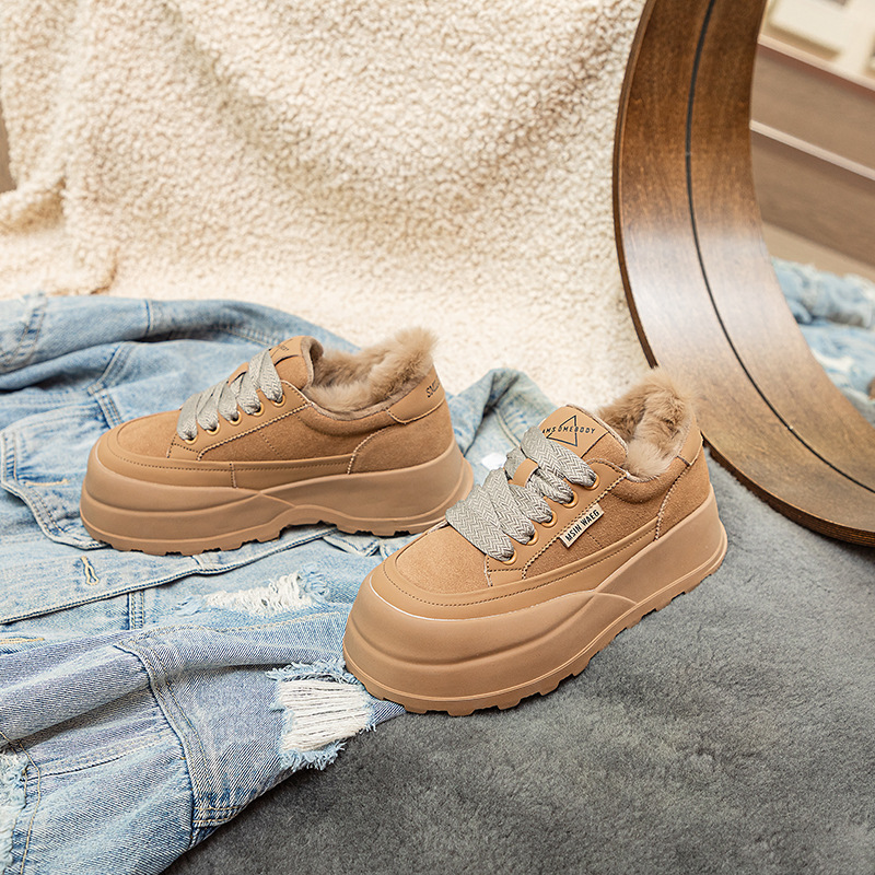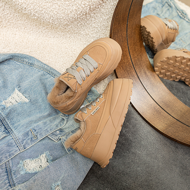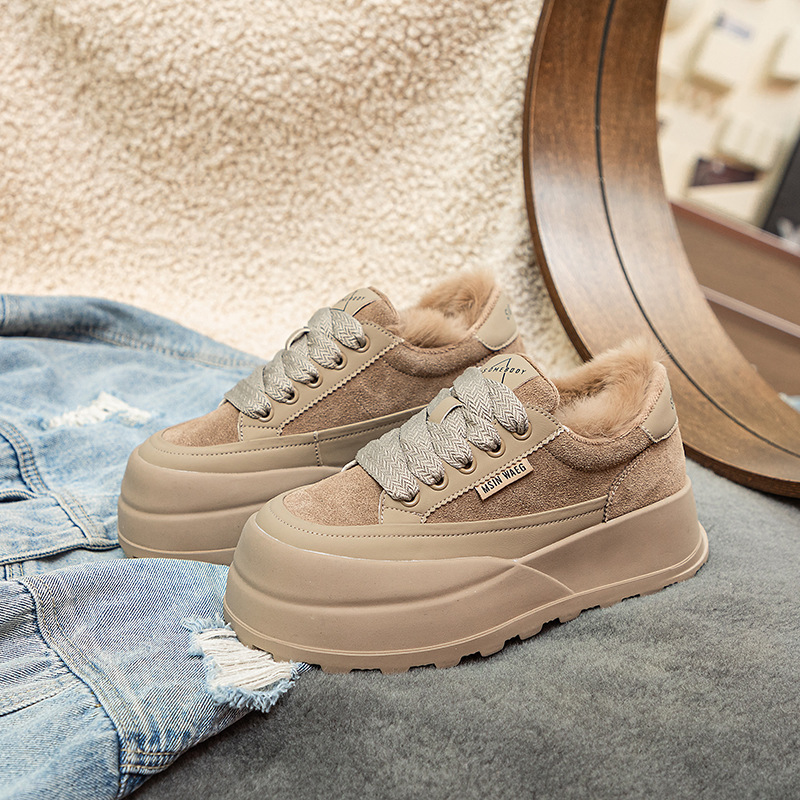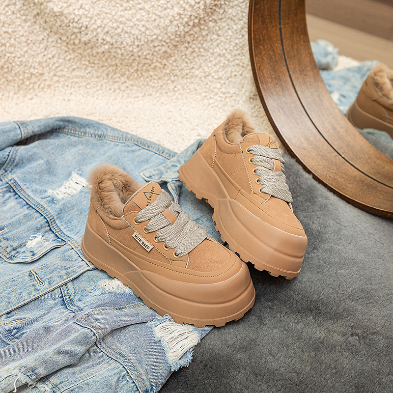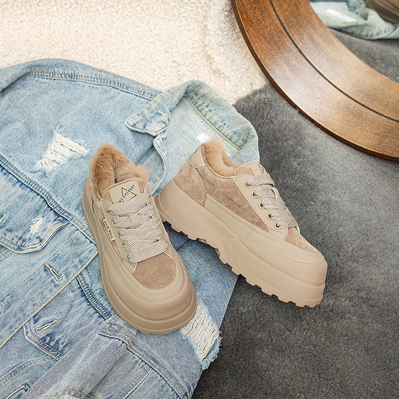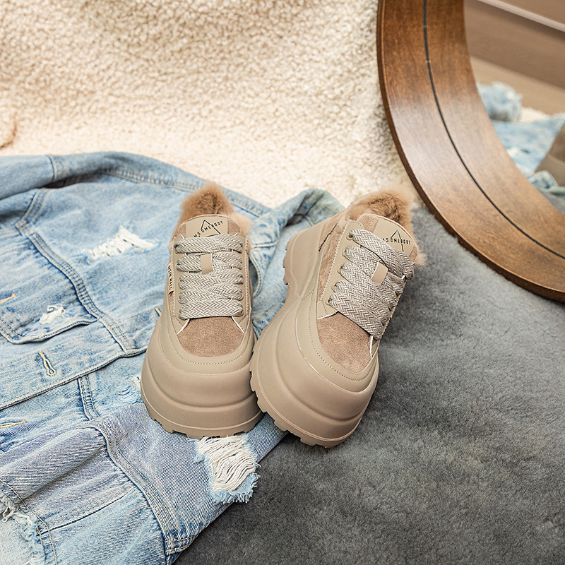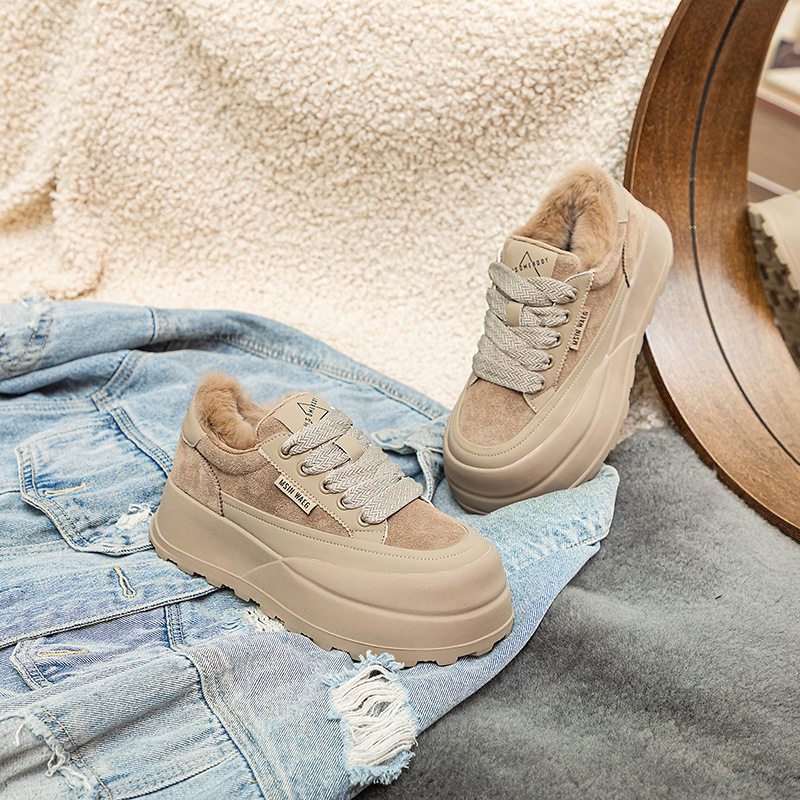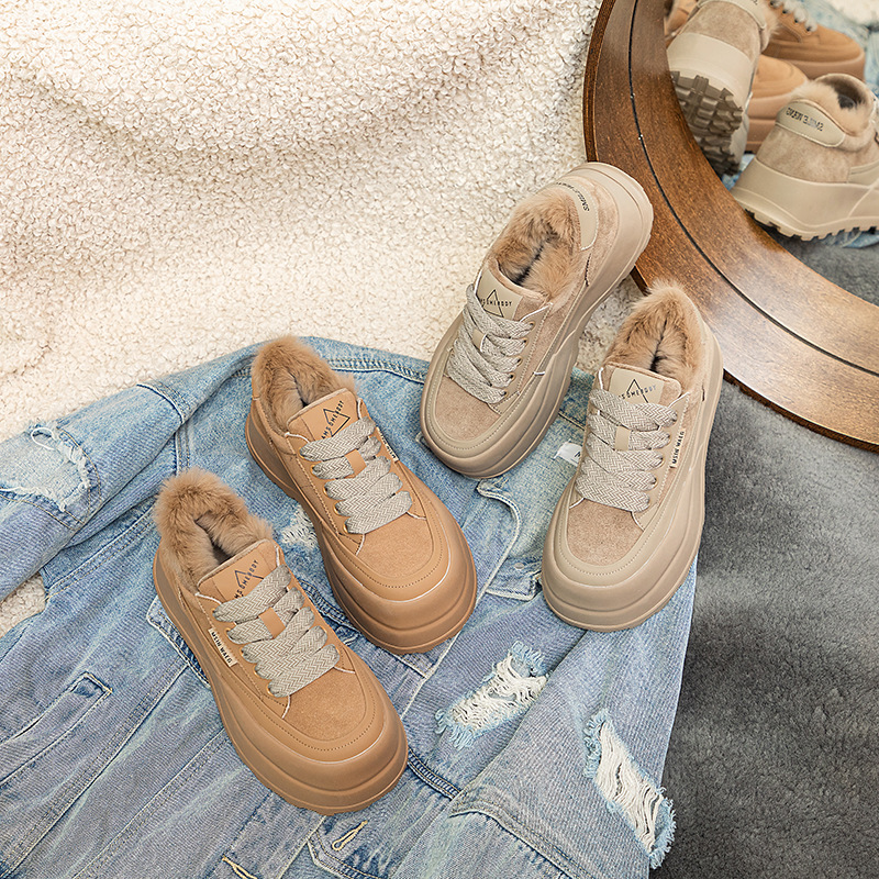 Туфли на толстой подошве на флисовой подкладке утолщенные 2023 Зимние новые туфли на платформе с большой головой Спортивные Повседневные туфли из кроличьего меха женская обувь на флисовой подкладке