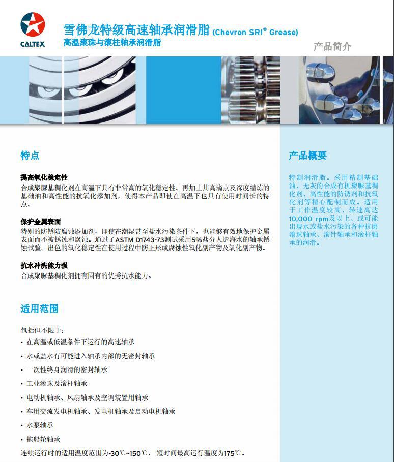 特制润滑脂。采用精制基础油、无灰的合成有机聚脲基稠化剂、高性能的防锈剂和抗氧化剂等精心配制而成。适用于工作温度较高、转速高达10,000 rpm及以上、或可能出现水或盐水污染的各种抗磨滚珠轴承、滚针轴承和滚柱轴承的润滑。