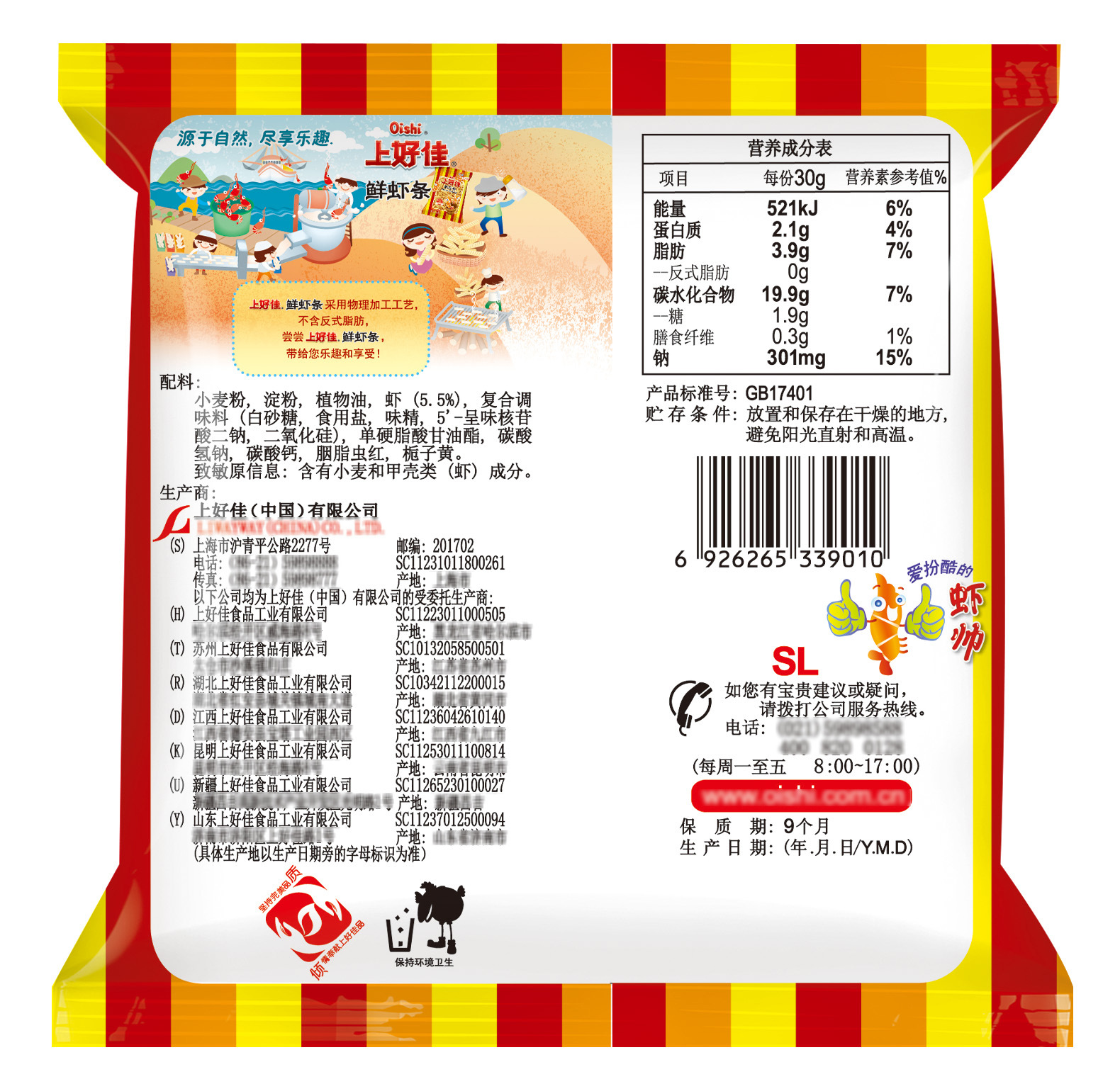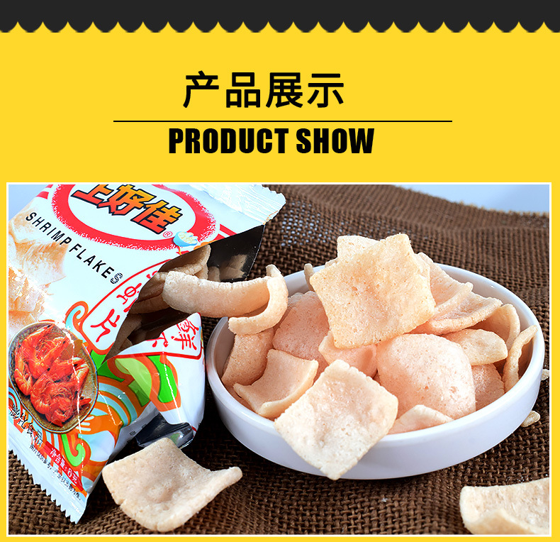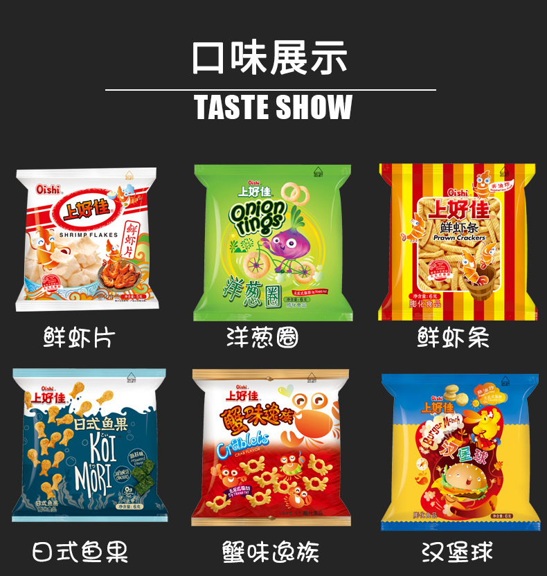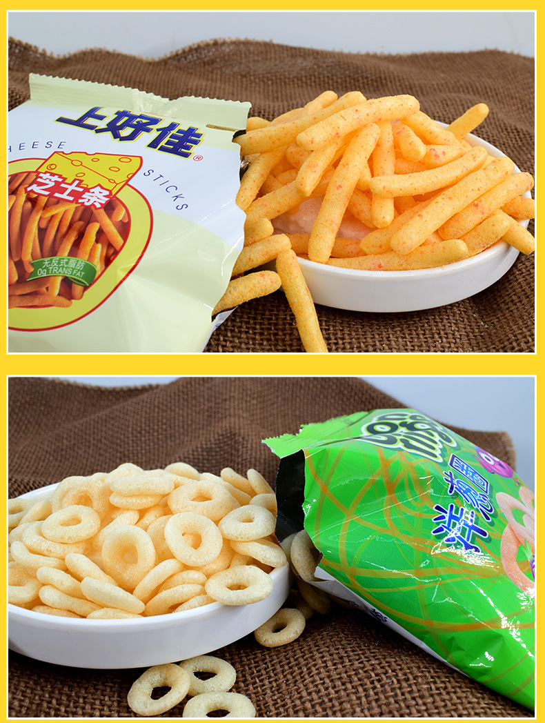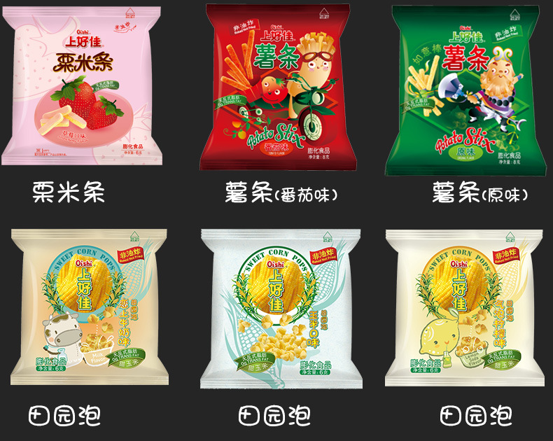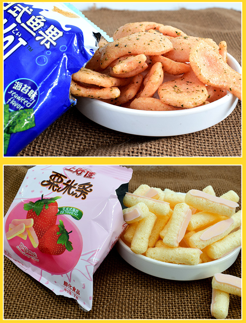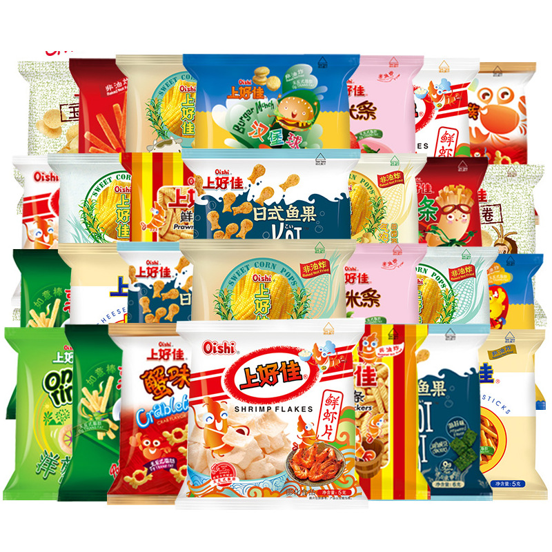 Картофель фри [оригинальный вкус] 8г; Картофель фри [с томатным вкусом] 8г; Луковые кольца 6г; Свежие ломтики креветок 5г; Свежие сухарики из креветок 6г; Крабовый вкус Yizu 5г; Сырные палочки 5г; Tianyuan Bubble [кукурузный вкус] 6 г; Шарики для гамбургеров 6г; Тако 6г; Японские рыбные фрукты [вкус морских водорослей] 6г; Кукурузные палочки [клубничный вкус] 6г; Хрустящие картофельные чипсы 6г; Пасторальные пузырьки [вкус лимона пузырьков] 6 г; Пасторальные пузырьки [Вкус сердечного масла] 6 г; ломтики креветок [вкус кукурузного перца] 5г
