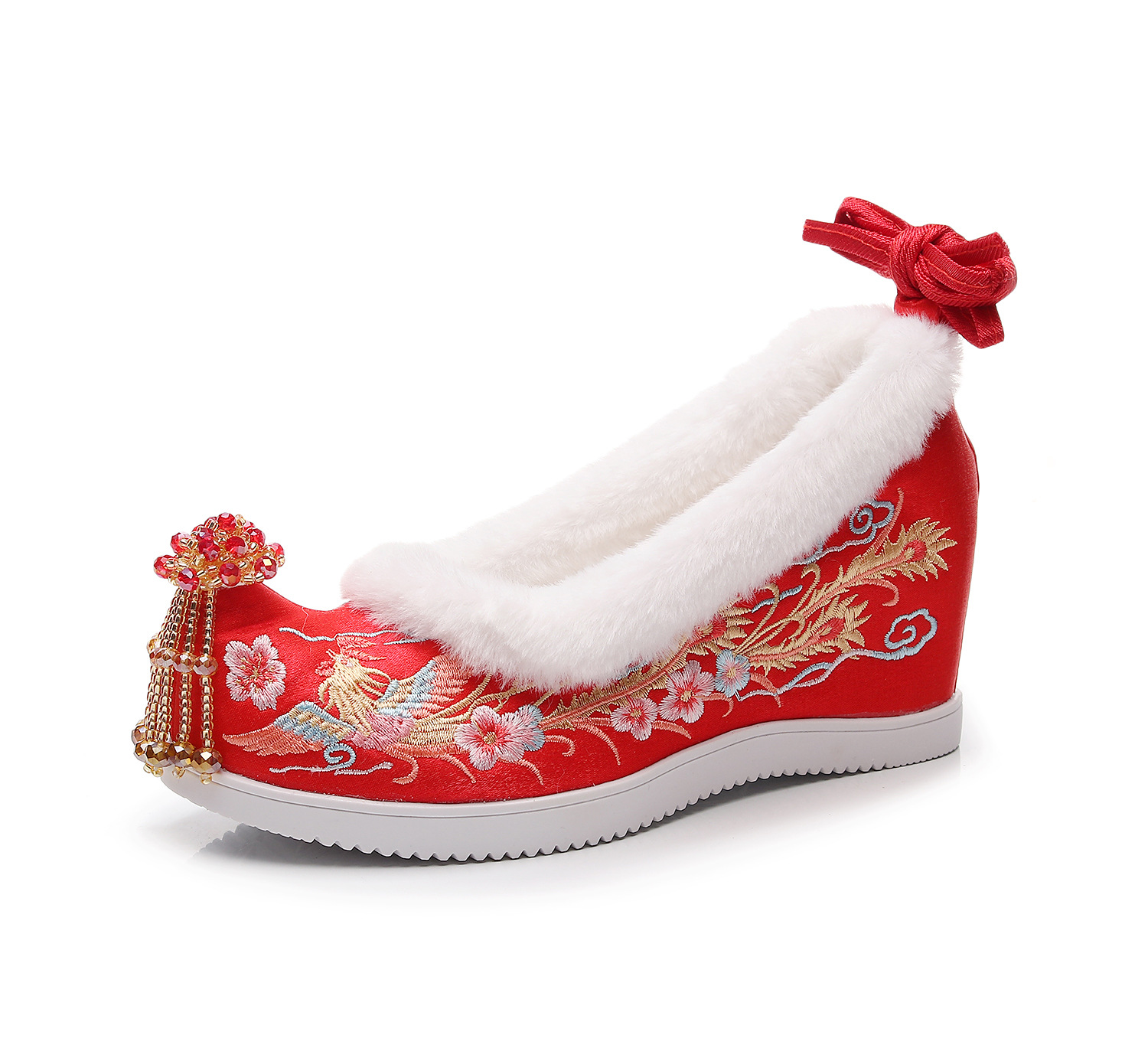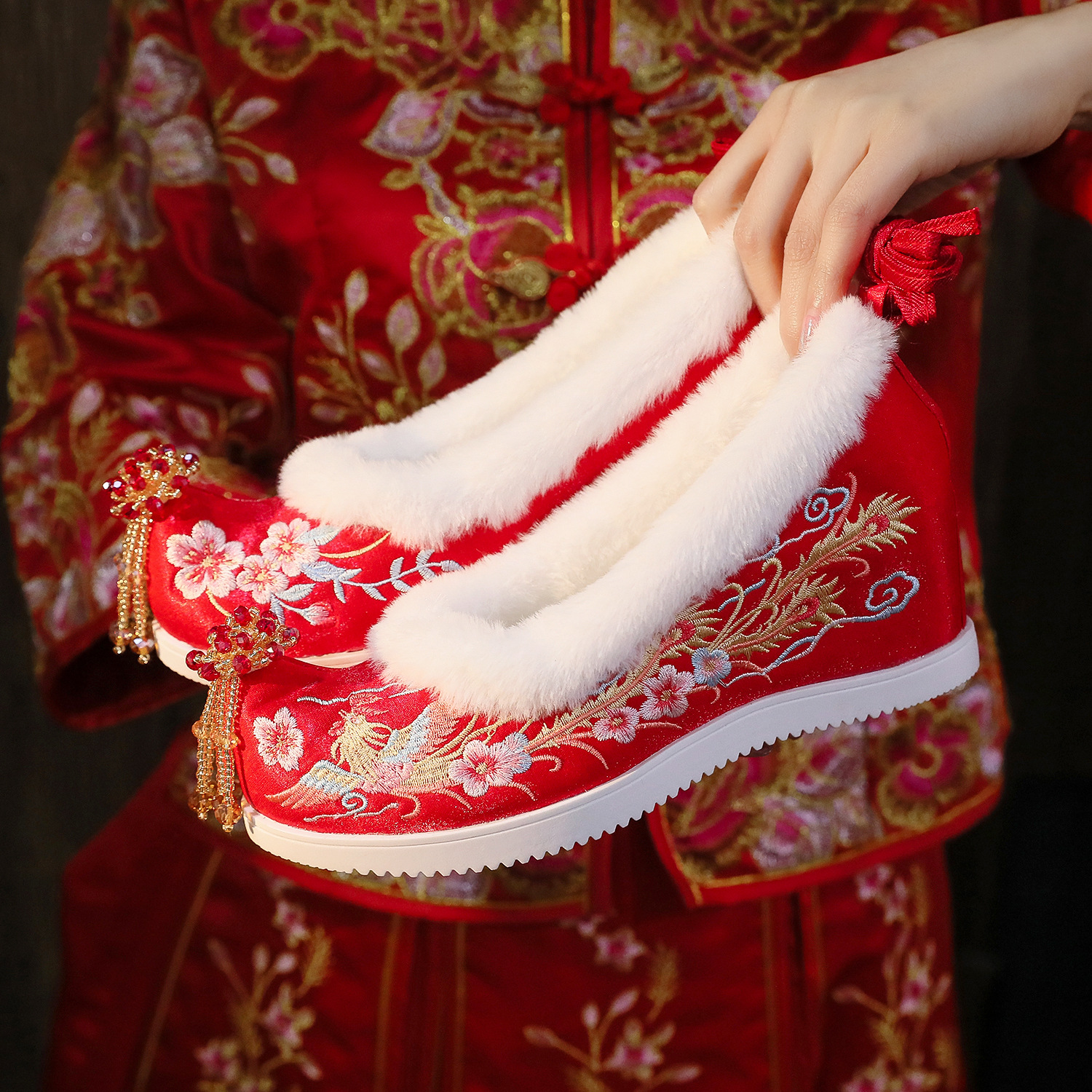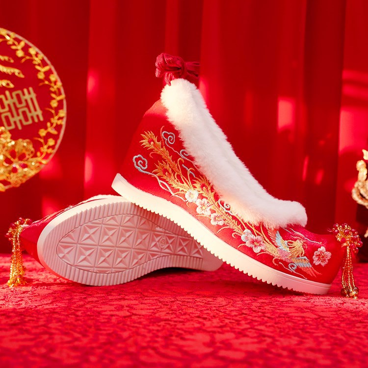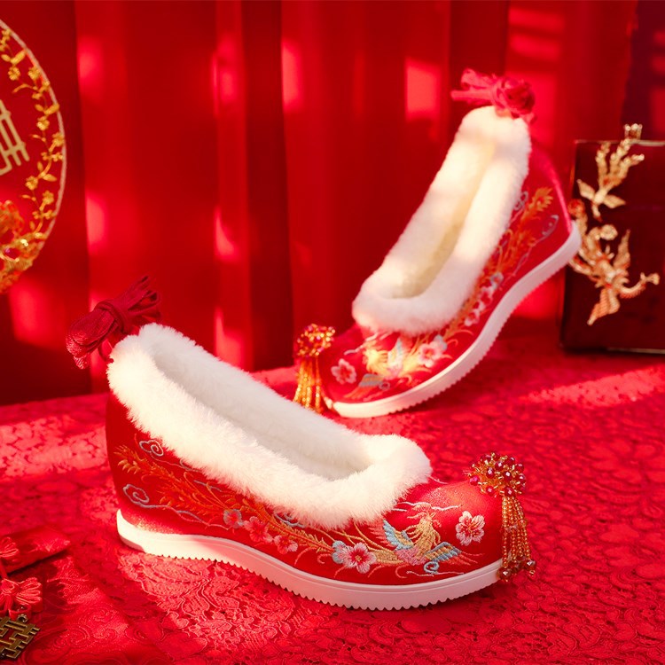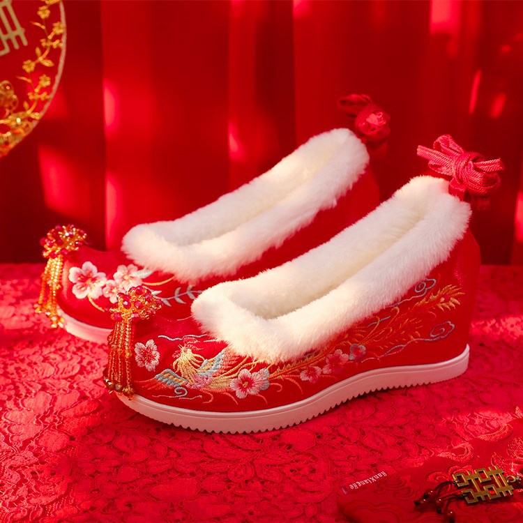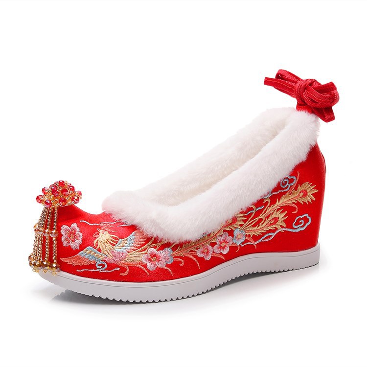 (Xifeng 6- см) зимние китайские свадебные туфли Xiuhe, свадебные туфли на флисовой подкладке с вышивкой и кисточками, туфли увеличенной высоты в древнем стиле династии Хань