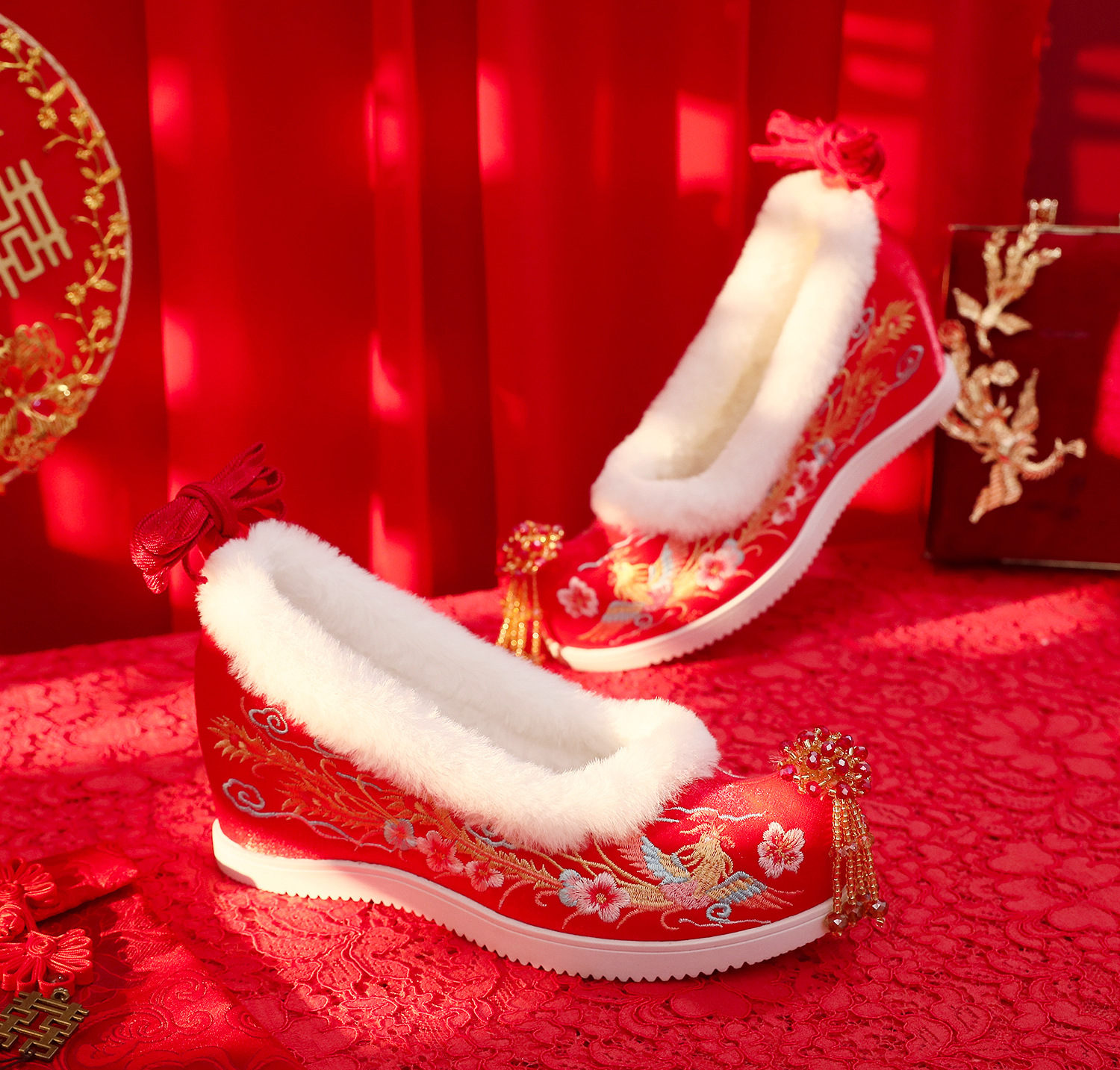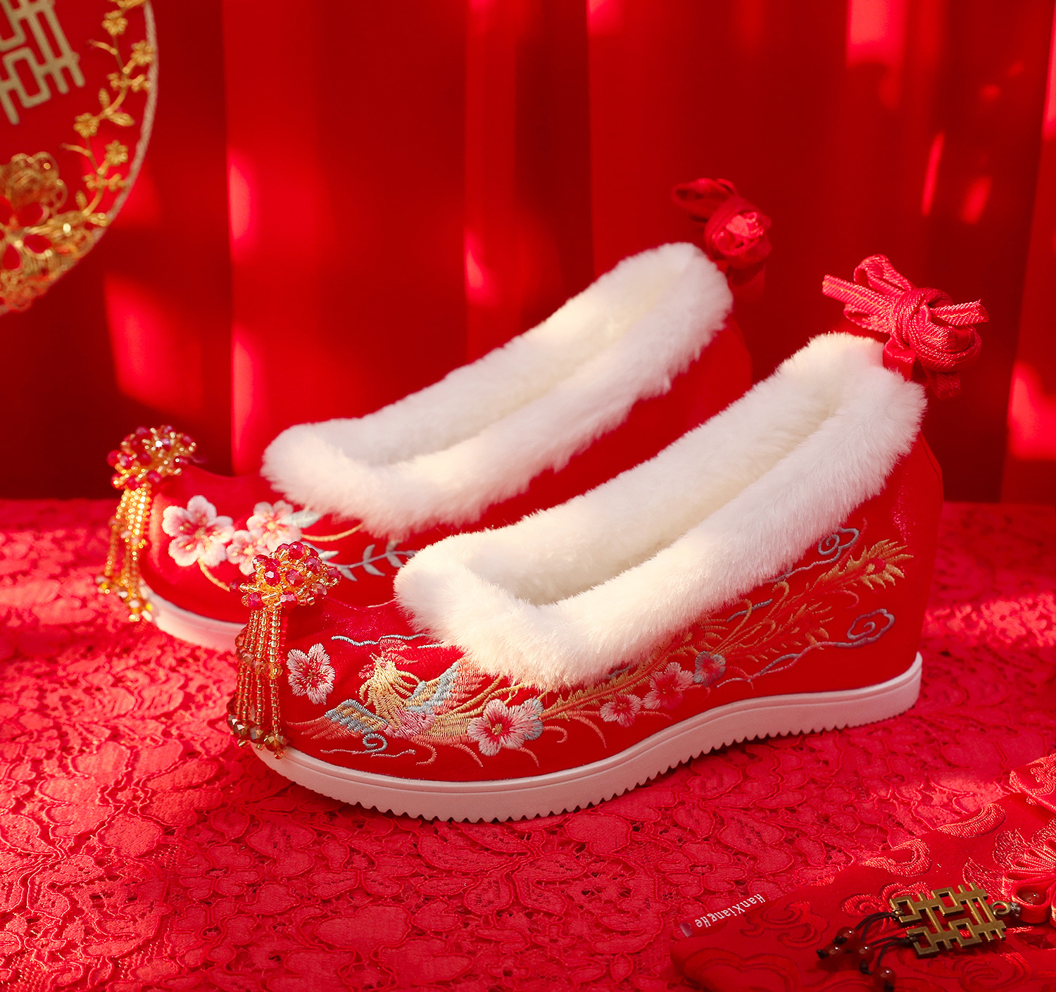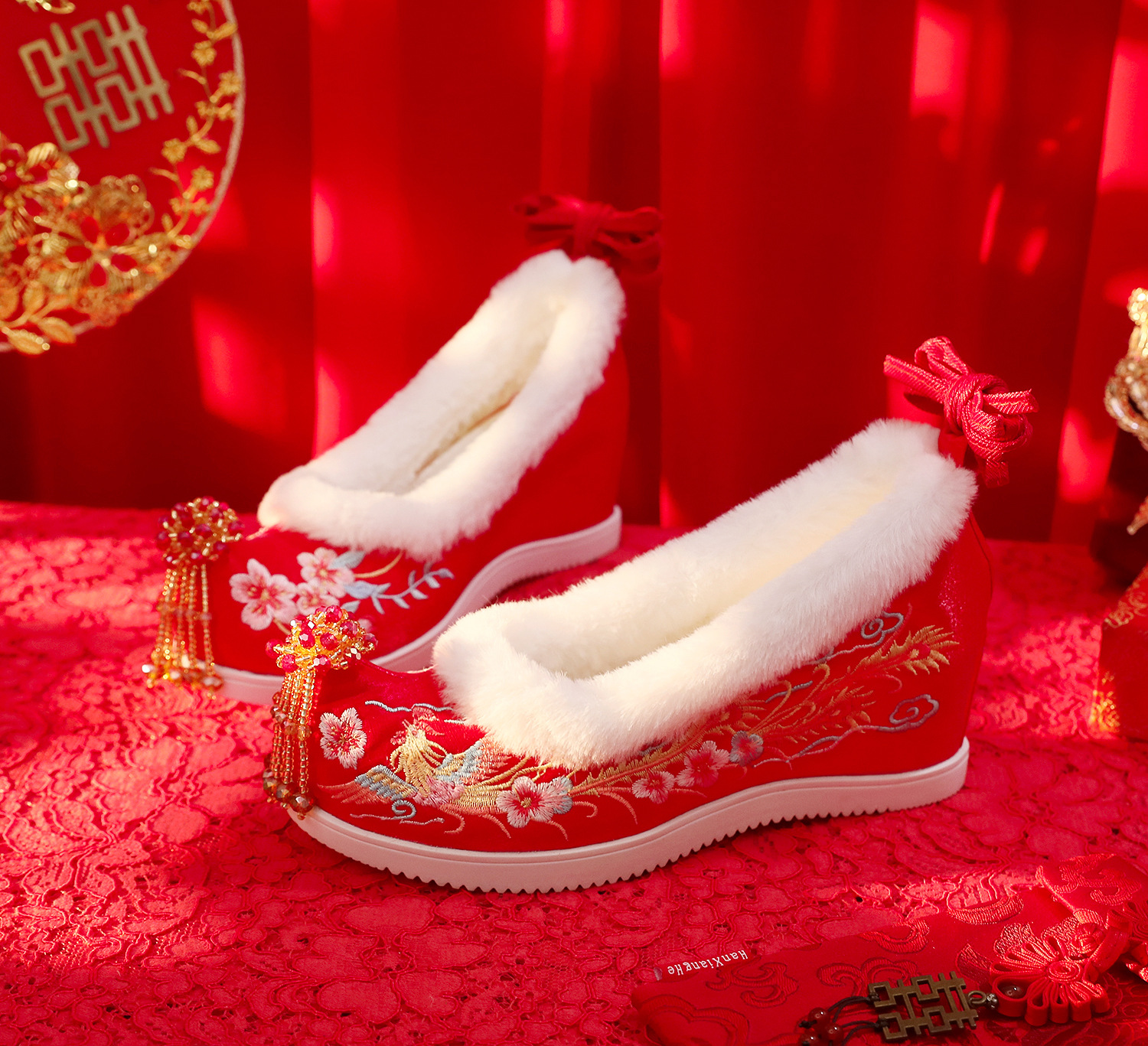 (Xifeng 6- см) зимние китайские свадебные туфли Xiuhe, свадебные туфли на флисовой подкладке с вышивкой и кисточками, туфли увеличенной высоты в древнем стиле династии Хань