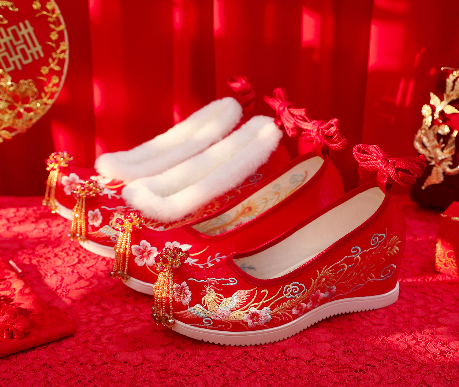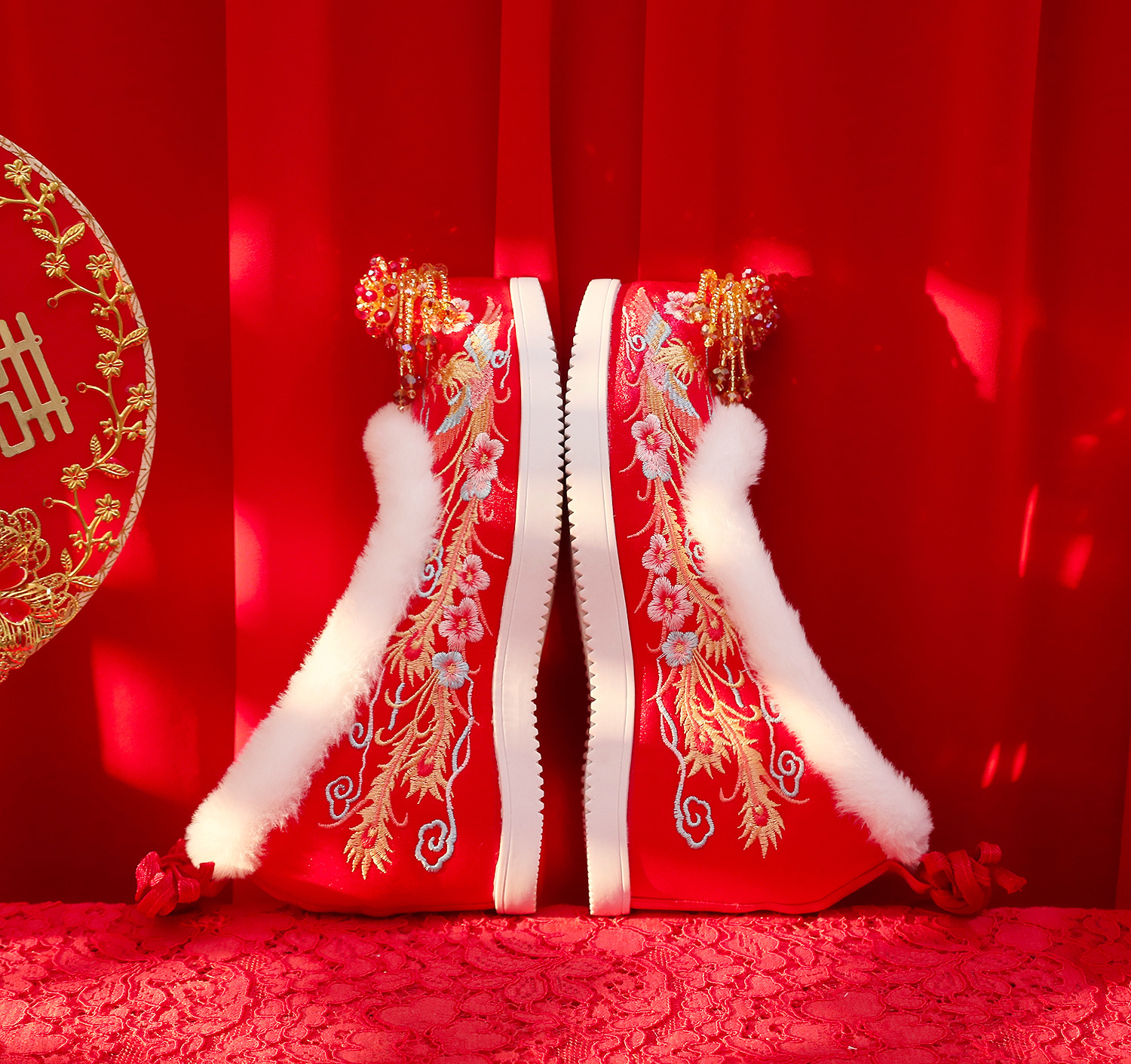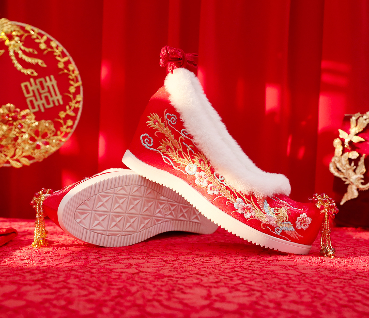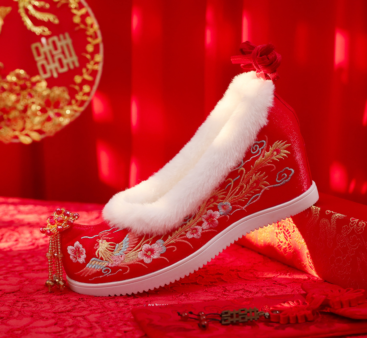 (Xifeng 6- см) зимние китайские свадебные туфли Xiuhe, свадебные туфли на флисовой подкладке с вышивкой и кисточками, туфли увеличенной высоты в древнем стиле династии Хань