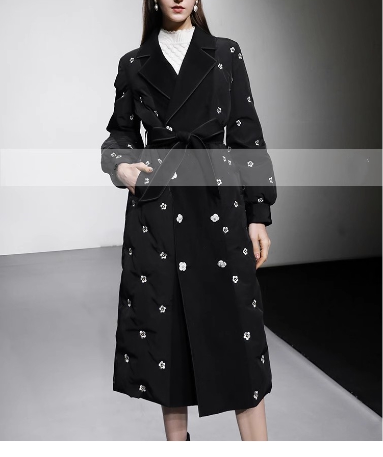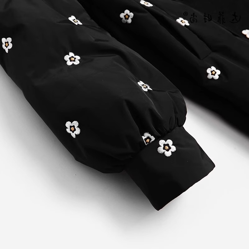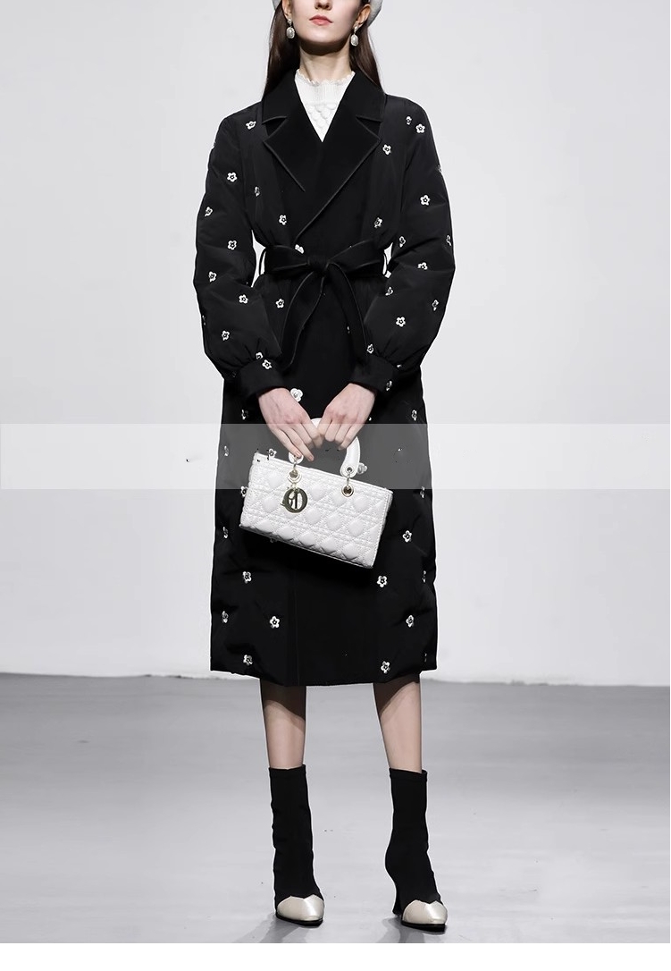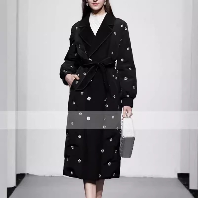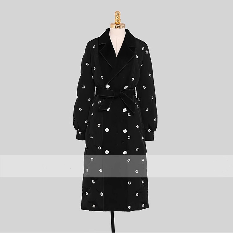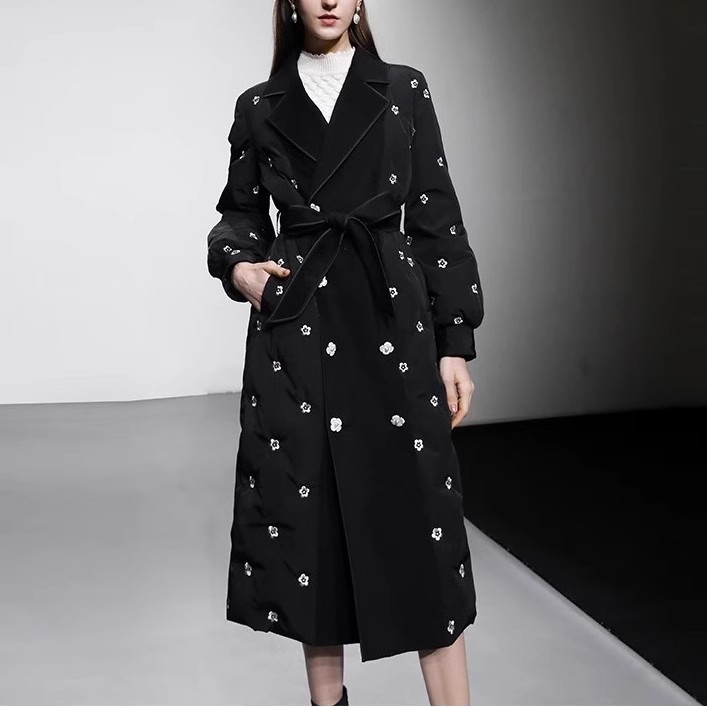 Зимний новый темперамент модный двухсторонний шитый средний длинный черный вышитый белый утка пуховик куртка женский