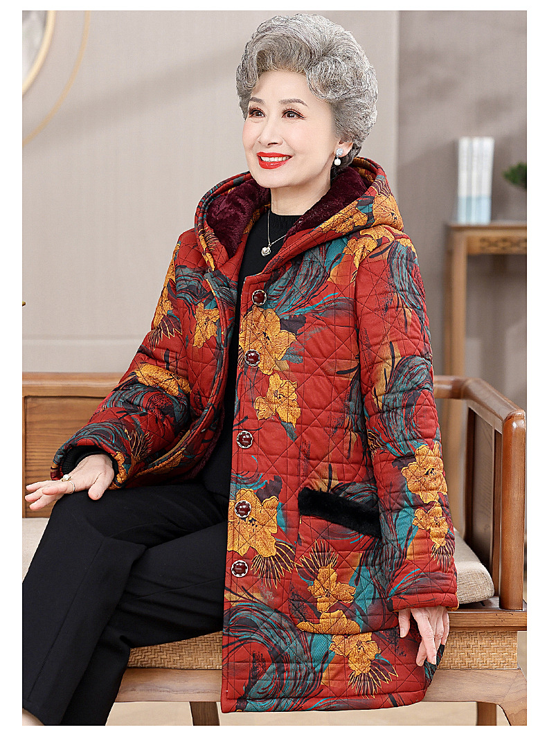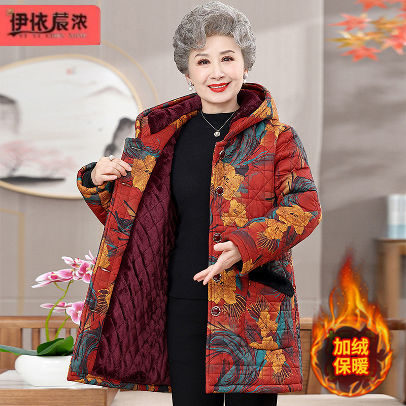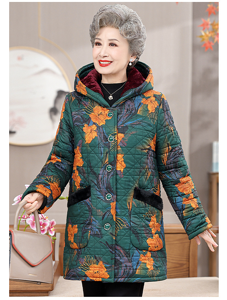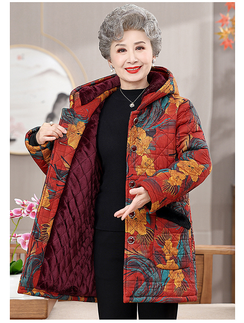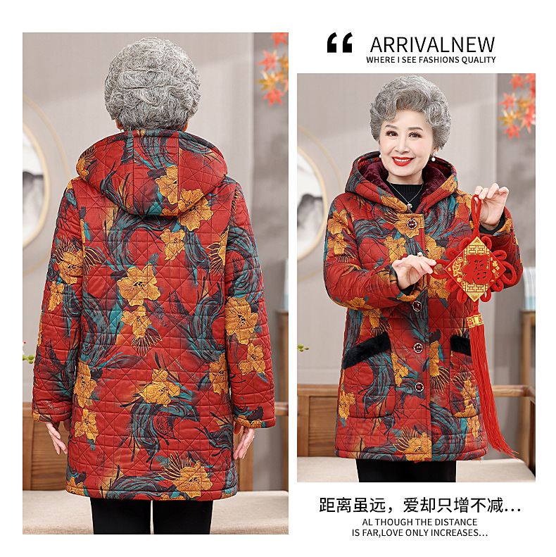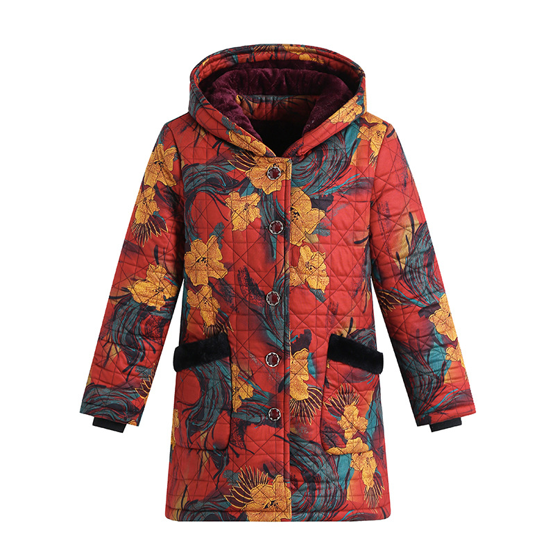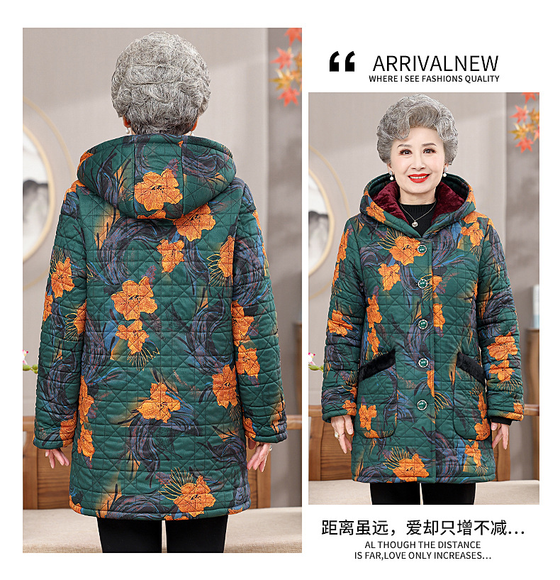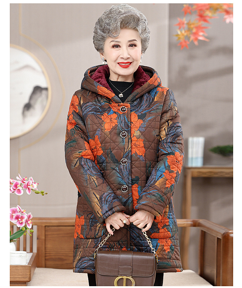 Зимняя одежда для бабушек на флисовой подкладке, пальто с хлопковой подкладкой и капюшоном, Однорядная пуговица, для женщин среднего и пожилого возраста, теща, куртка с хлопковой подкладкой, большой цветок, оптовая продажа, средней длины