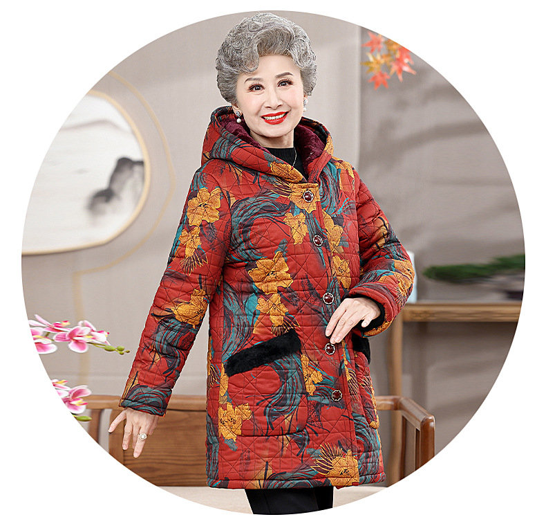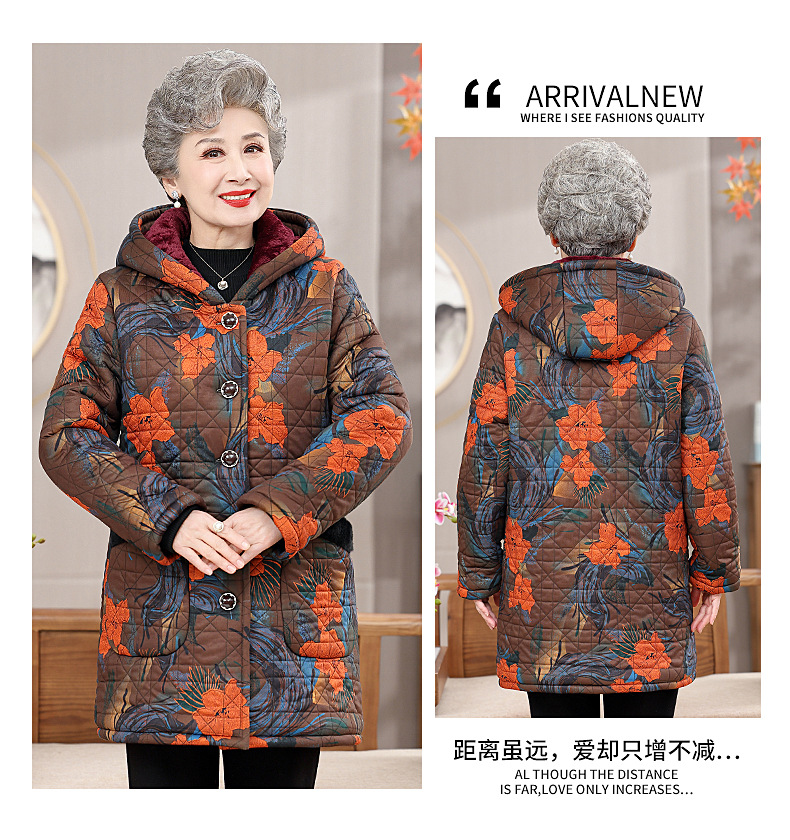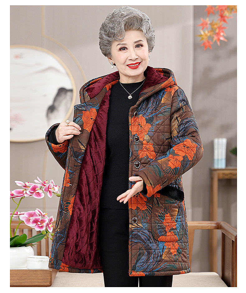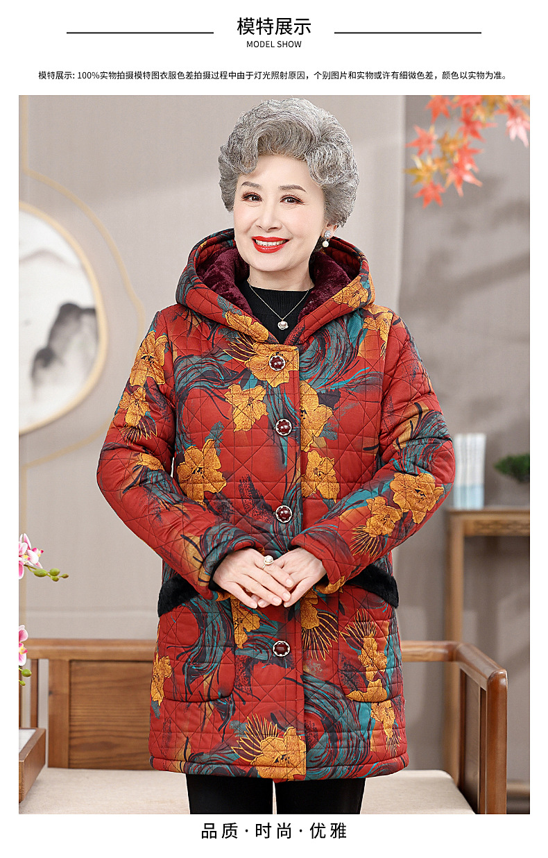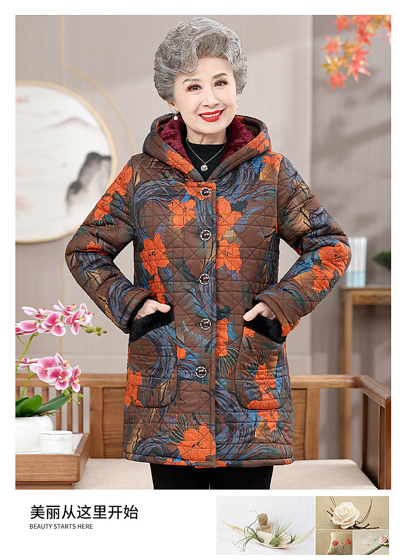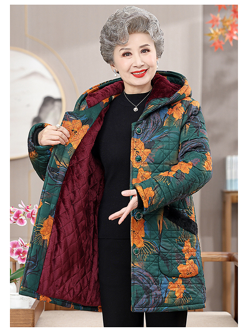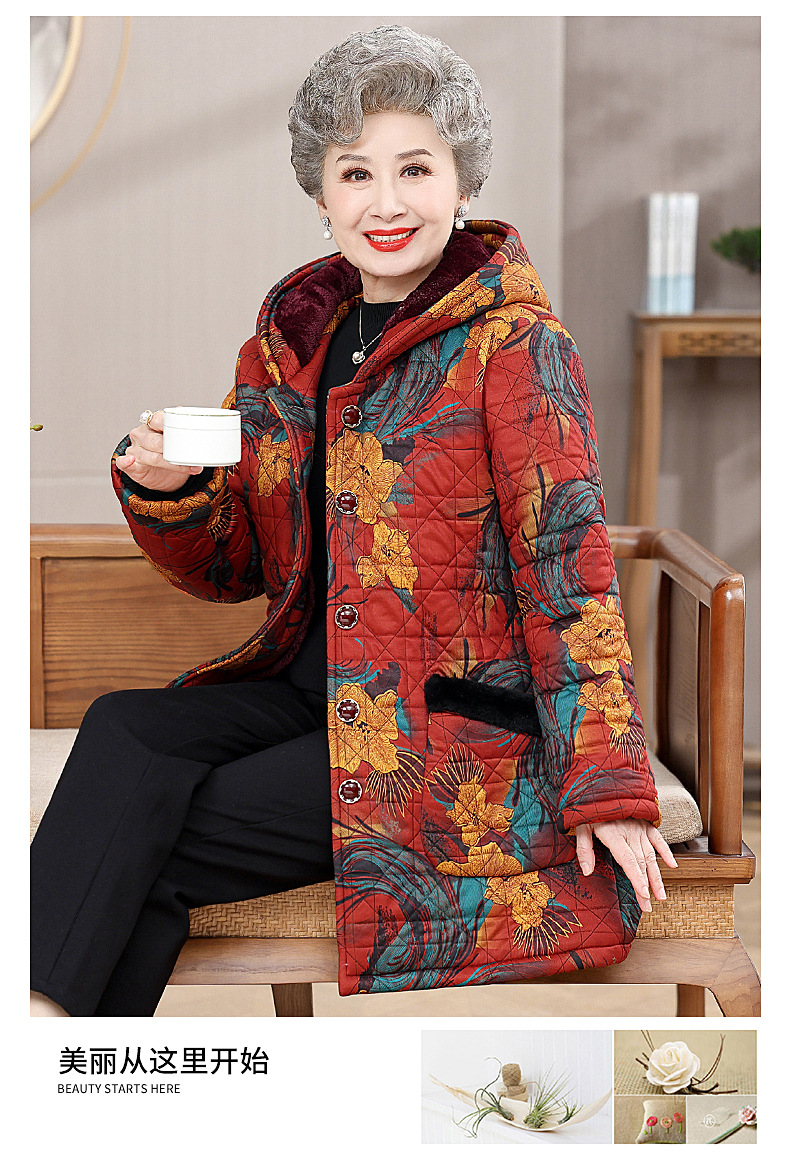 Зимняя одежда для бабушек на флисовой подкладке, пальто с хлопковой подкладкой и капюшоном, Однорядная пуговица, для женщин среднего и пожилого возраста, теща, куртка с хлопковой подкладкой, большой цветок, оптовая продажа, средней длины