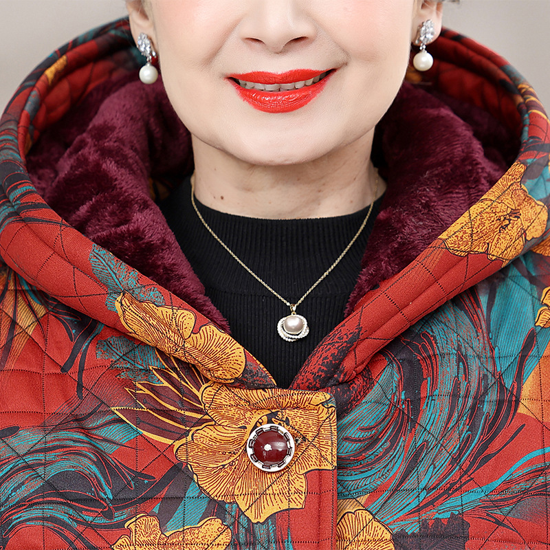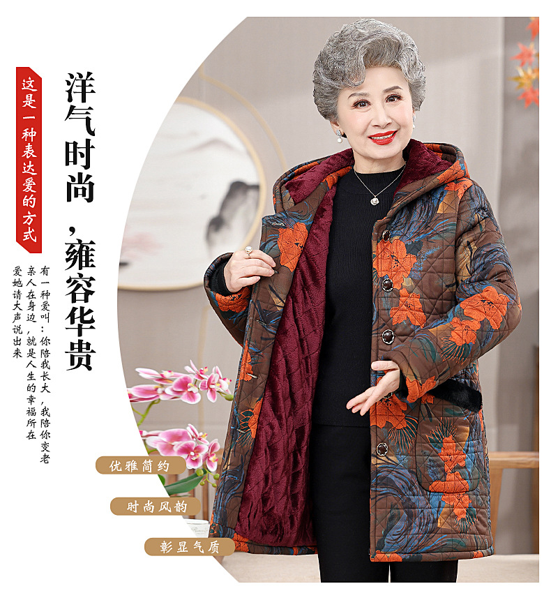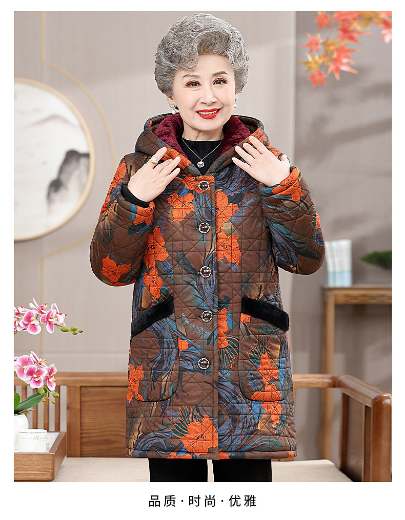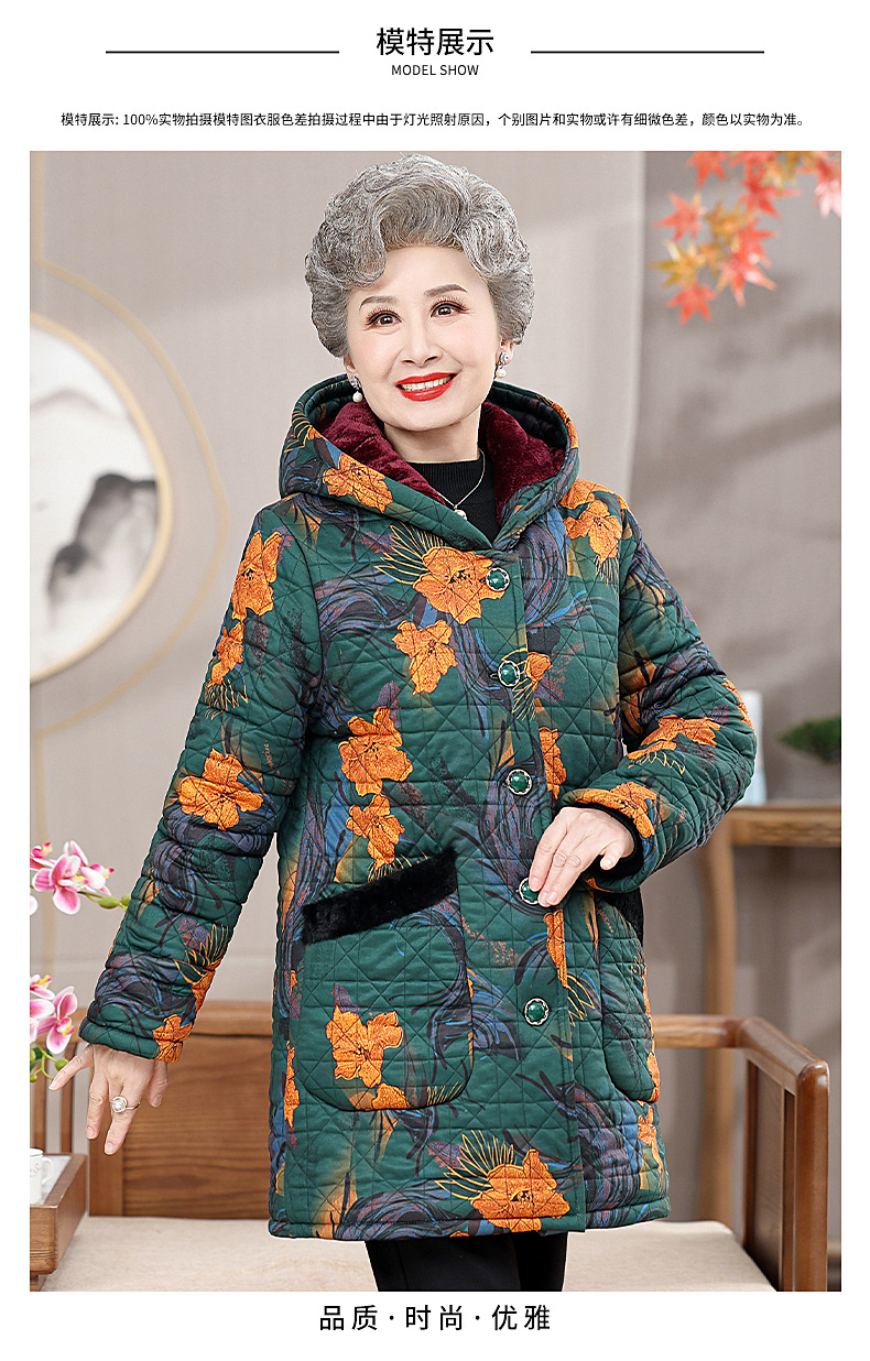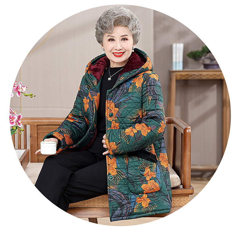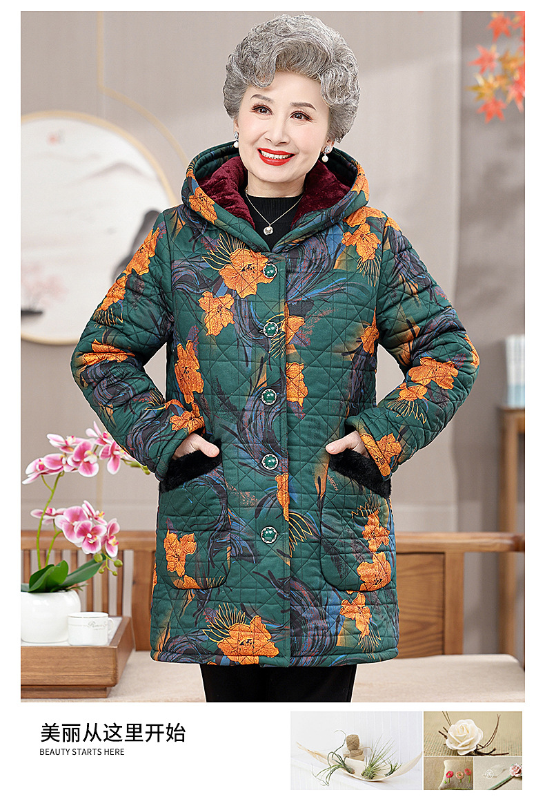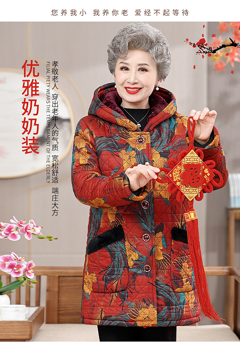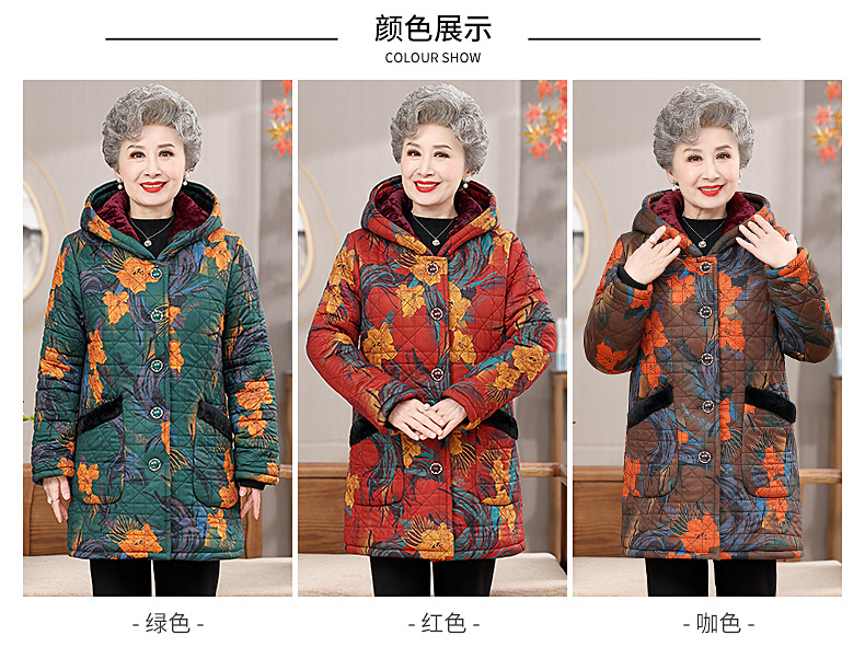 Зимняя одежда для бабушек на флисовой подкладке, пальто с хлопковой подкладкой и капюшоном, Однорядная пуговица, для женщин среднего и пожилого возраста, теща, куртка с хлопковой подкладкой, большой цветок, оптовая продажа, средней длины