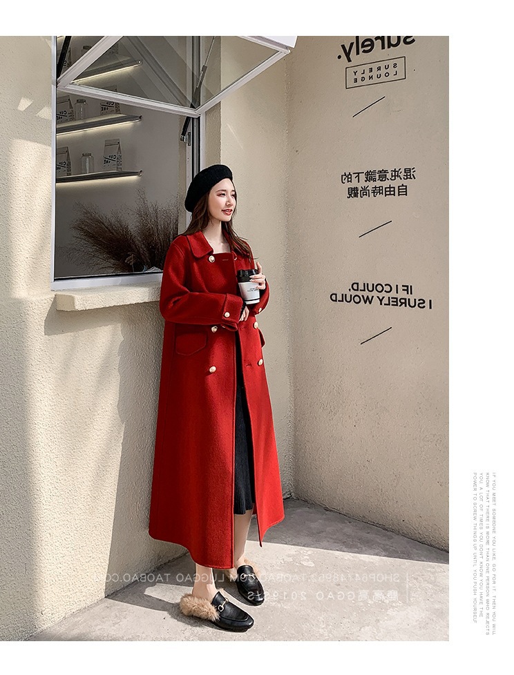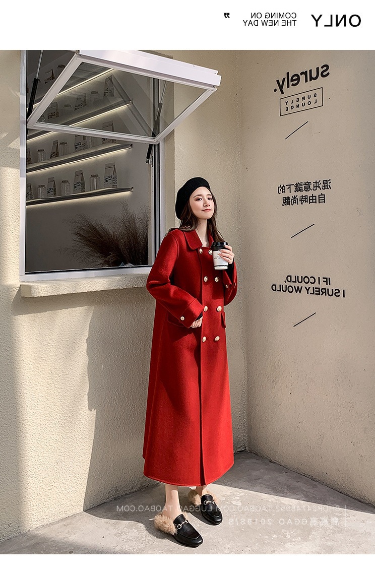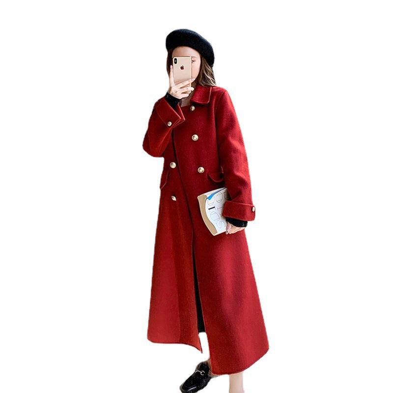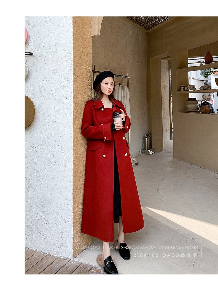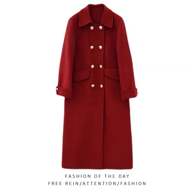 Двустороннее шерстяное пальто для женщин на осень-зиму 2025, длинное двубортное прямого кроя, элегантное, омолаживающее, красное шерстяное пальто