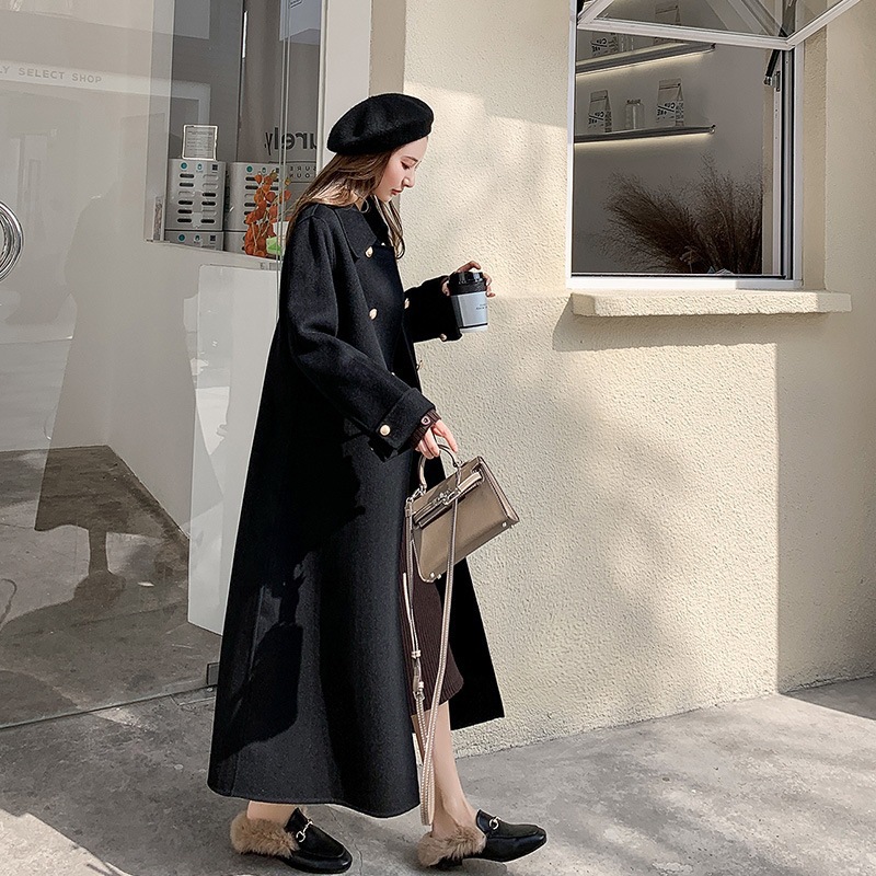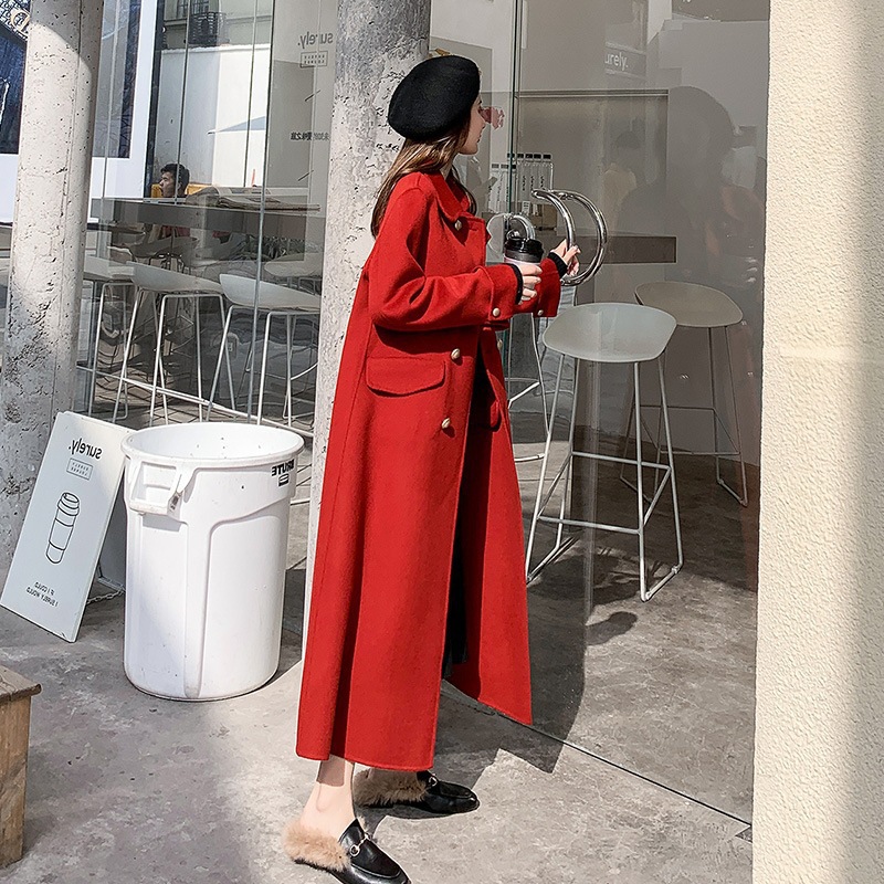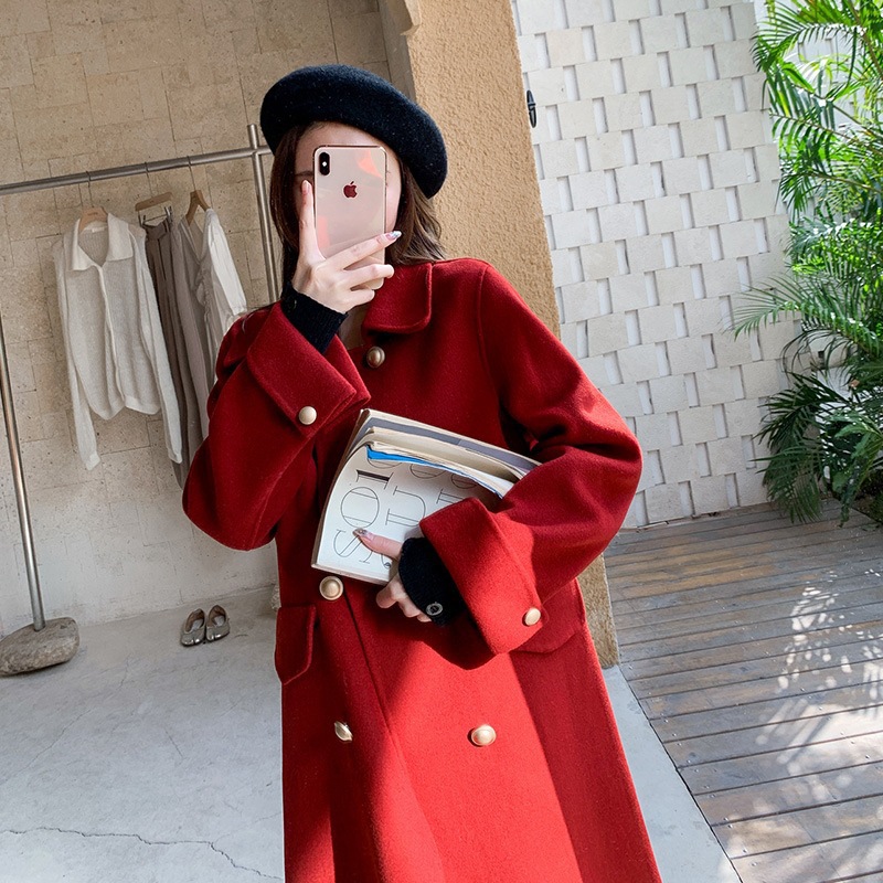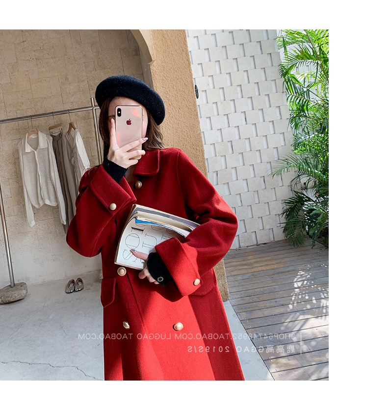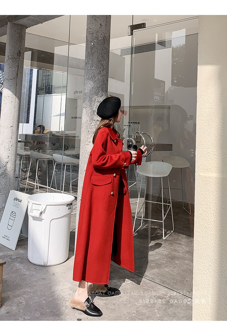 Двустороннее шерстяное пальто для женщин на осень-зиму 2025, длинное двубортное прямого кроя, элегантное, омолаживающее, красное шерстяное пальто