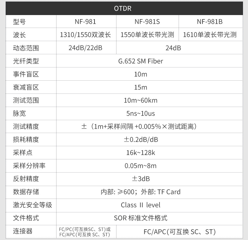 NF-981 1310/1550 двойная длина волны без оптического измерения; NF-981S Оптическое измерение в одной длине волны 1550; NF-981B Оптическое измерение в одной длине волны 1610