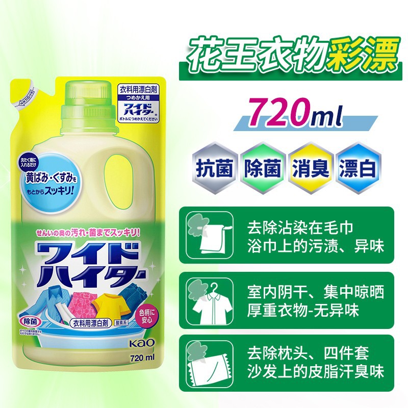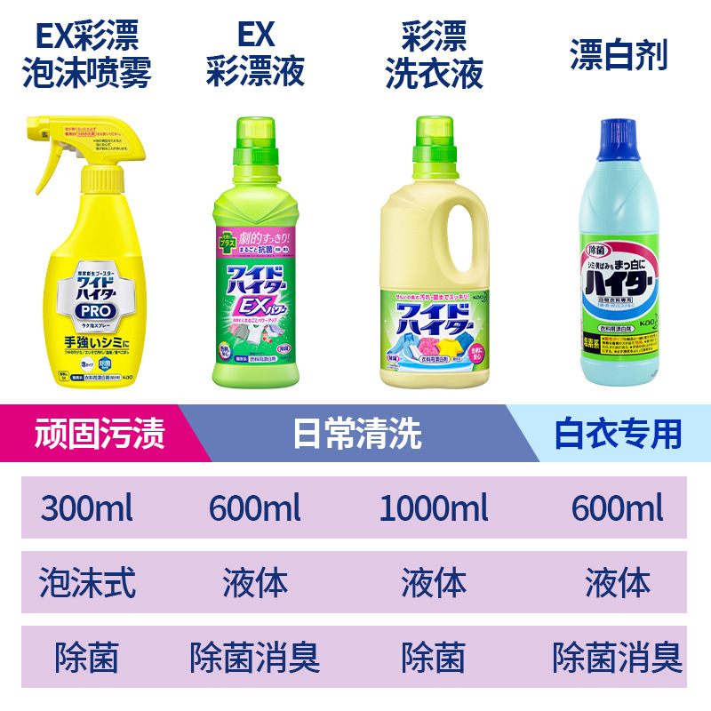 Kao Bleach Cleaner (для кухни) 400мл; Kao Bleach Cleaner (для кухни) Сменный 400мл; Kao Bleach (для кухни) 600мл; EX сильный цветной отбеливатель 560 мл; EX сменный отбеливатель для насыщенных цветов, 450 мл; Отбеливатель в пене 300мл; Замена отбеливателя в пене 300мл; Отбеливатель цвета 1000мл; [Сумка] Антибактериальное и антибактериальное отбеливание цвета 720 мл; [В бутылках] 930 мл; [Замена] 820 мл; [В бутылках] Антибактериальный резервуар для стиральной машины с защитой от плесени 560 мл; [Замена] Антибактериальный резервуар для стиральной машины с защитой от плесени 450 мл; [В бутылках] Сильное разложение и стойкие пятна, 530 г.; [Замена] Мощно разлагает стойкие пятна 450 г.; Отбеливатель белый 600г.