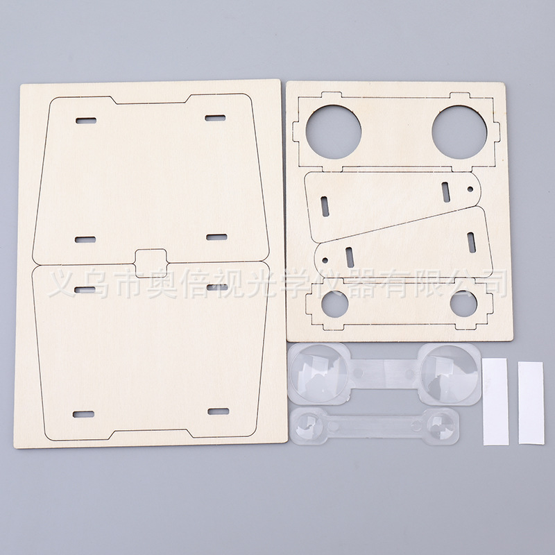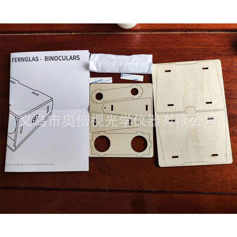 包装清单:木质预切望远镜板材2块, 双面胶2条,高清连体镜片一对(一连体目镜,一连体物镜),说明书(中英文可选)