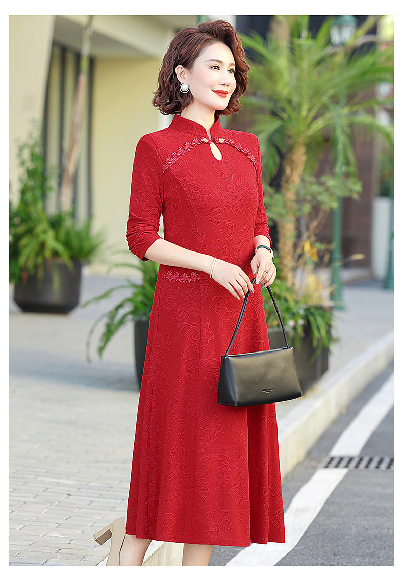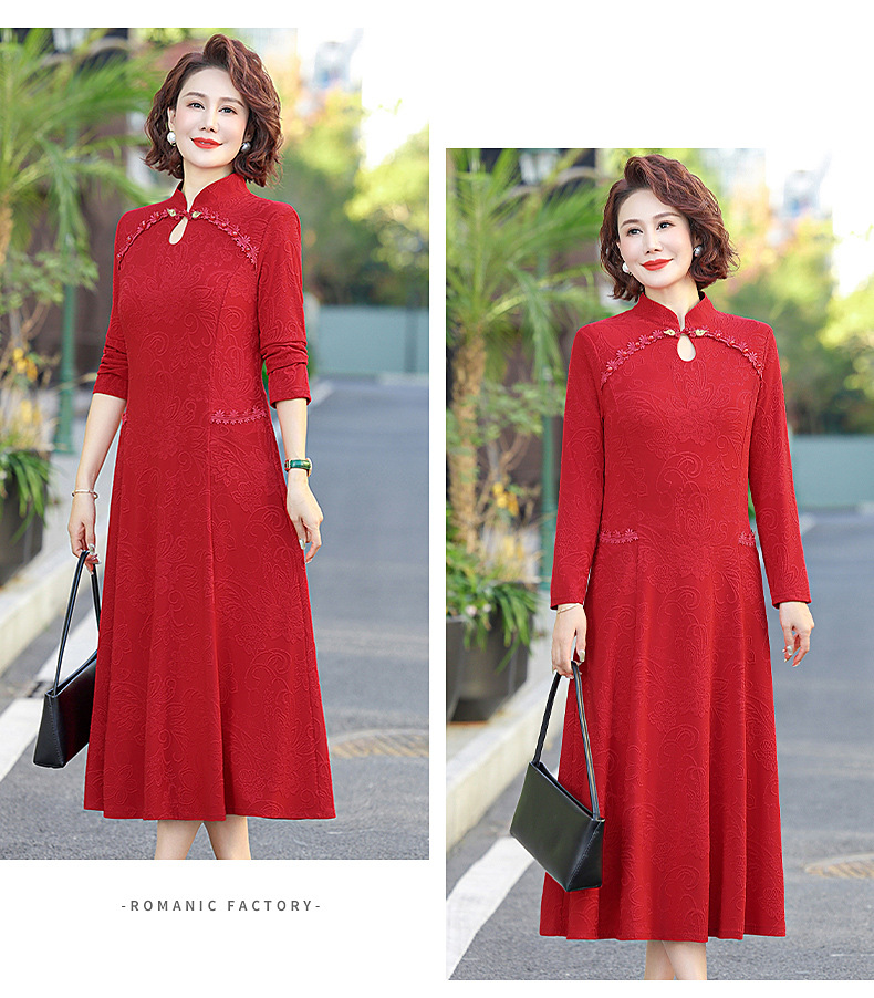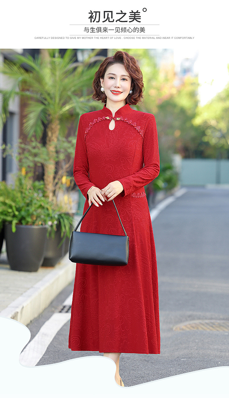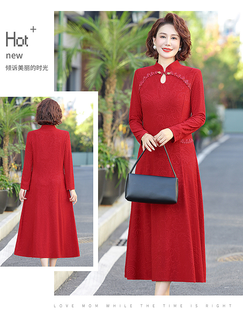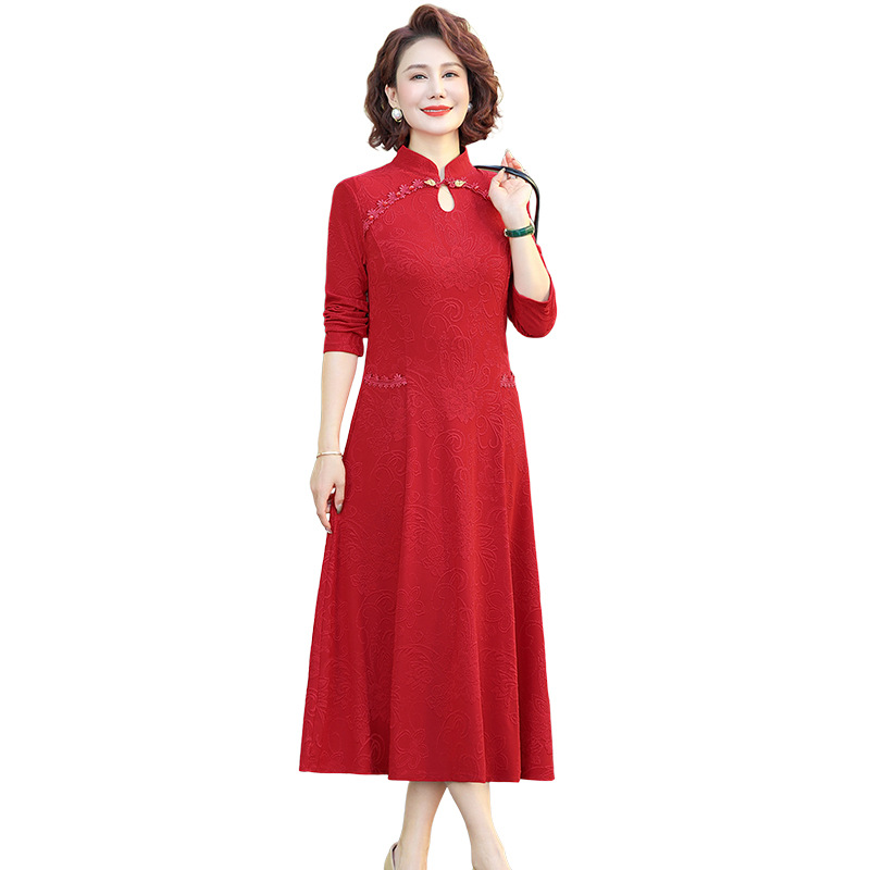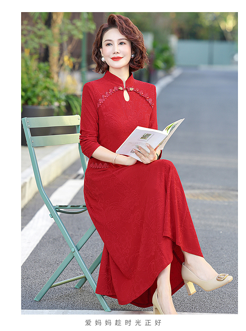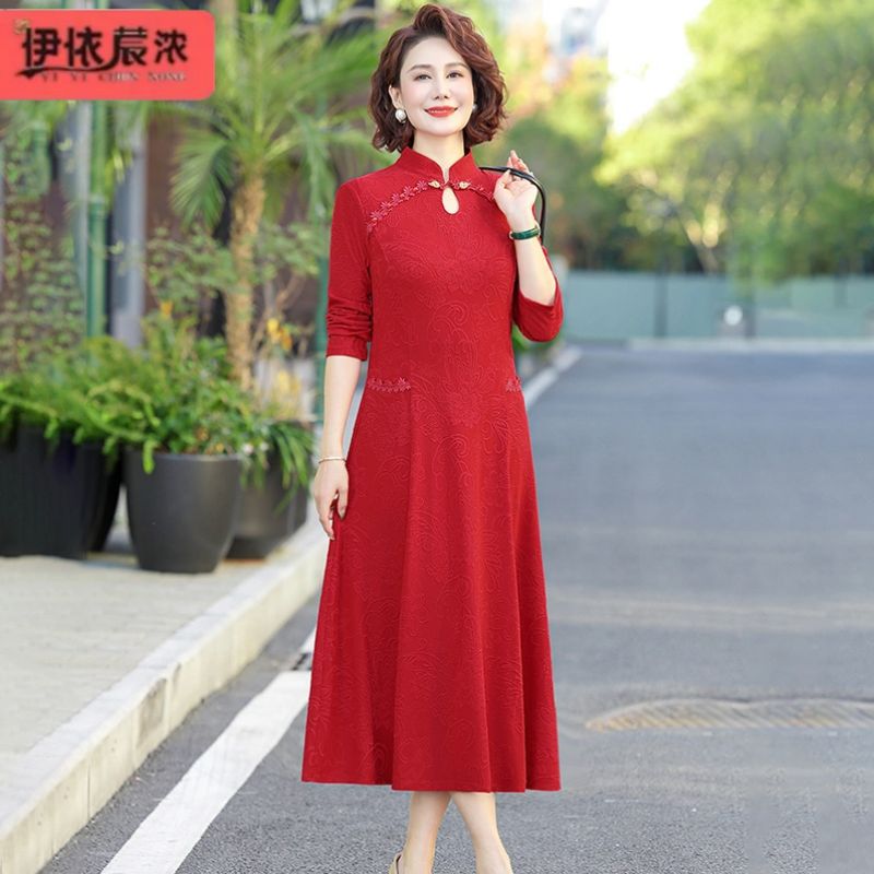 Мама среднего возраста носит весеннее Новое красное платье с длинным рукавом, улучшенное банкетное платье Cheongsam для 50-летних женщин среднего и пожилого возраста