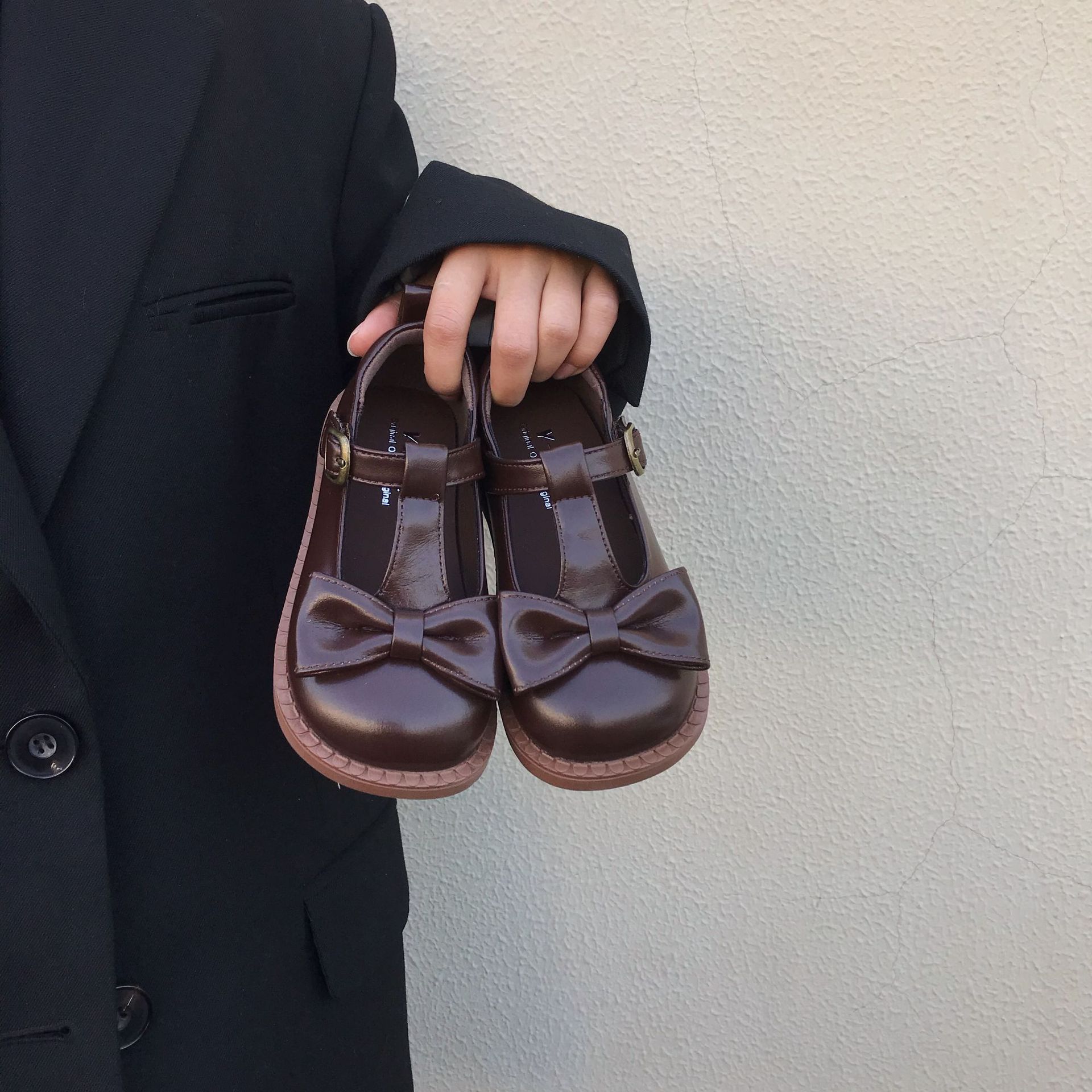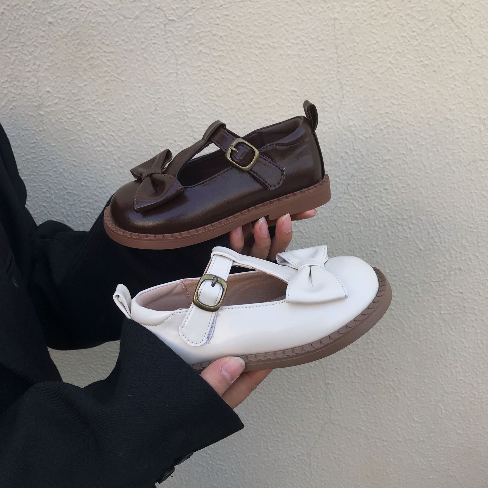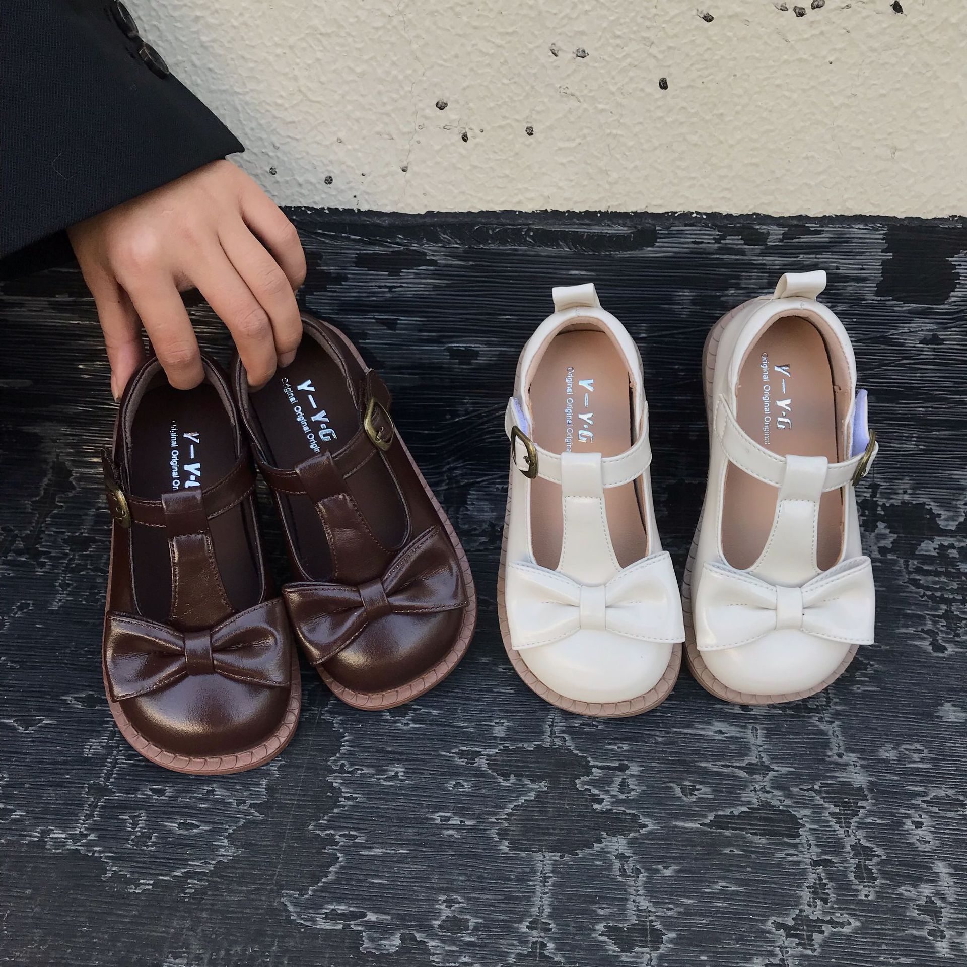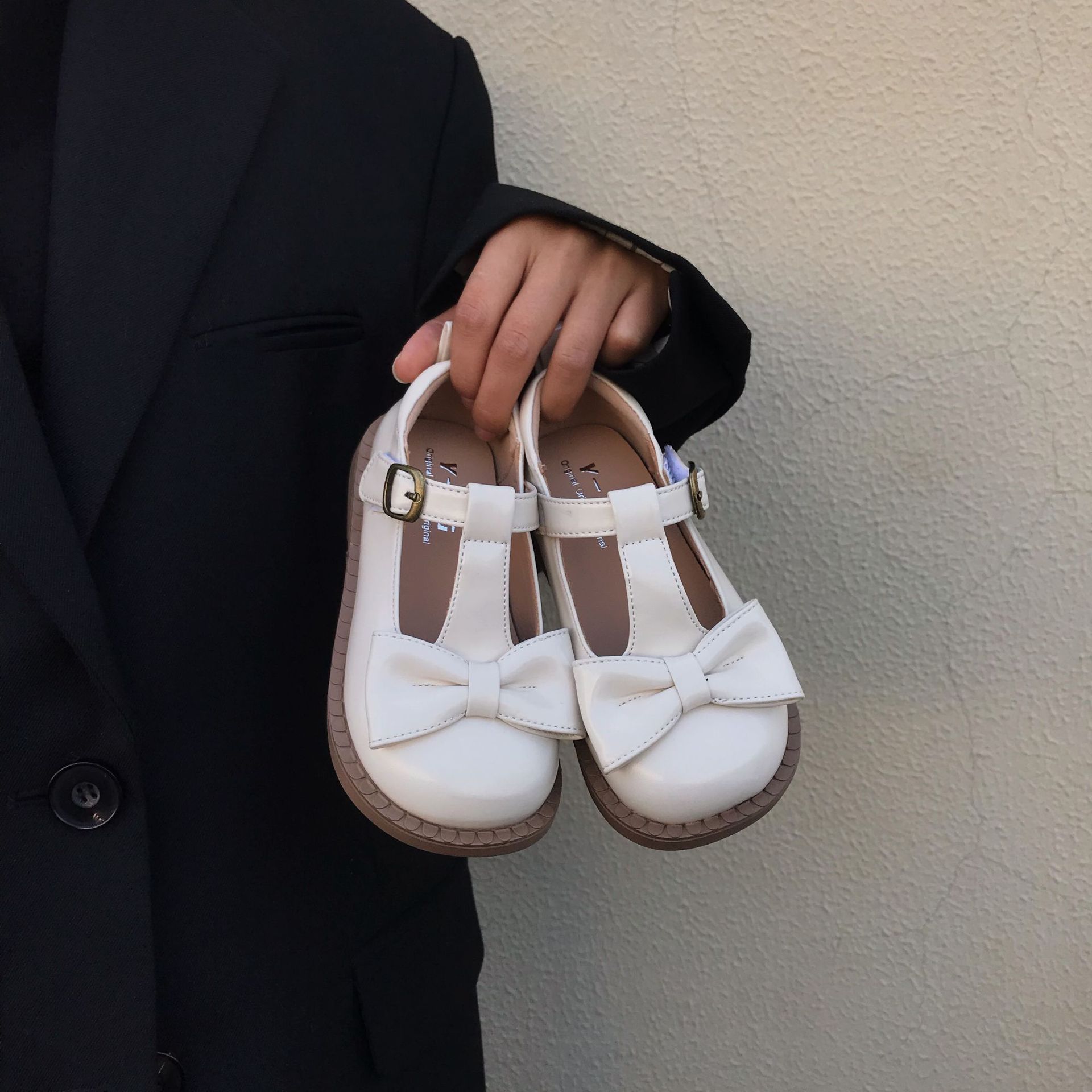 Детская кожаная обувь 2024 весна, новый корейский стиль, кожаная обувь Princess с Т-образным бантом для девочек, детская универсальная Однослойная обувь