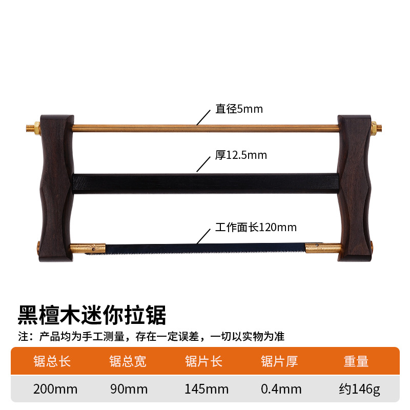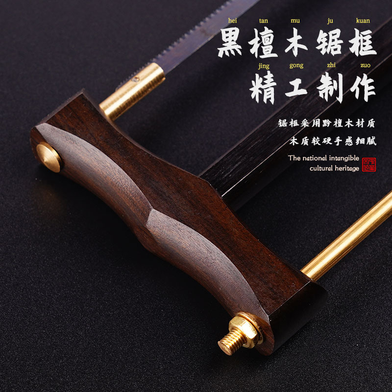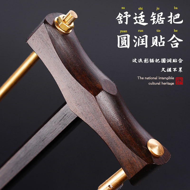 应用特征:黑檀木锯框,木头细腻光滑无毛刺,铜质拉杆精致复古。65#猛钢锯片,锯片总长145mm工作面120mm,锯片厚度0.4mm,切割锋利。