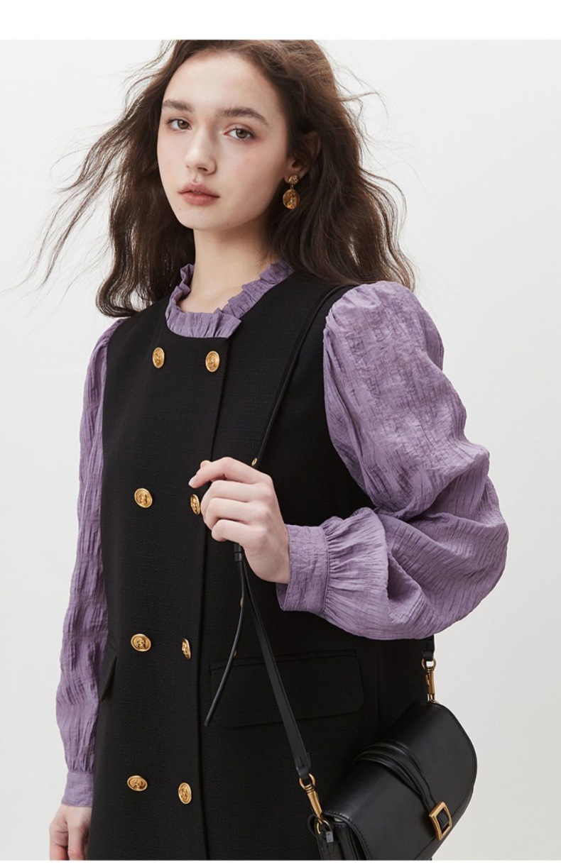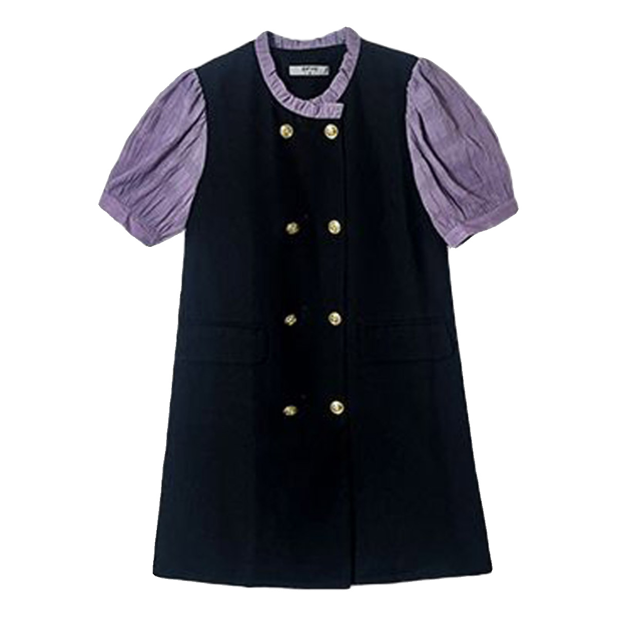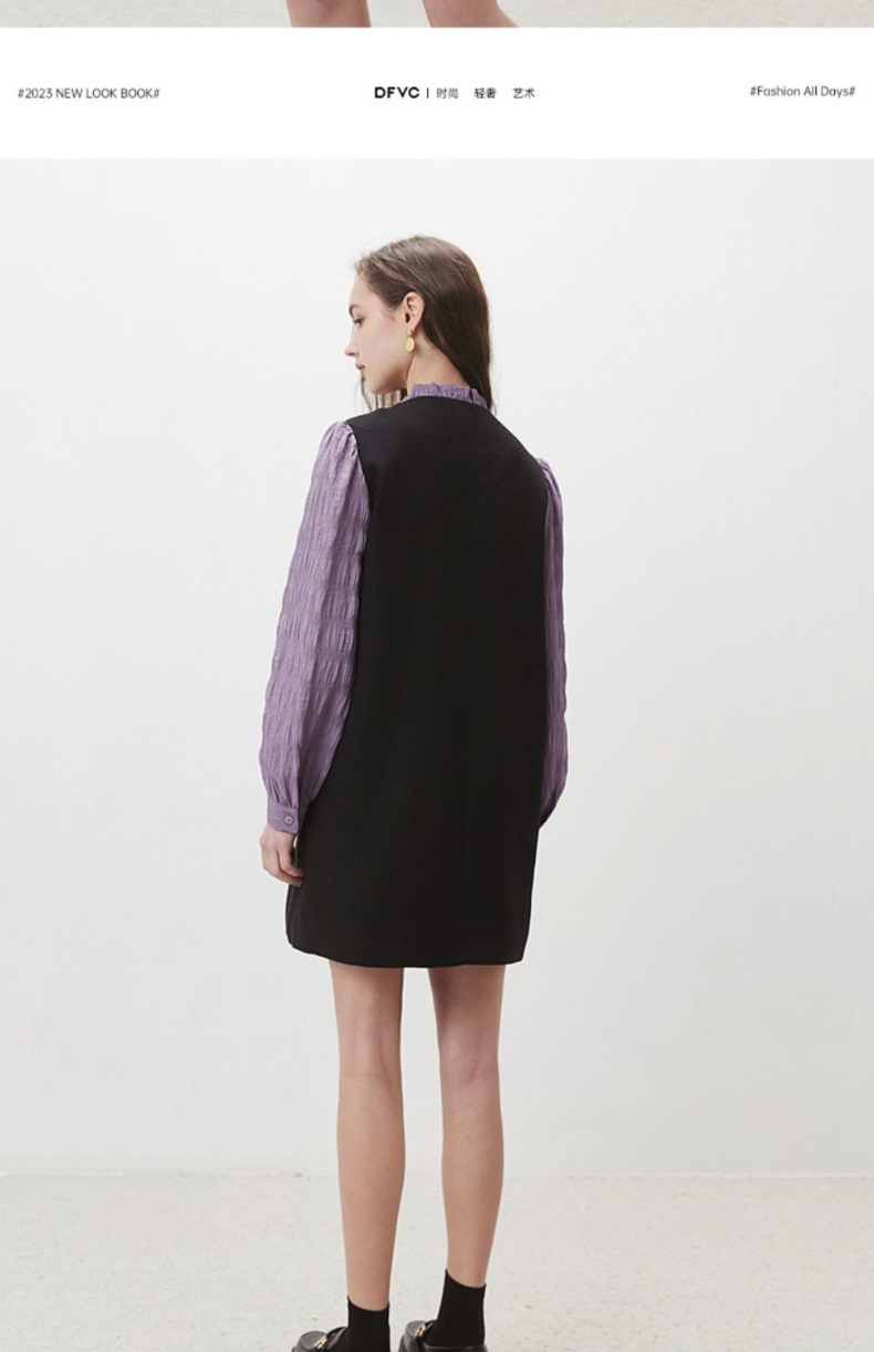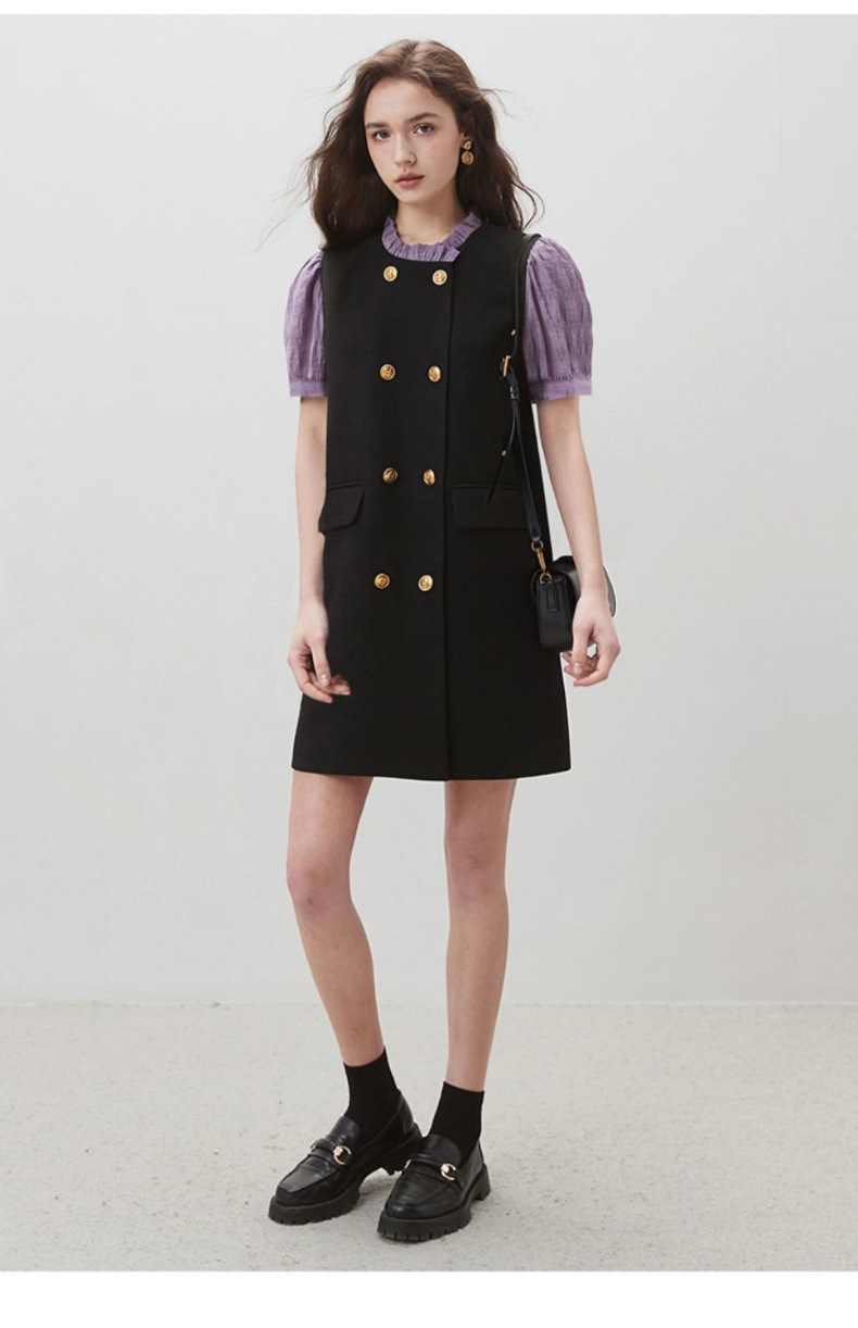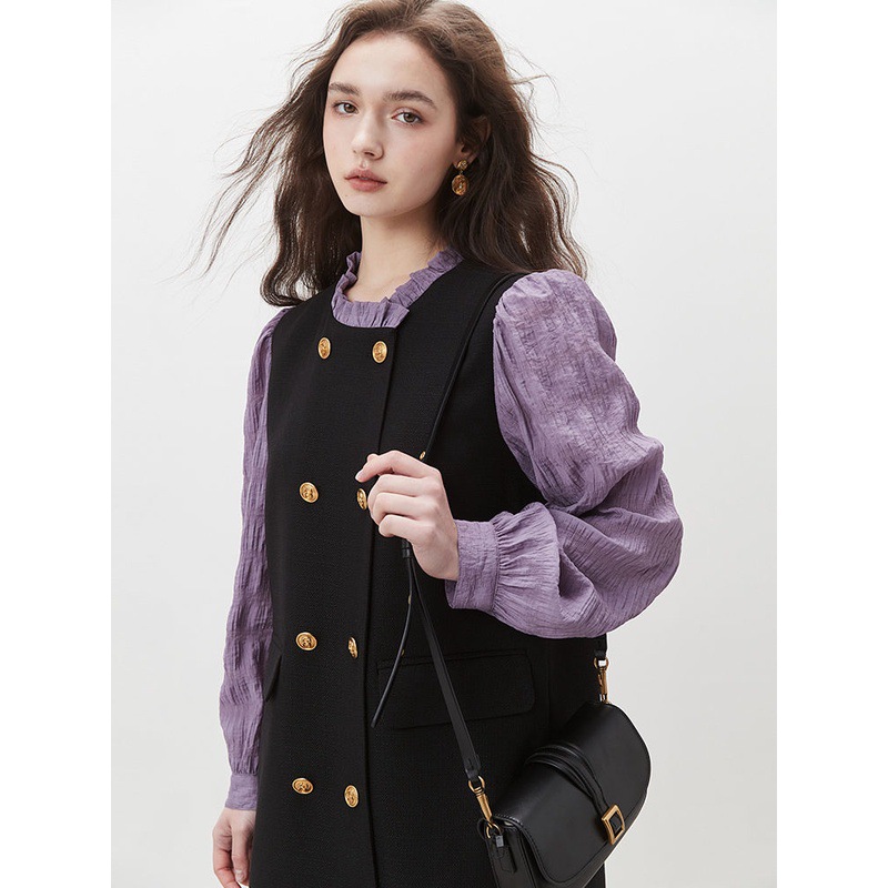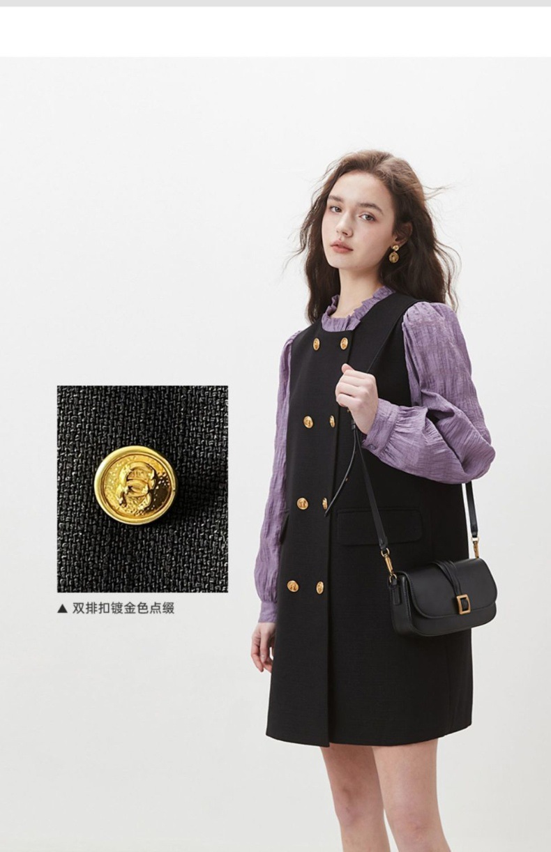 Черное платье А-силуэта с оборками для миниатюрных женщин, новинка 2025 года, винтажное, с лоскутным узором, длинными рукавами, круглым вырезом, короткими рукавами и декором на пуговицах.