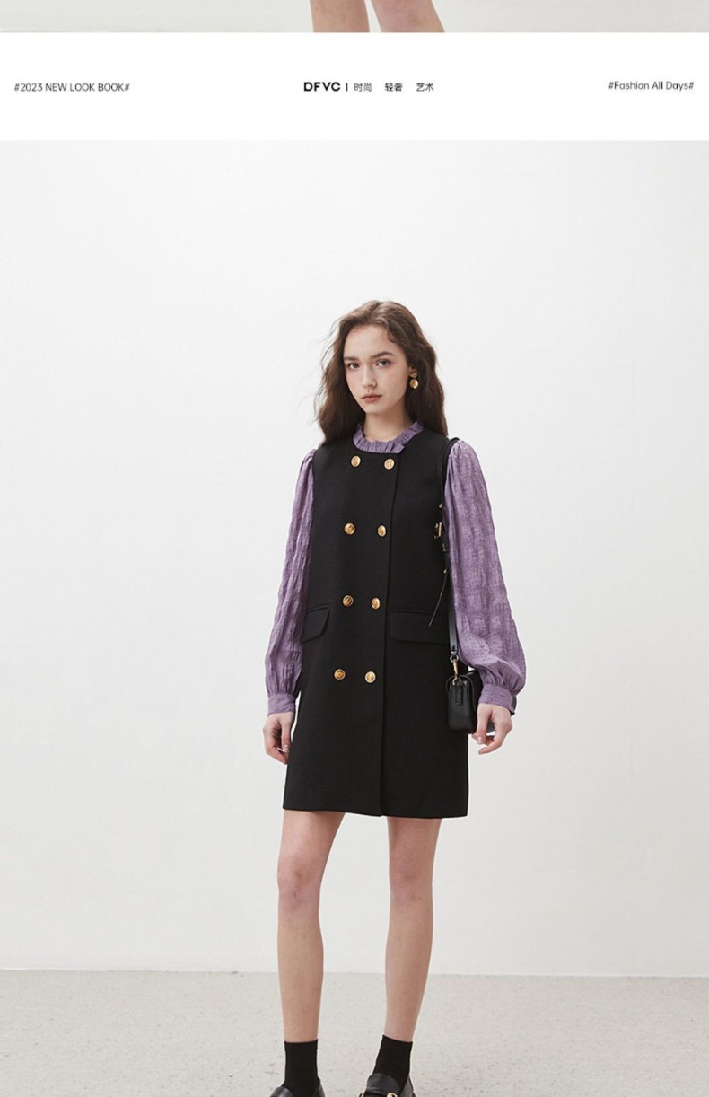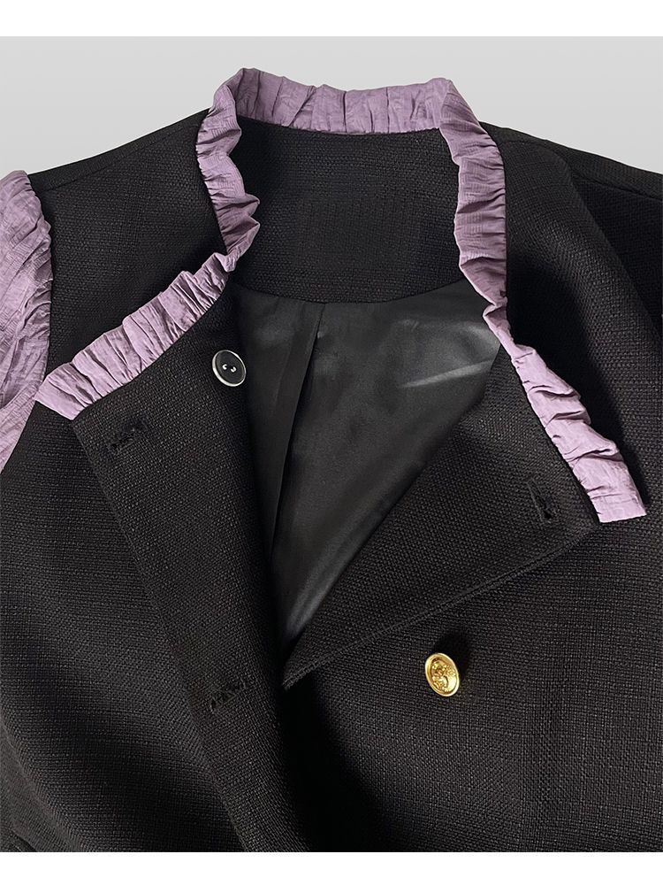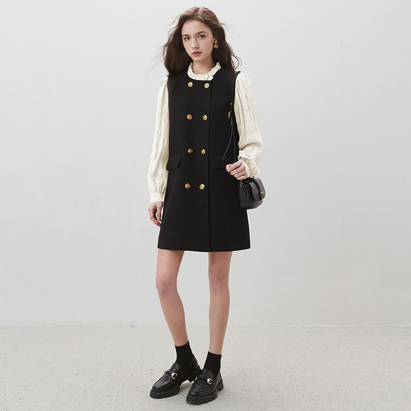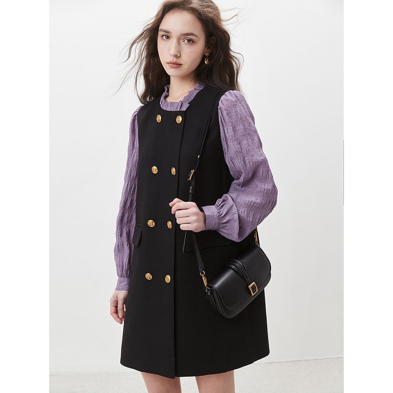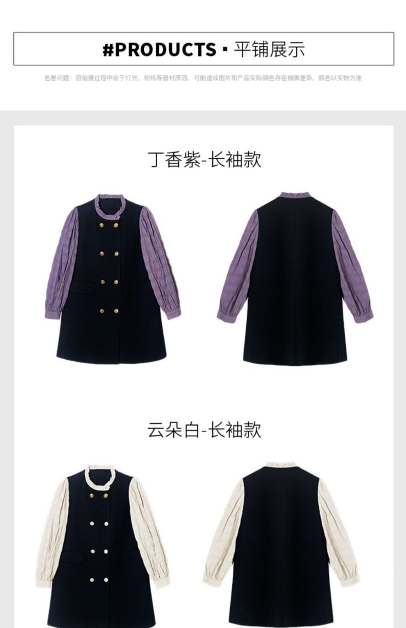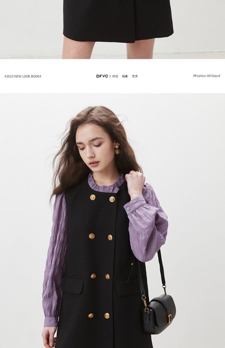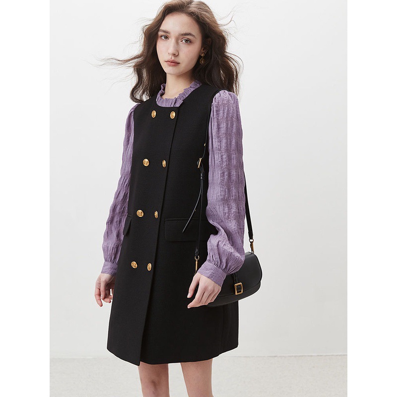 Черное платье А-силуэта с оборками для миниатюрных женщин, новинка 2025 года, винтажное, с лоскутным узором, длинными рукавами, круглым вырезом, короткими рукавами и декором на пуговицах.