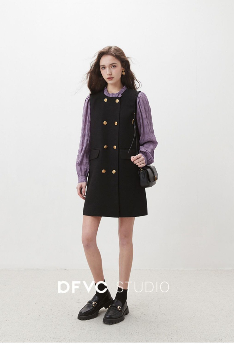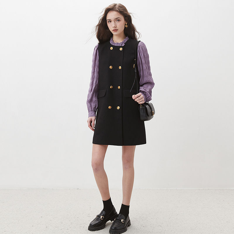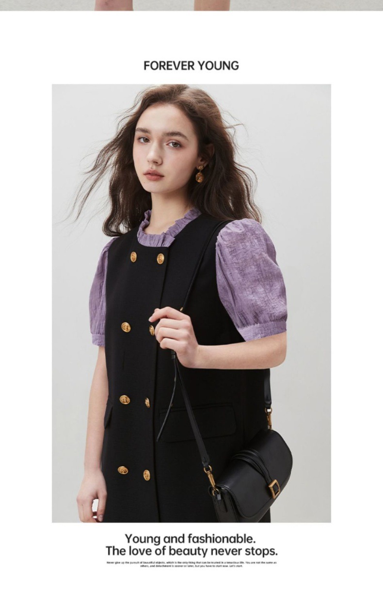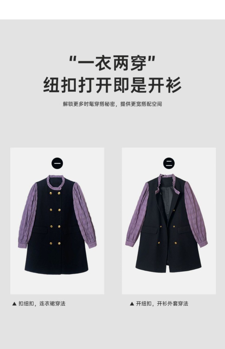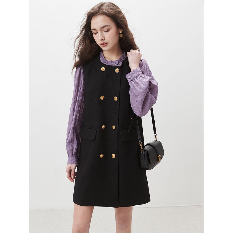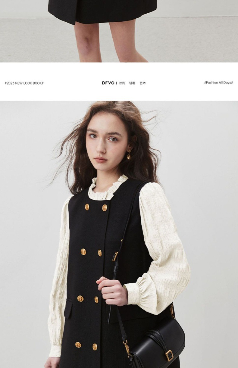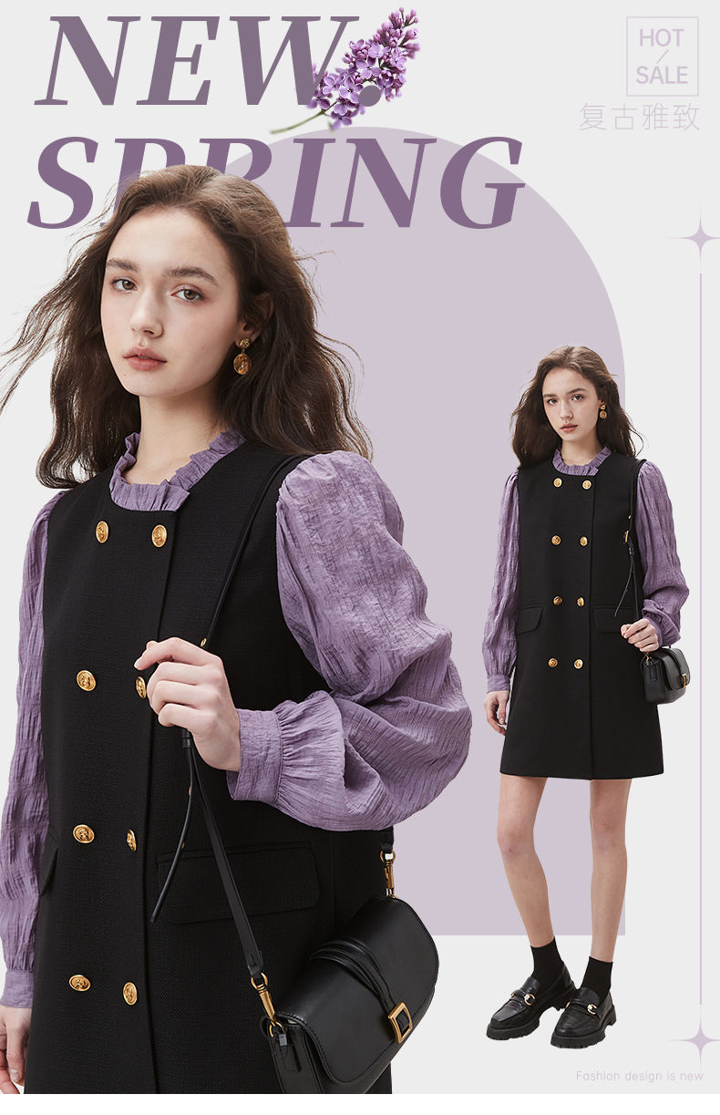 Черное платье А-силуэта с оборками для миниатюрных женщин, новинка 2025 года, винтажное, с лоскутным узором, длинными рукавами, круглым вырезом, короткими рукавами и декором на пуговицах.