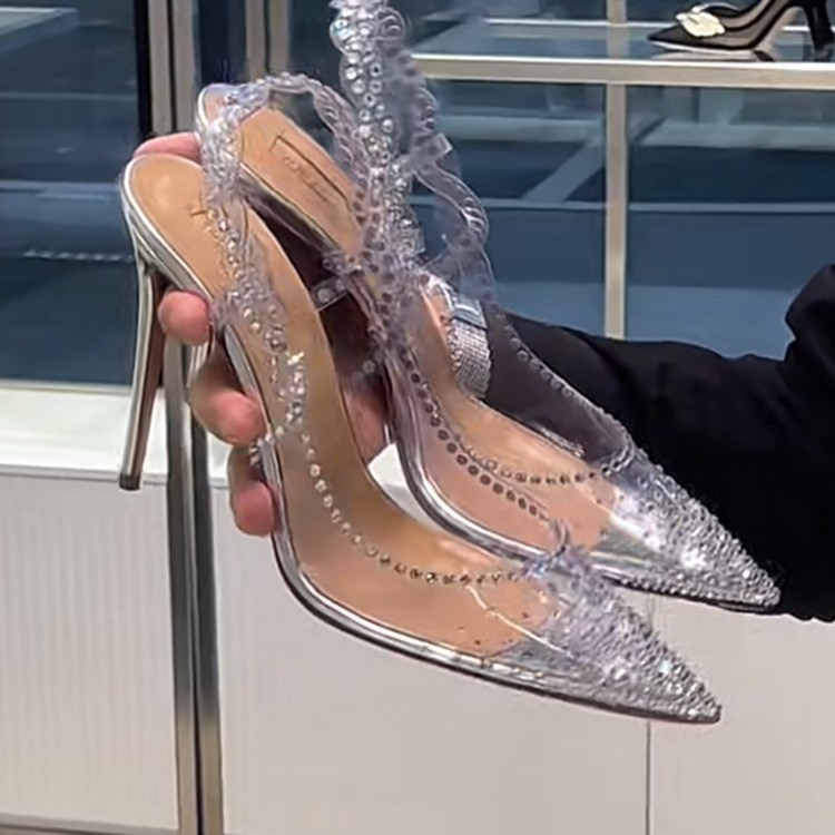 Прозрачные женские босоножки с кристаллами и носком на шпильке, новинка лета 2024, стильные туфли на высоком каблуке с острым носком и стразами, с пустой спинкой