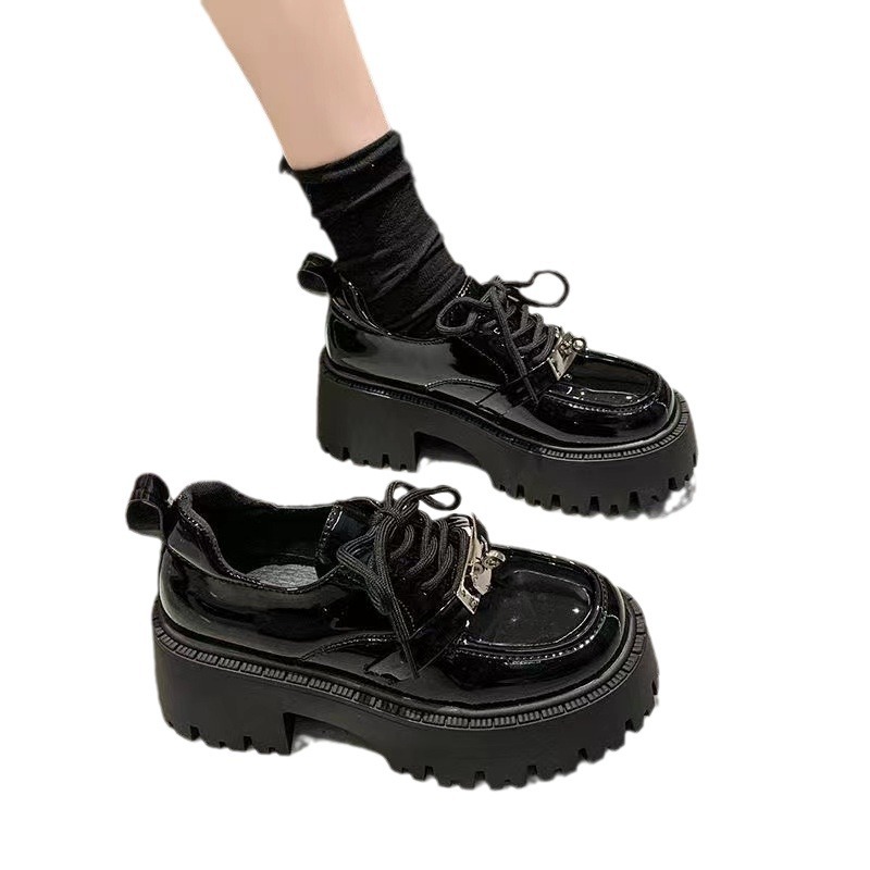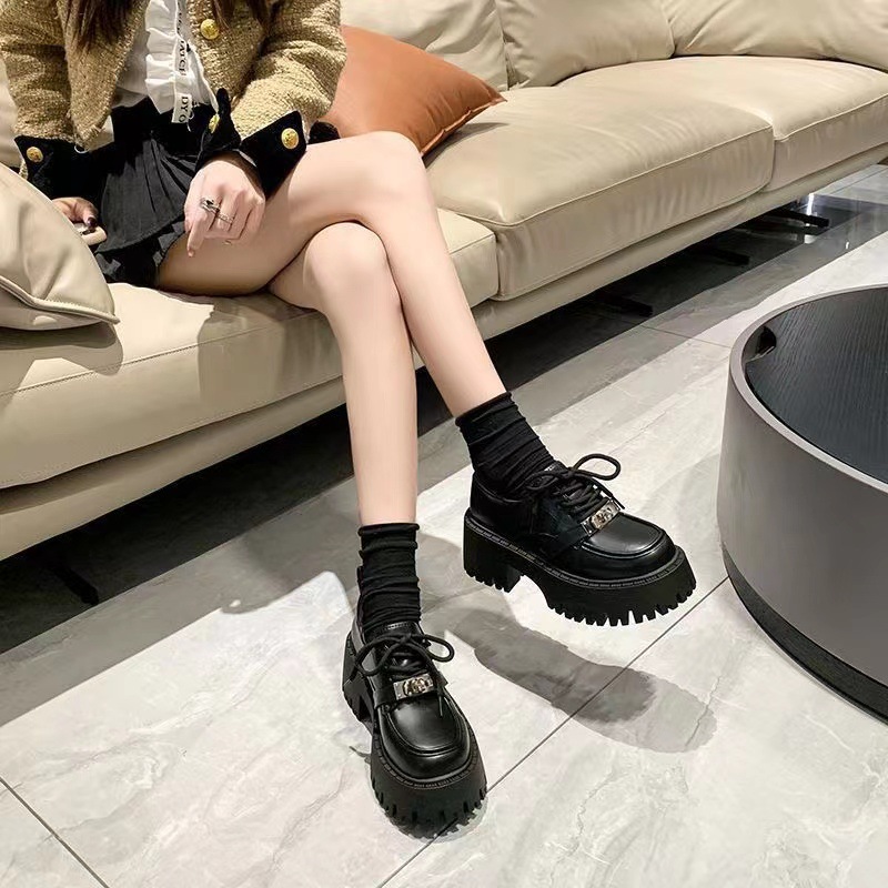 Женские кожаные туфли на толстой подошве в британском стиле, новинка весны 2024 года, черные увеличенные лоферы на толстом каблуке, однослойные туфли в стиле ретро на шнуровке