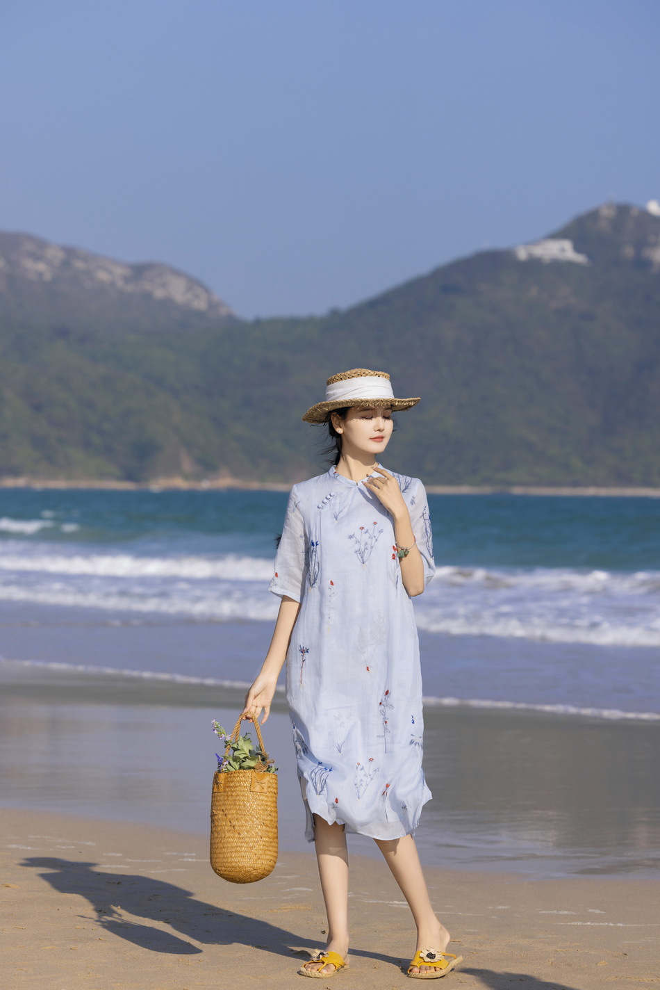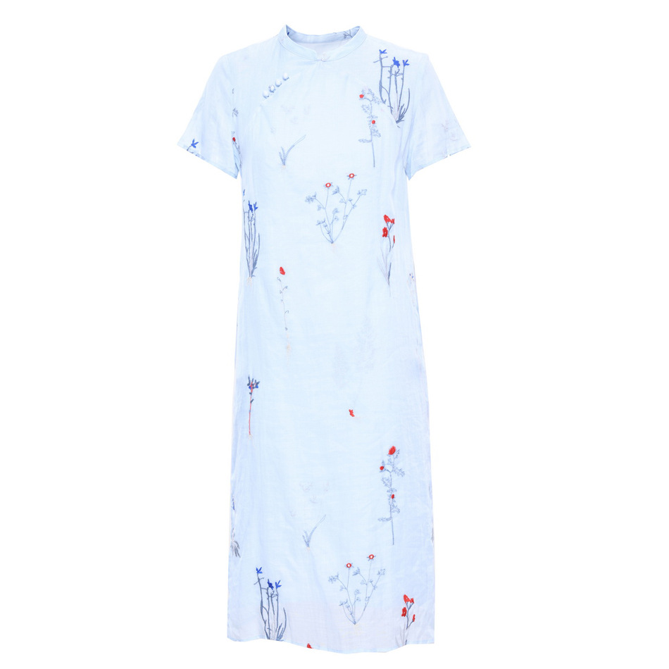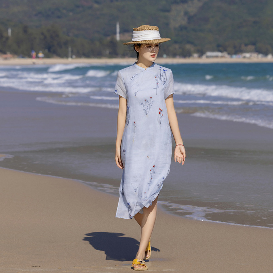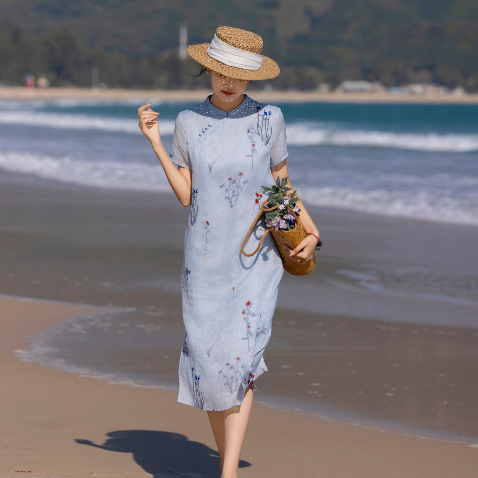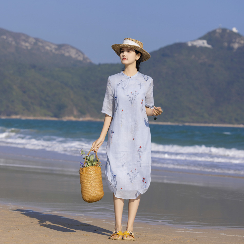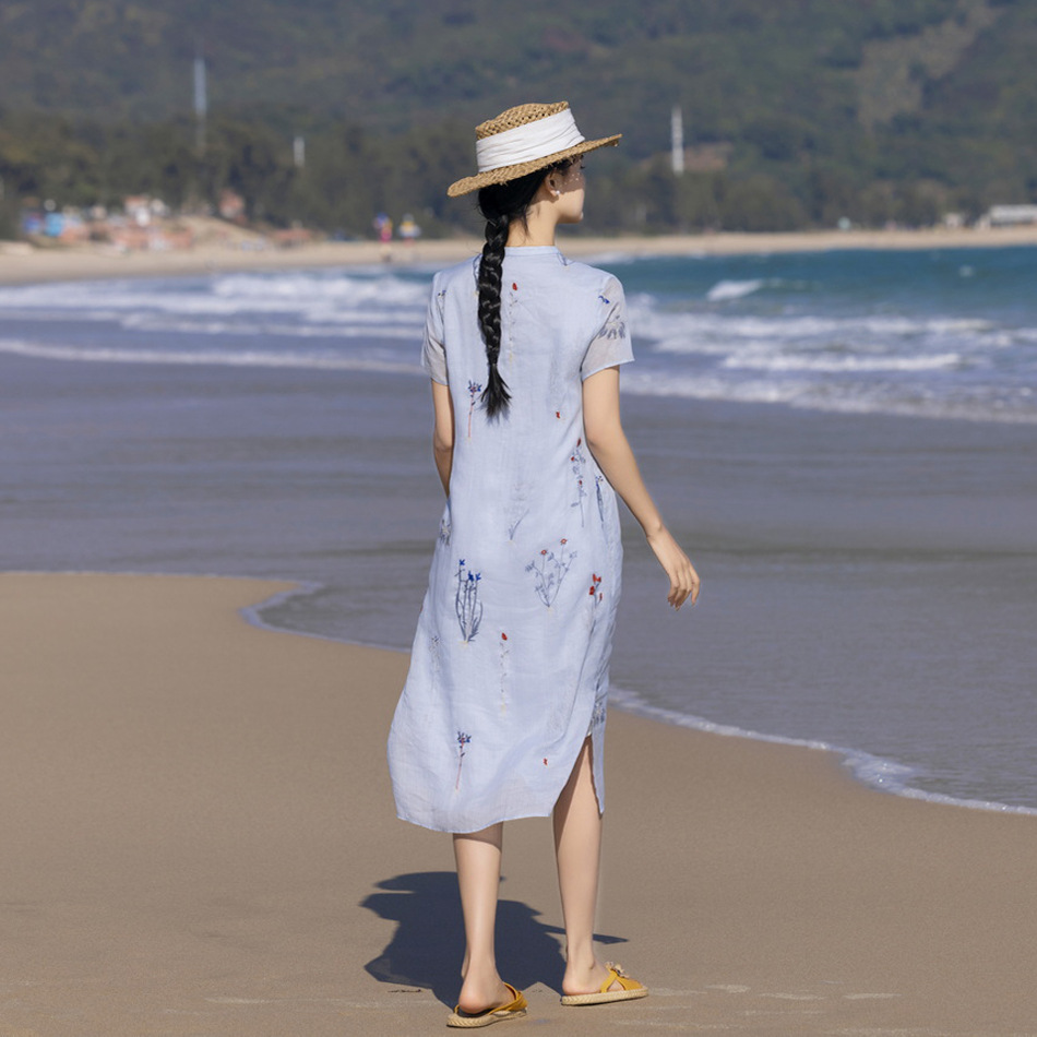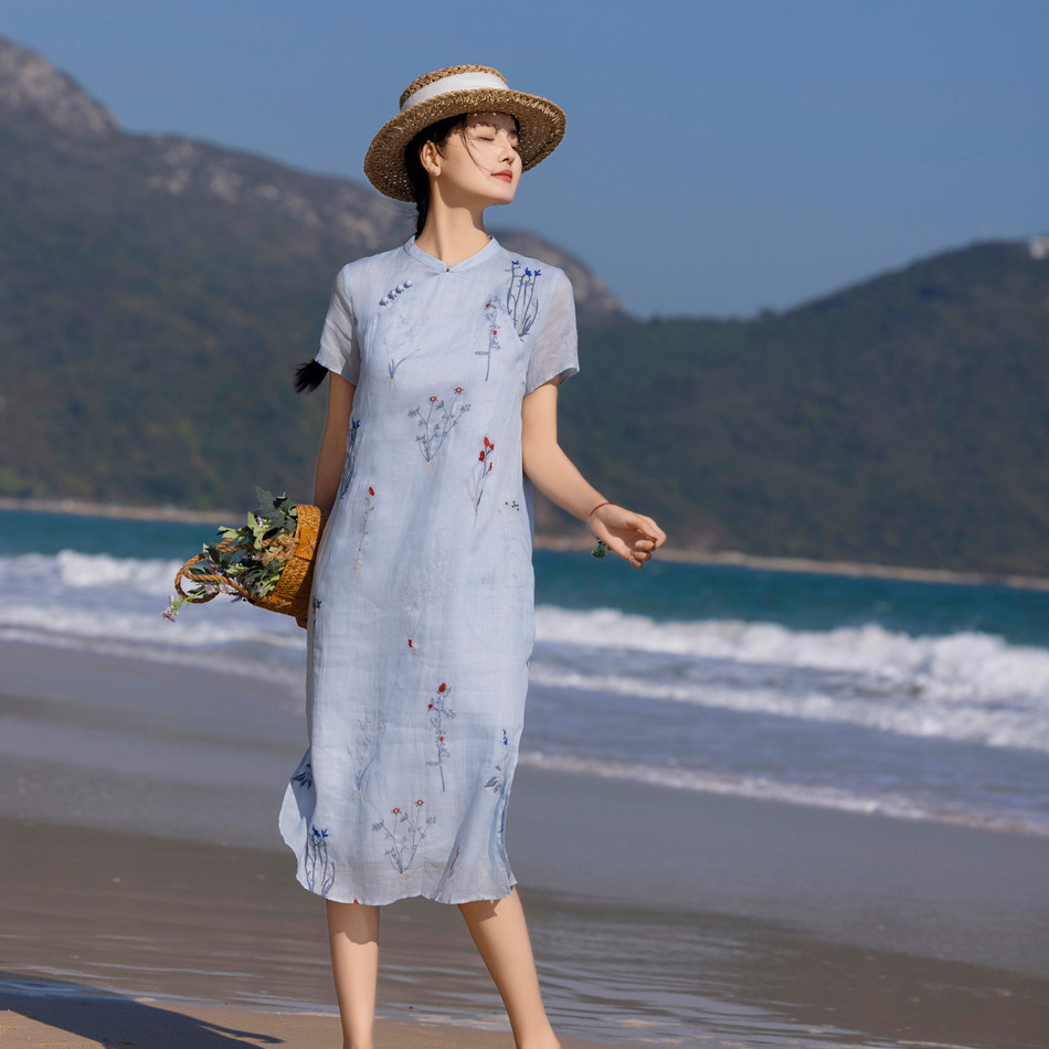 2024 Весна и лето новая женская одежда с вышивкой рами дорожное платье средней длины в национальном стиле с воротником-стойкой и коротким рукавом для женщин