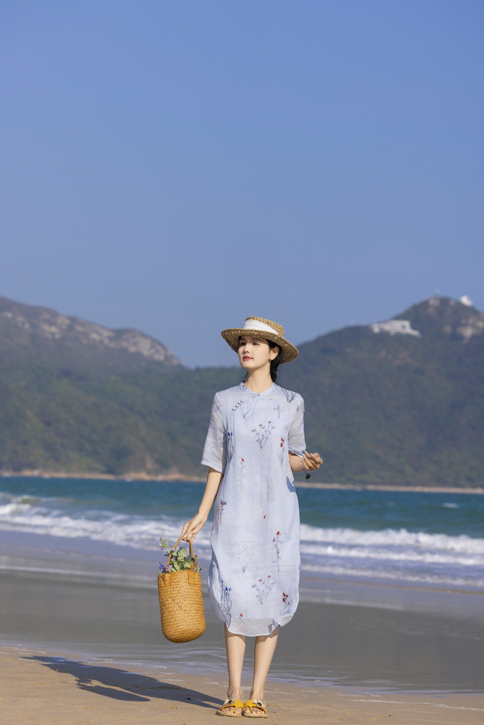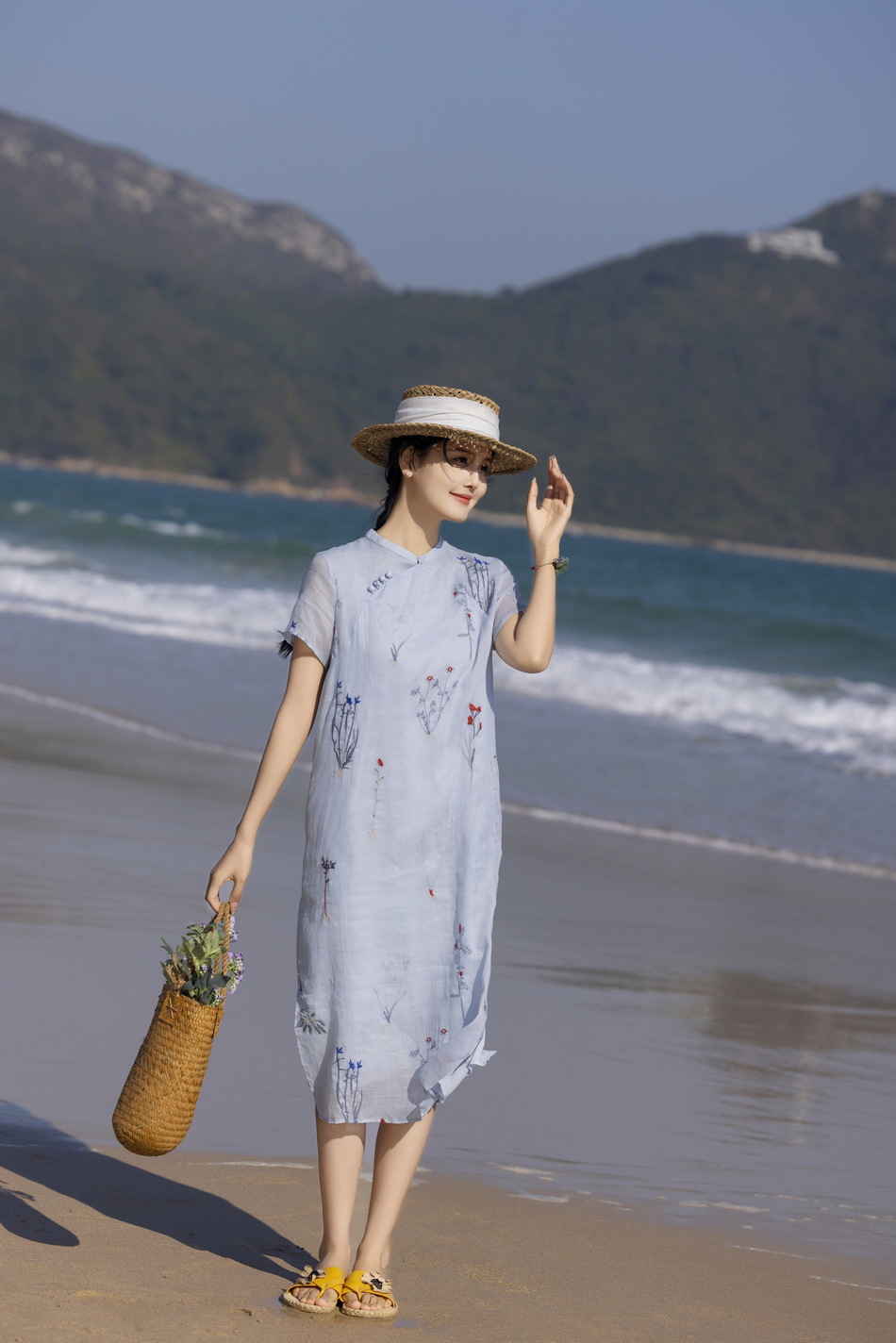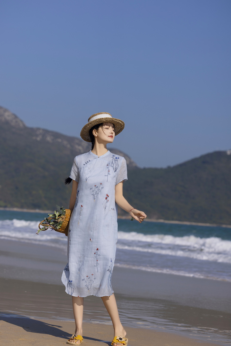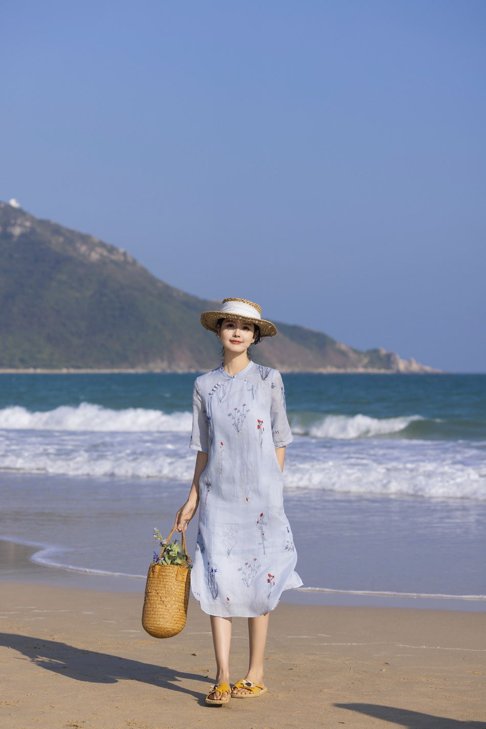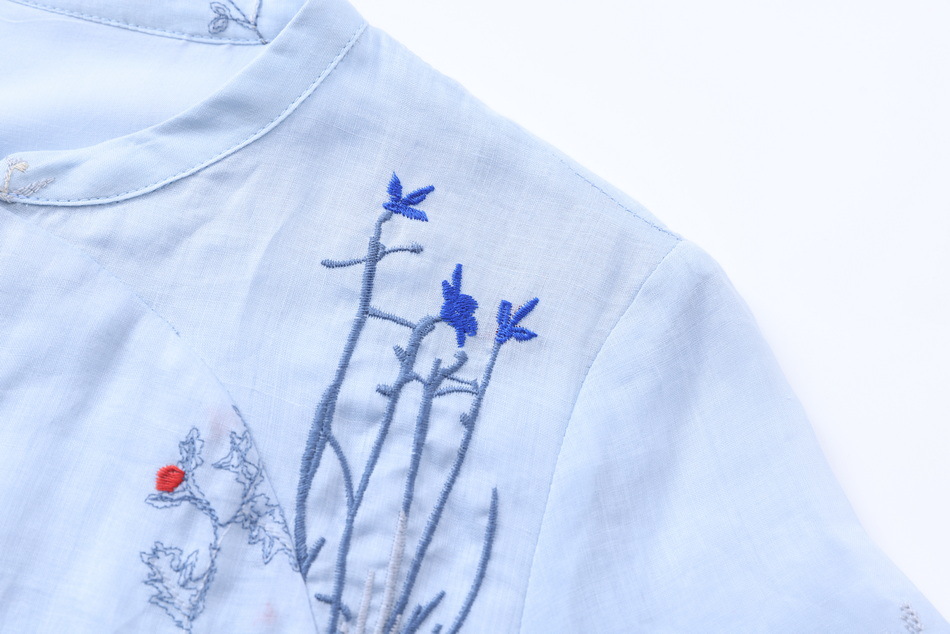 2024 Весна и лето новая женская одежда с вышивкой рами дорожное платье средней длины в национальном стиле с воротником-стойкой и коротким рукавом для женщин
