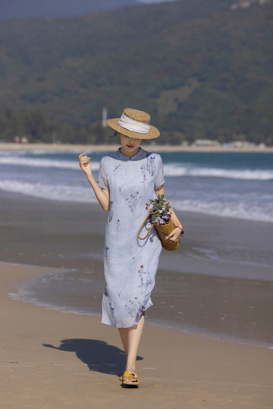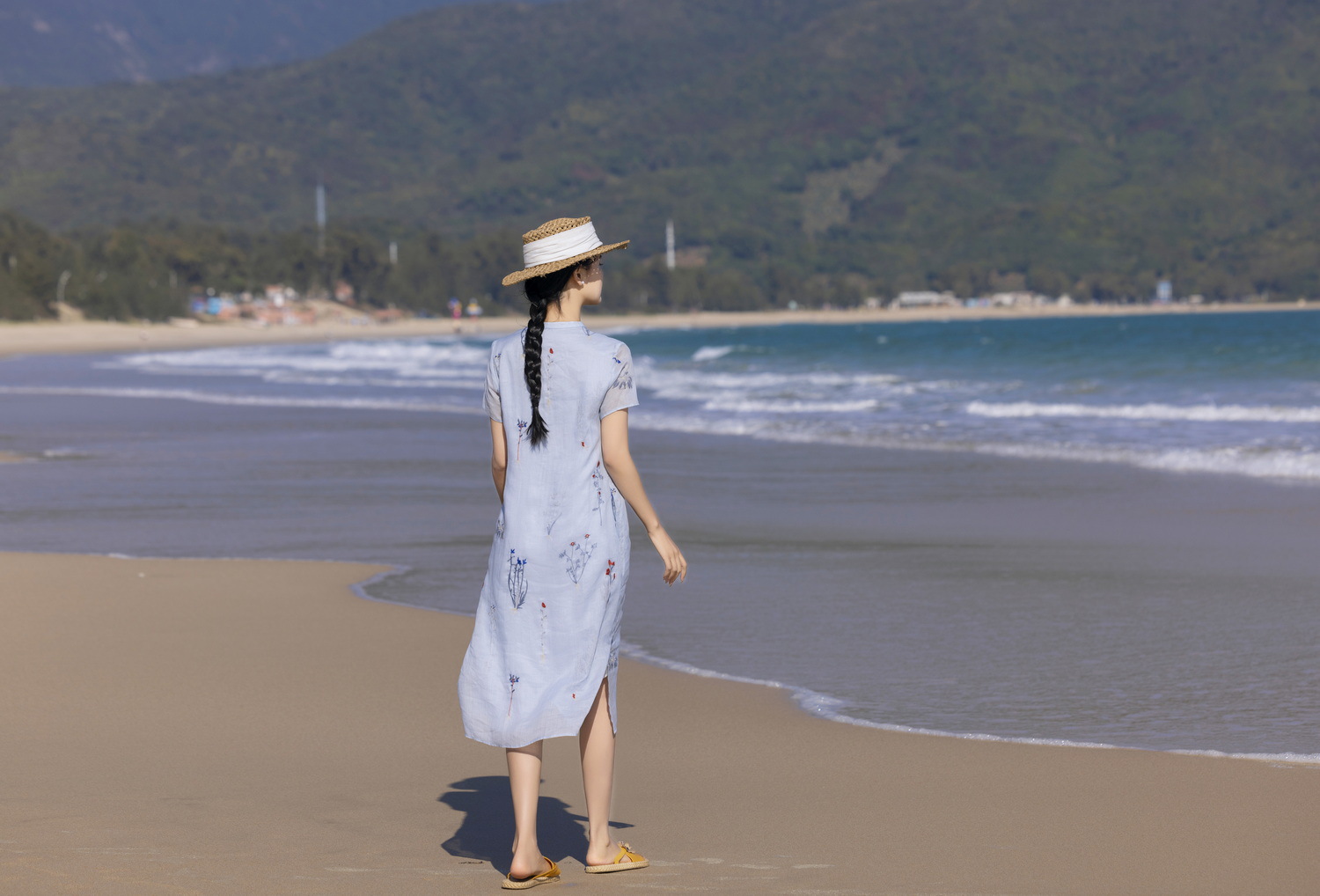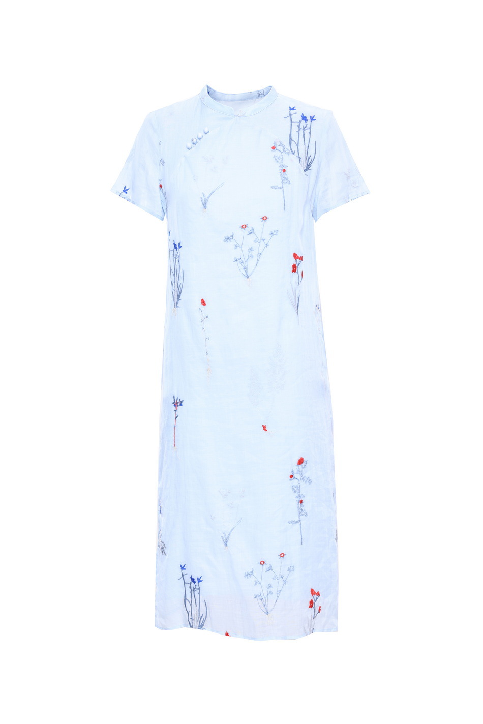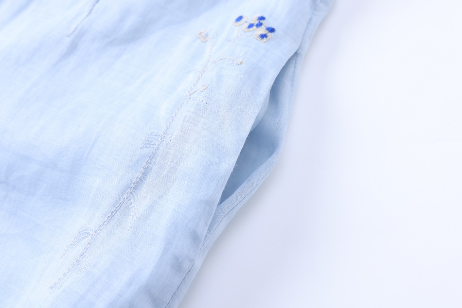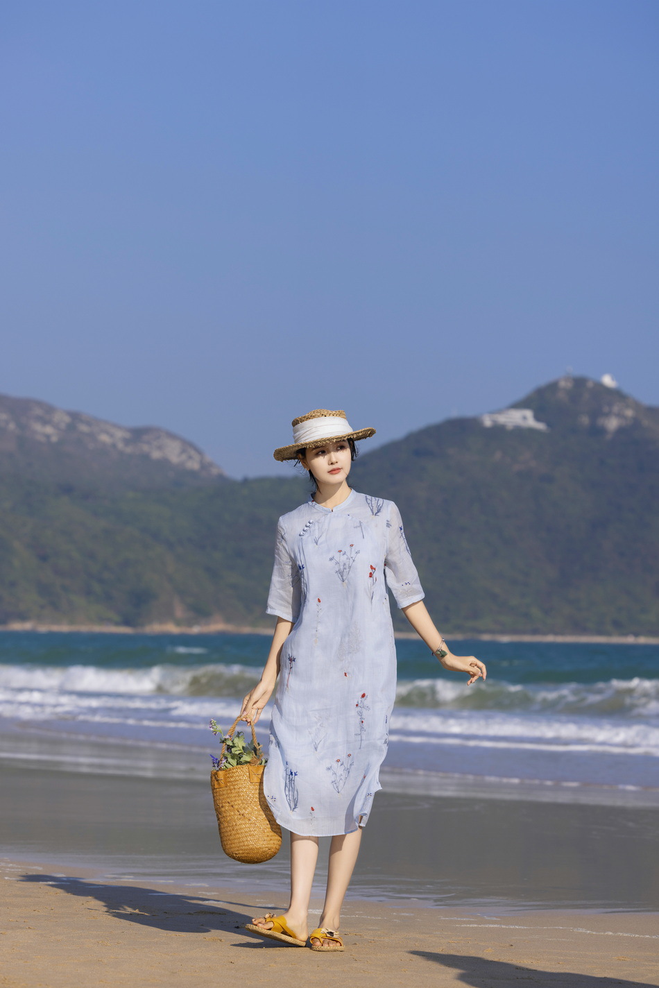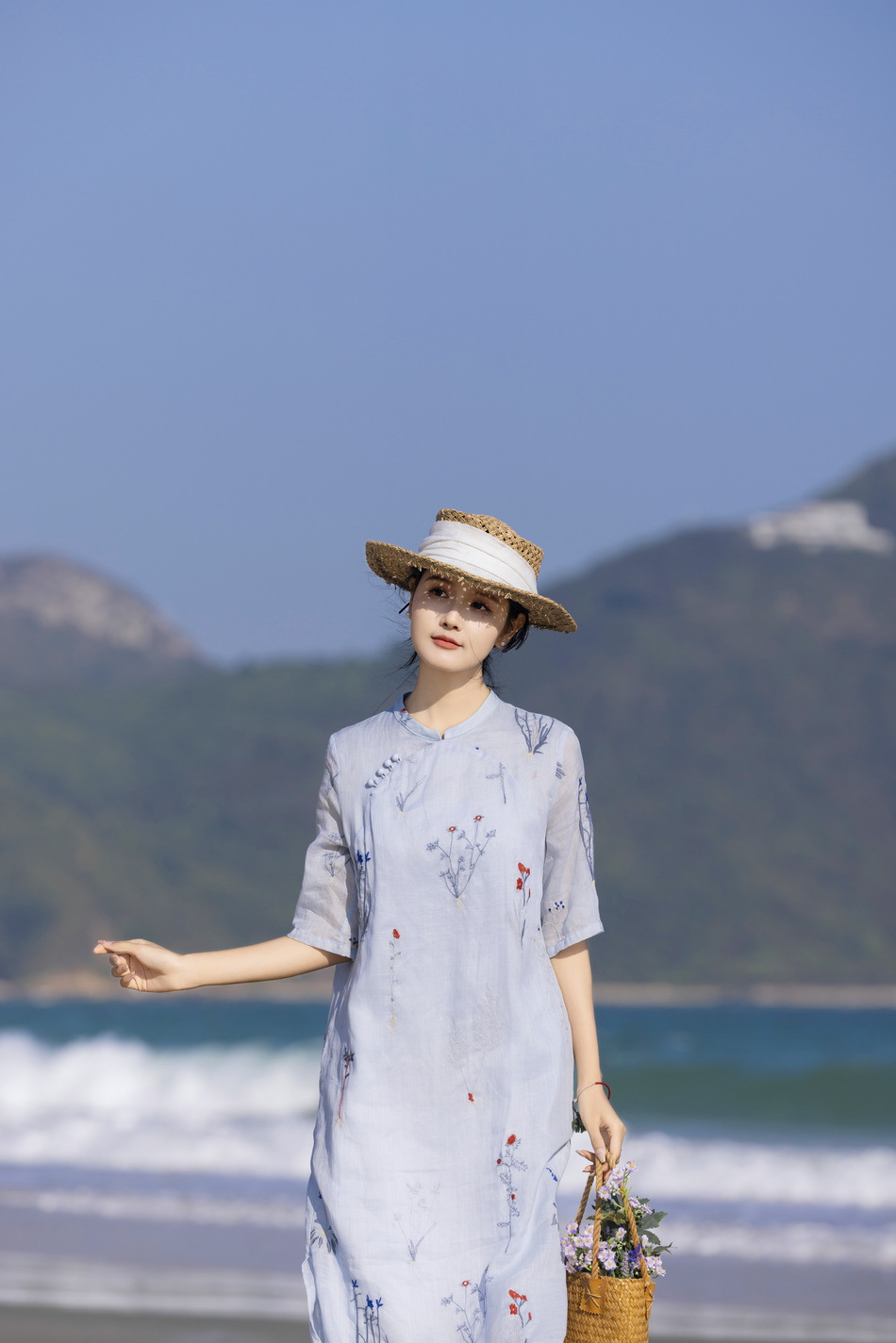 2024 Весна и лето новая женская одежда с вышивкой рами дорожное платье средней длины в национальном стиле с воротником-стойкой и коротким рукавом для женщин