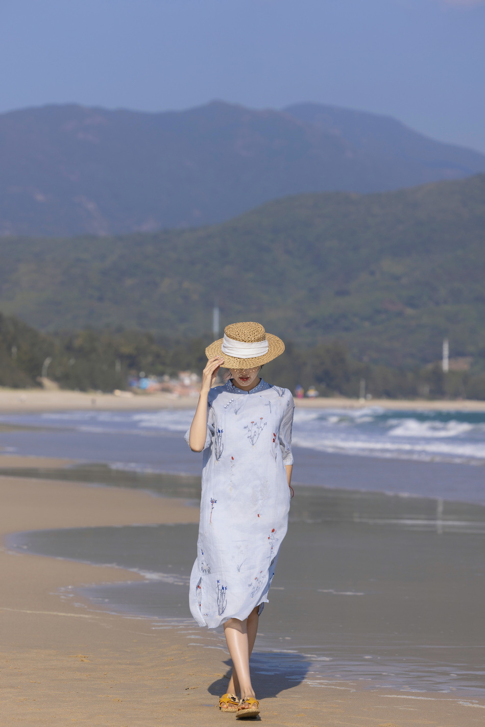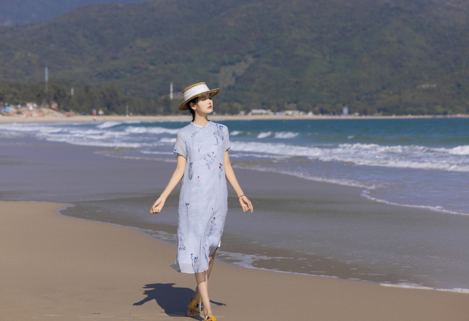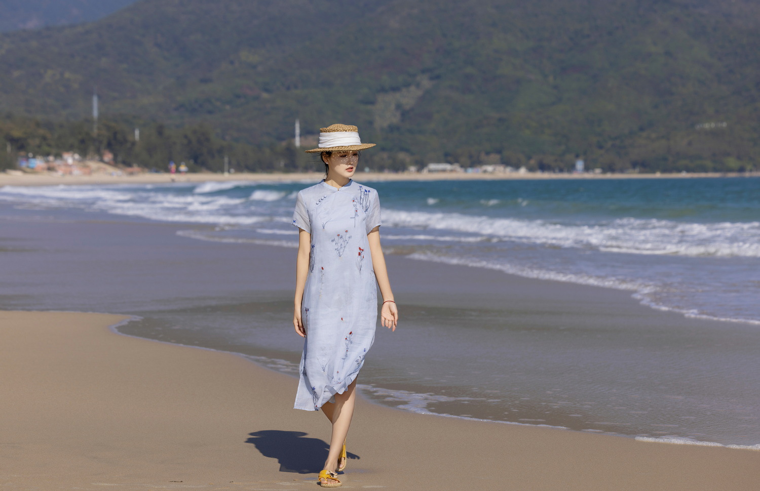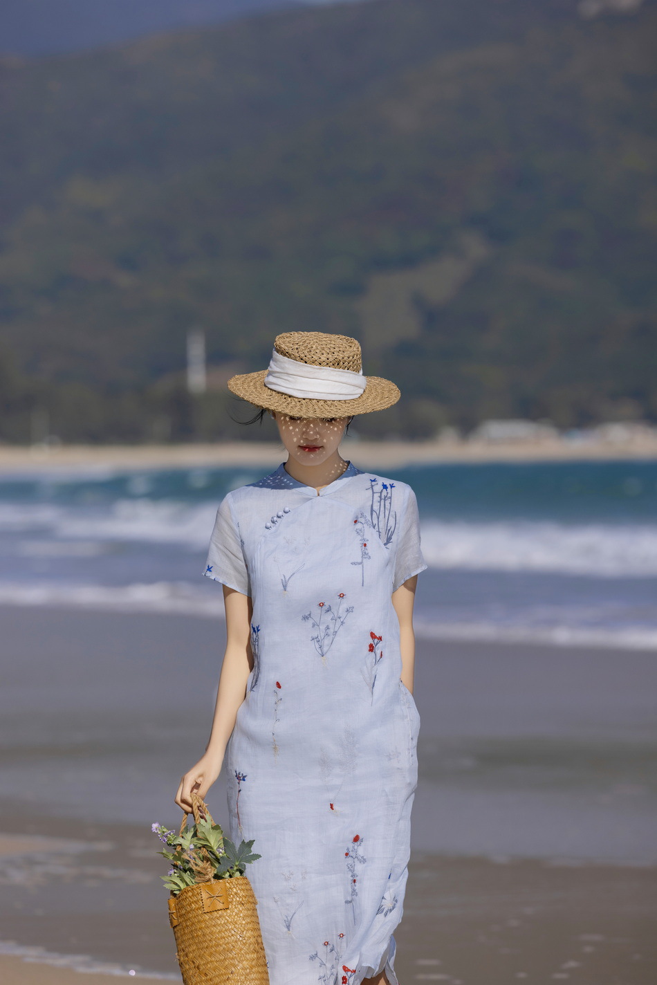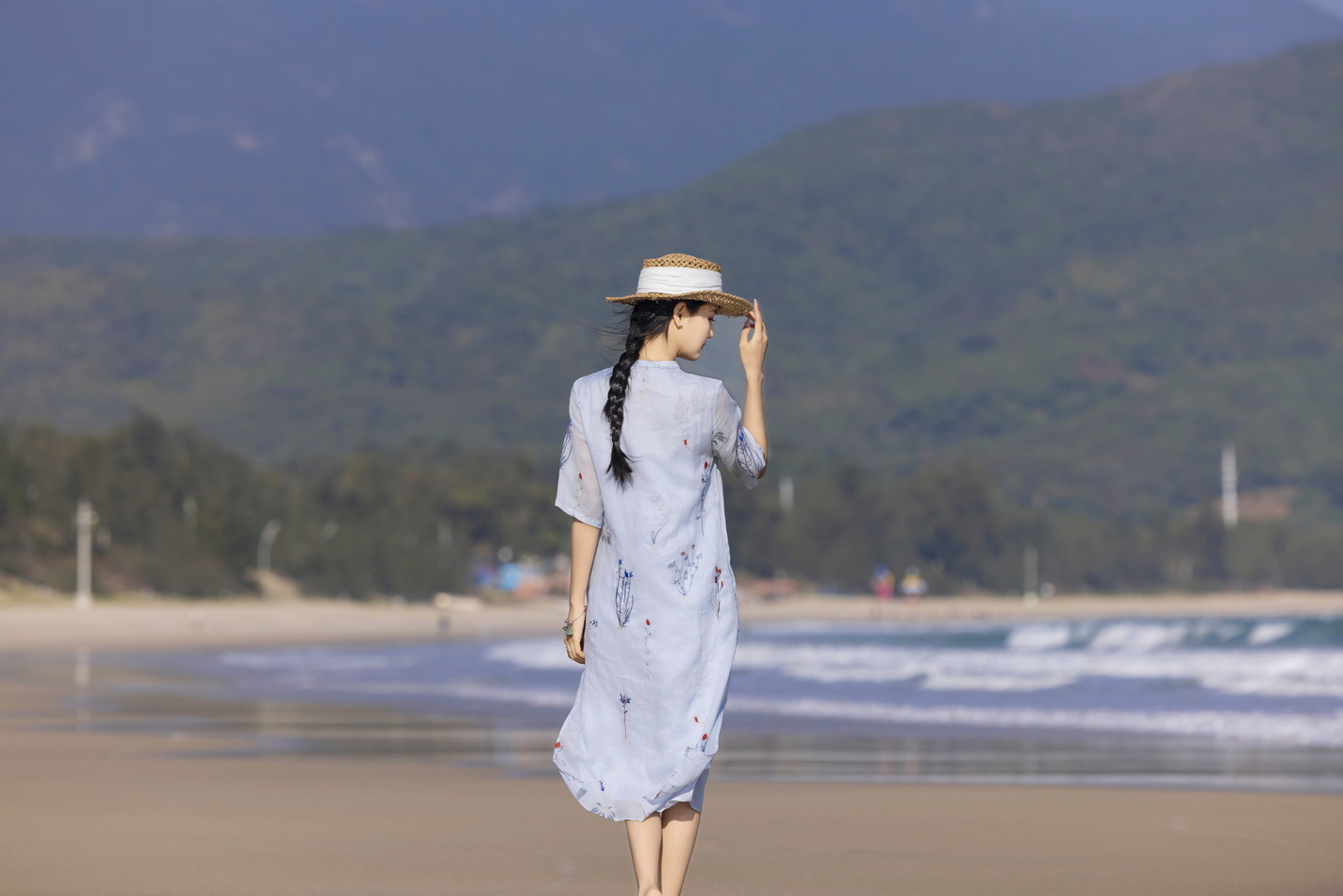 2024 Весна и лето новая женская одежда с вышивкой рами дорожное платье средней длины в национальном стиле с воротником-стойкой и коротким рукавом для женщин