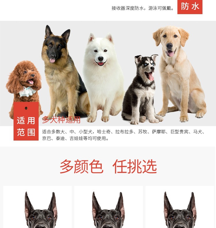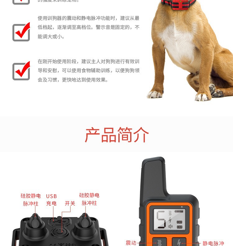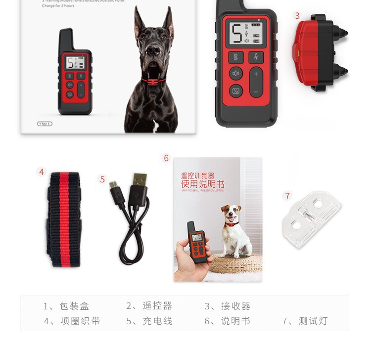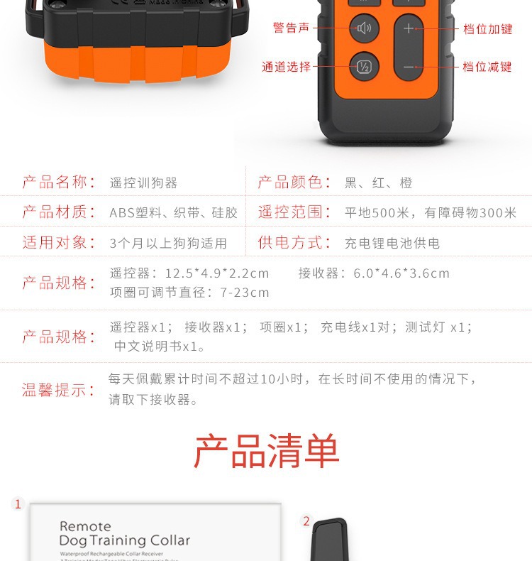 【产品清单】:遥控器、接收器、项圈带、USB充电线、测试灯、说明书