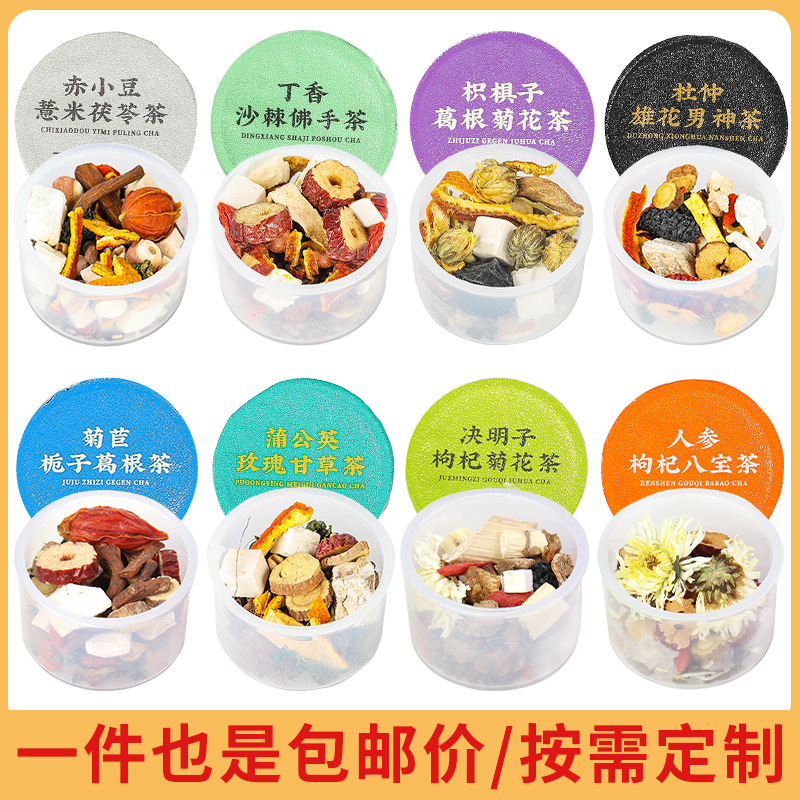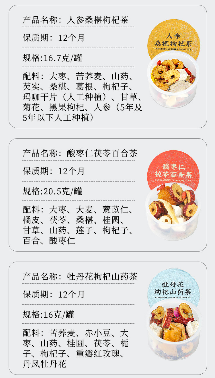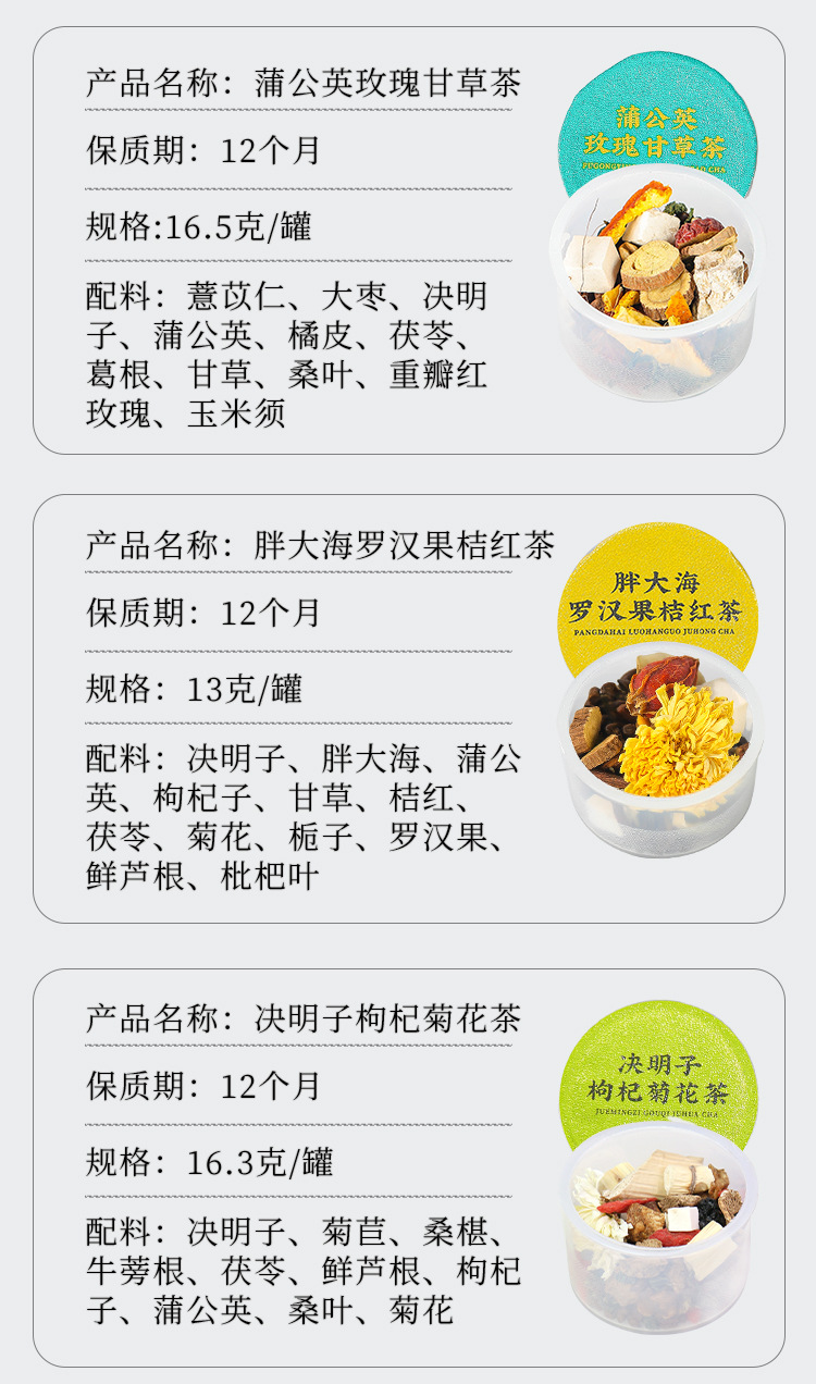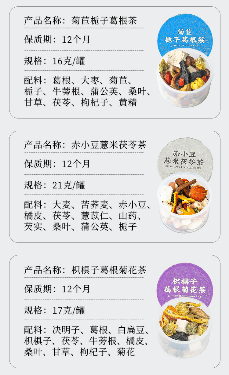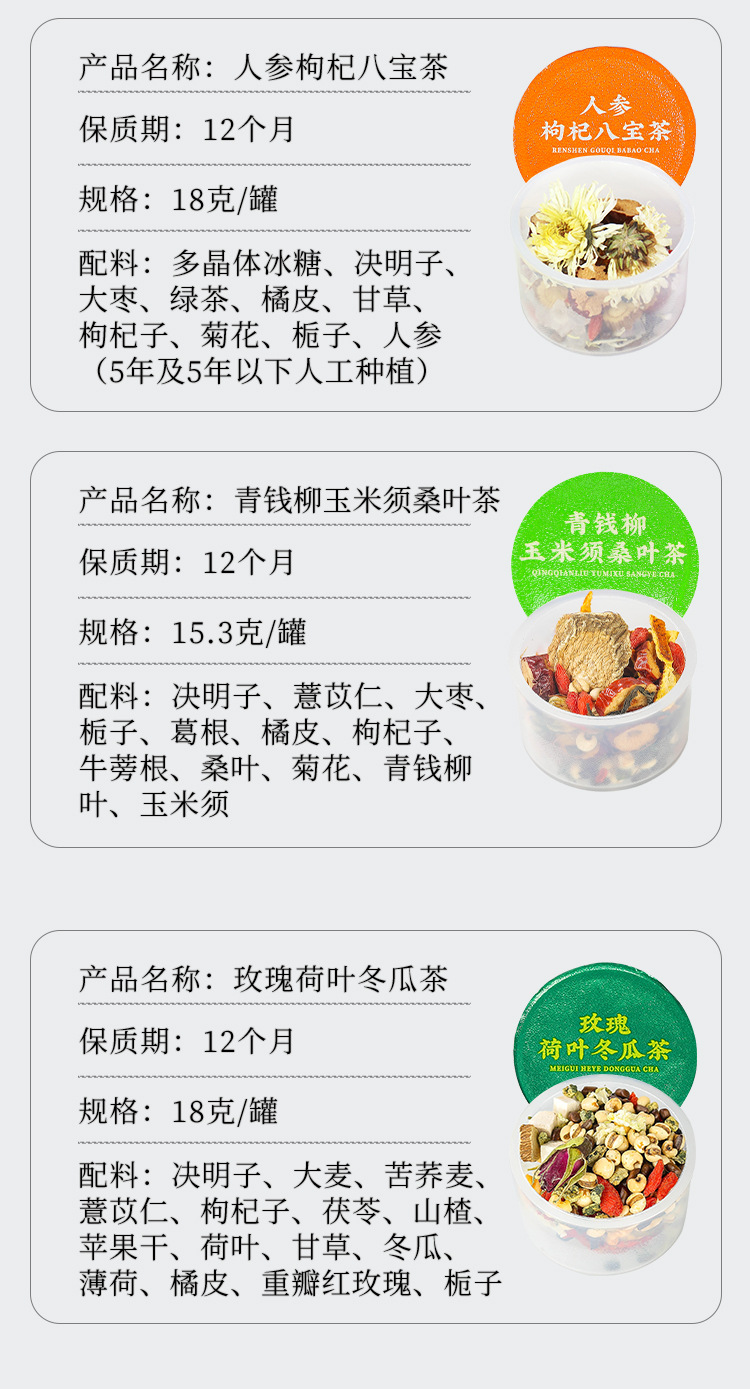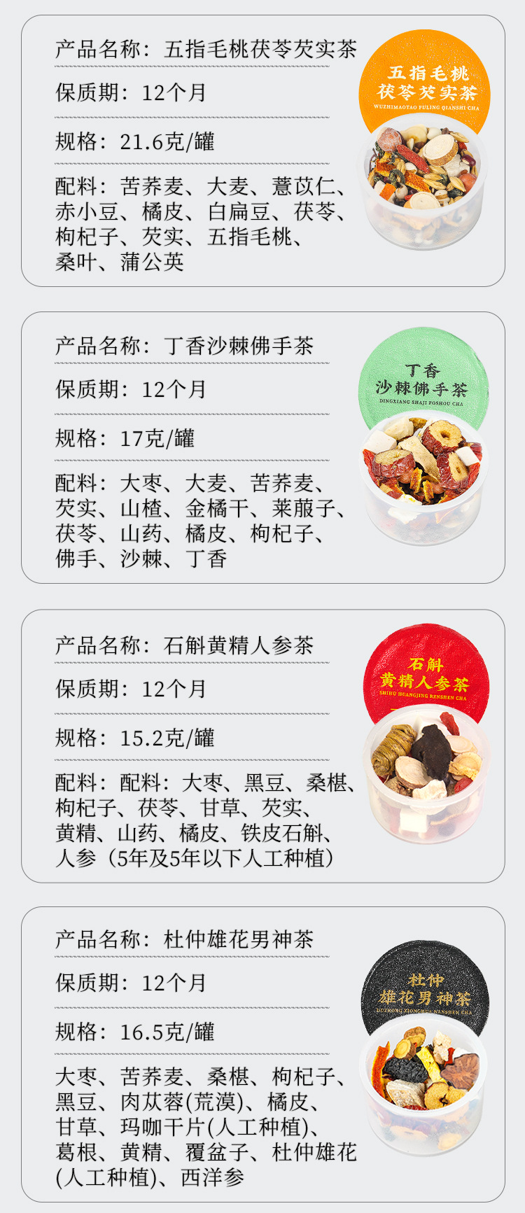 Чай «Пять пальцев персик», тукхахо и горгон (одинарная банка); Чай с бобами аджику, ячменем и порией (одна банка); Чай с кассией, ягодами годжи и хризантемой (одинарная банка); Чай из семян цизипуса, пории и лилии (одна банка); Чай с одуванчиком и розой солодки (одна банка); Зимний дынный чай с листьями розы и лотоса (одна банка); Чай из кукурузного шелка и листьев шелковицы Цинцянлиу (одна банка); Чай с цикорием, гарднией и пуэрарией (одинарная банка); Чай Zhi Zhi Zi Pueraria lobata с хризантемой (одна банка); Жирный морской чай Луо Хан Гуо, апельсиновый черный (одна банка); Чай Eucommia Male Flower Male God (одинарная банка); Чай с женьшенем, шелковицей и ягодами лаврера (одна банка); Чай с женьшенем Dendrobium Polygonatum (одна банка); Чай красного женьшеня и богини Эцзяо (одна банка); Чай Bamboo Cane Maogen Sydney (одна банка); Мужской цветочный чай с женьшенем, полигонатумом и эукоммией (одна банка); Чай с американским женьшенем, дендробиумом и хризантемой (одинарная банка); Чай Double Ginseng and Astragalus Goddess (одна банка); Чай Роза Жасмин Розель (одинарная банка); Ганодерма луцидум, шелковица и девять черных чаев (одна банка); Чай из коричневого сахара, розы и имбиря (одна банка); Чай с гвоздикой, облепихой и бергамотом (одинарная банка); Чай с пионом, ягодами годжи и ямом (одинарная банка)
