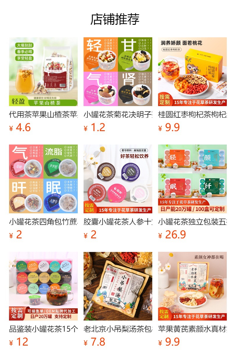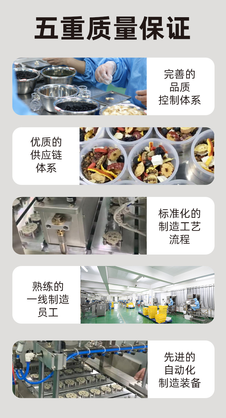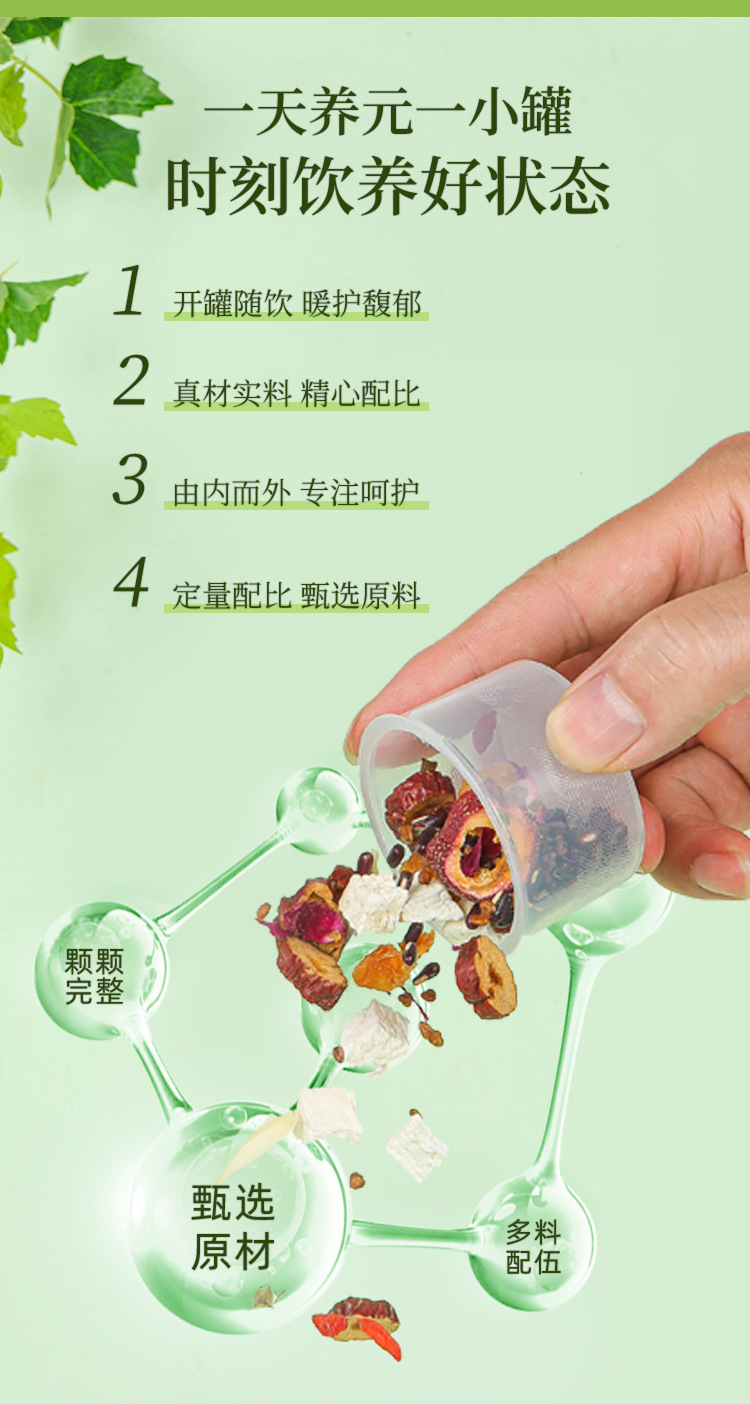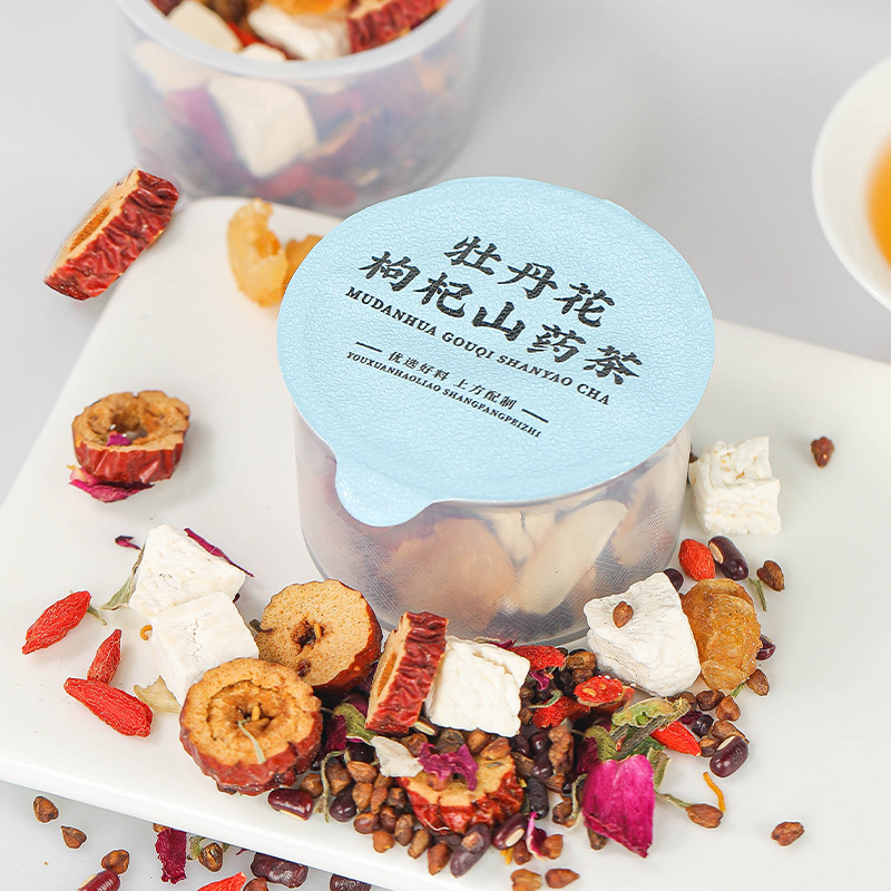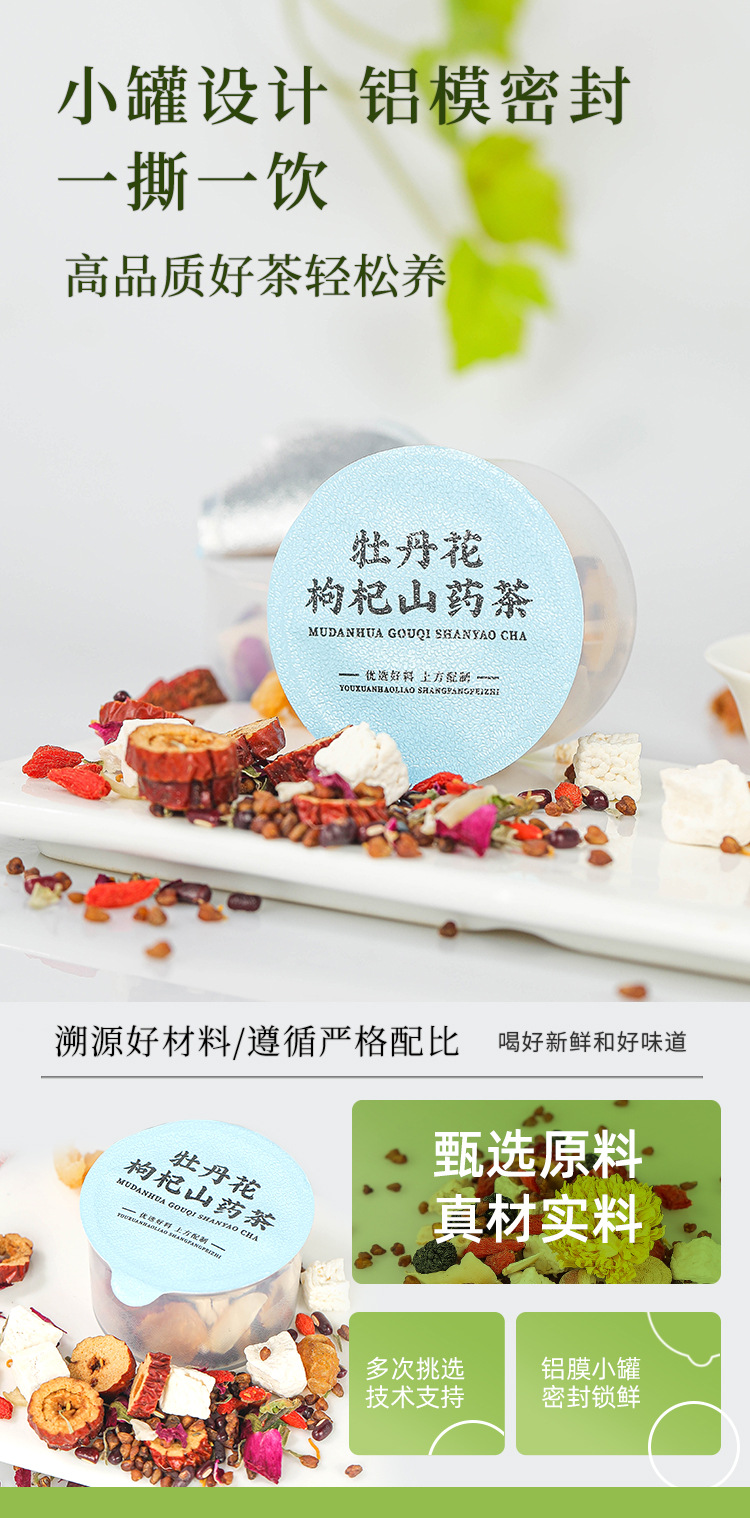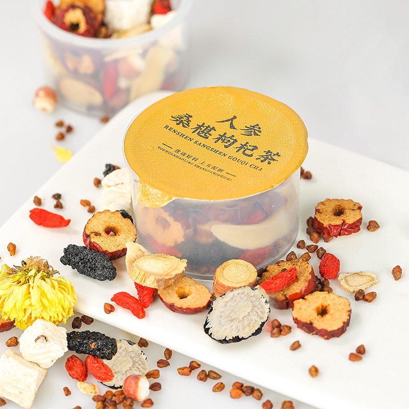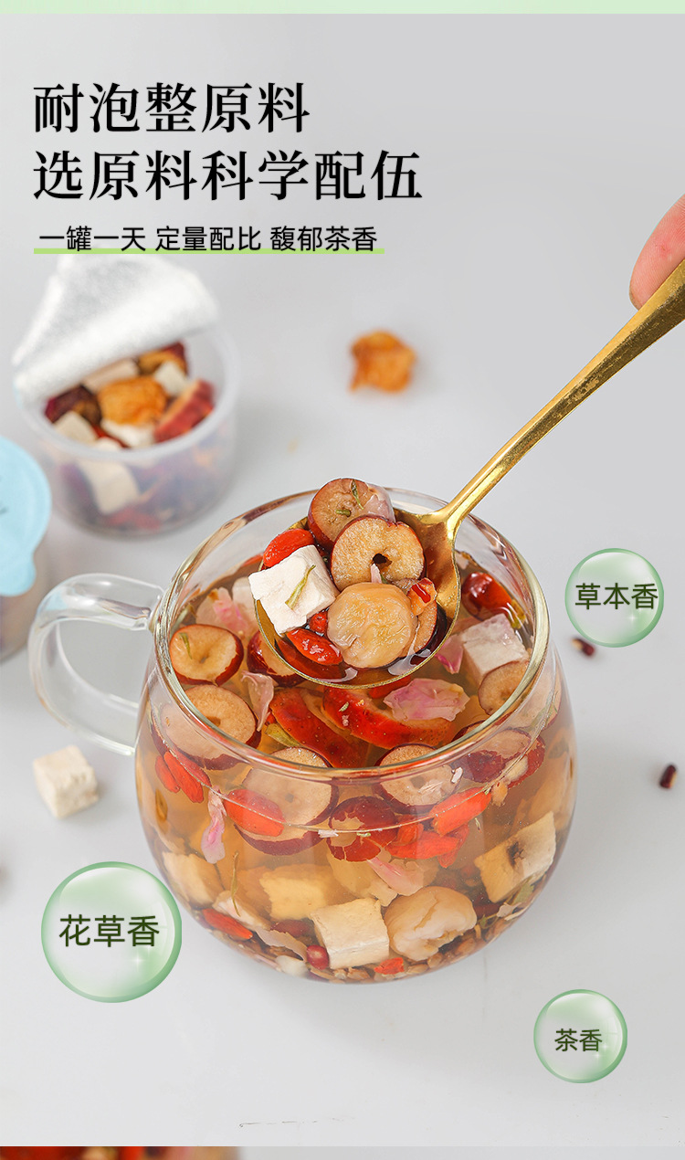 Чай «Пять пальцев персик», тукхахо и горгон (одинарная банка); Чай с бобами аджику, ячменем и порией (одна банка); Чай с кассией, ягодами годжи и хризантемой (одинарная банка); Чай из семян цизипуса, пории и лилии (одна банка); Чай с одуванчиком и розой солодки (одна банка); Зимний дынный чай с листьями розы и лотоса (одна банка); Чай из кукурузного шелка и листьев шелковицы Цинцянлиу (одна банка); Чай с цикорием, гарднией и пуэрарией (одинарная банка); Чай Zhi Zhi Zi Pueraria lobata с хризантемой (одна банка); Жирный морской чай Луо Хан Гуо, апельсиновый черный (одна банка); Чай Eucommia Male Flower Male God (одинарная банка); Чай с женьшенем, шелковицей и ягодами лаврера (одна банка); Чай с женьшенем Dendrobium Polygonatum (одна банка); Чай красного женьшеня и богини Эцзяо (одна банка); Чай Bamboo Cane Maogen Sydney (одна банка); Мужской цветочный чай с женьшенем, полигонатумом и эукоммией (одна банка); Чай с американским женьшенем, дендробиумом и хризантемой (одинарная банка); Чай Double Ginseng and Astragalus Goddess (одна банка); Чай Роза Жасмин Розель (одинарная банка); Ганодерма луцидум, шелковица и девять черных чаев (одна банка); Чай из коричневого сахара, розы и имбиря (одна банка); Чай с гвоздикой, облепихой и бергамотом (одинарная банка); Чай с пионом, ягодами годжи и ямом (одинарная банка)