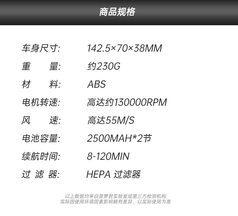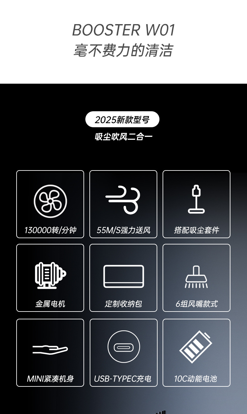 W01 черный, обычная модель 1500 мАч; W01 черный-2000 мАч обычная модель; Модернизированная коробка 130 000 об/мин-2500 мАч (1 воздушное сопло); Флагманская упаковка 130 000 об/мин-2500 мАч (6 воздушных насадок); 130 000 об/мин — блок емкостью 2500 мАч (6 воздушных насадок + аксессуары для вакуума); 130 000 об/мин — модернизированная коробка 4000 мАч (1 воздушное сопло); 130 000 об/мин — флагманская упаковка 4000 мАч (6 воздушных насадок)