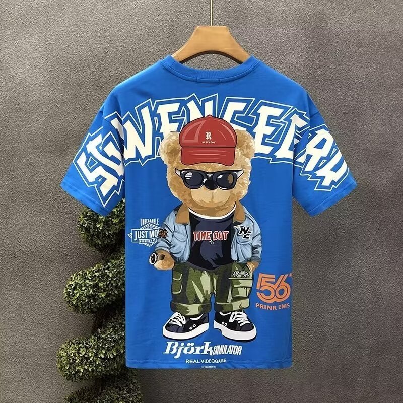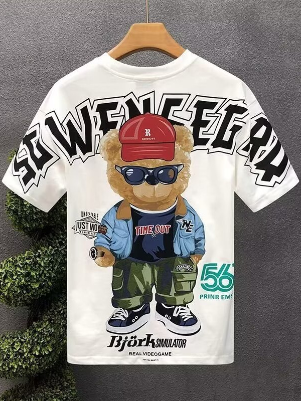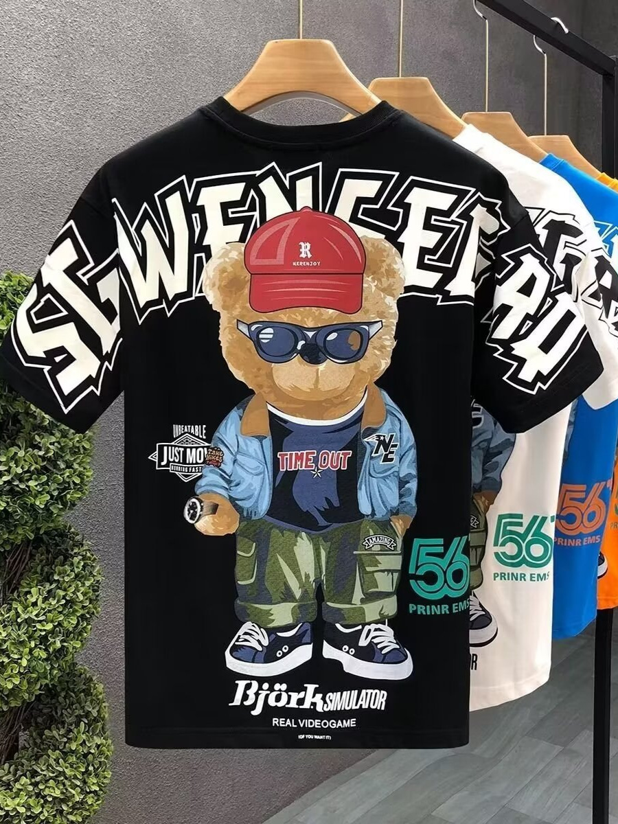Высококачественная хлопковая Футболка с заниженными плечами, Мужская 2024, Летний Новый модный бренд, топ с коротким рукавом, Забавный мультяшный медведь, футболка