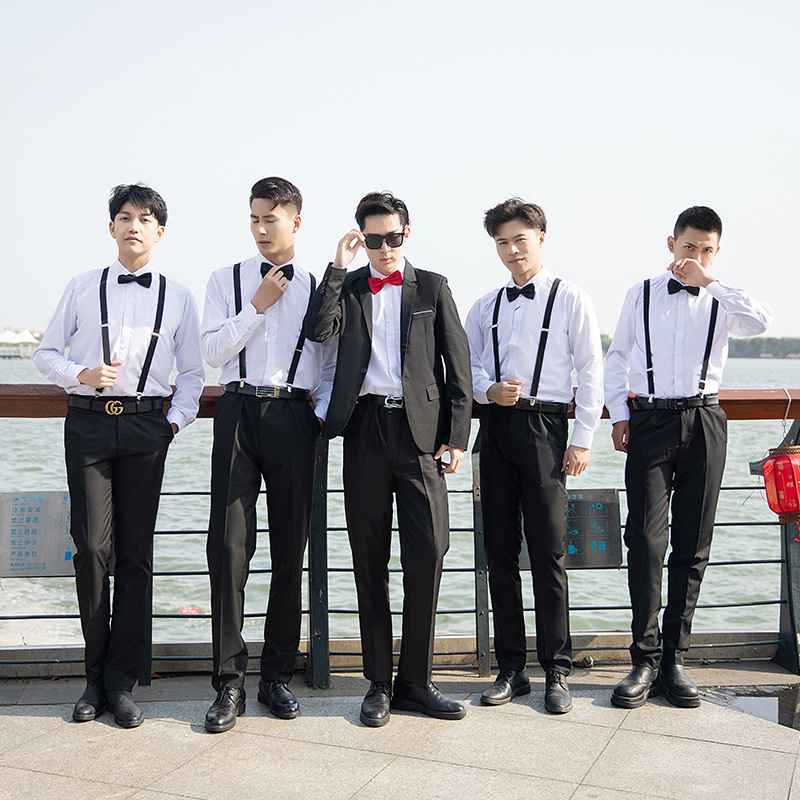 Черные брюки + белая рубашка + черный галстук-бабочка; Черные брюки + черный жилет + черный галстук-бабочка; Черный жилет + рубашка + черный галстук-бабочка; Черные брюки + черный жилет + рубашка + черный галстук-бабочка