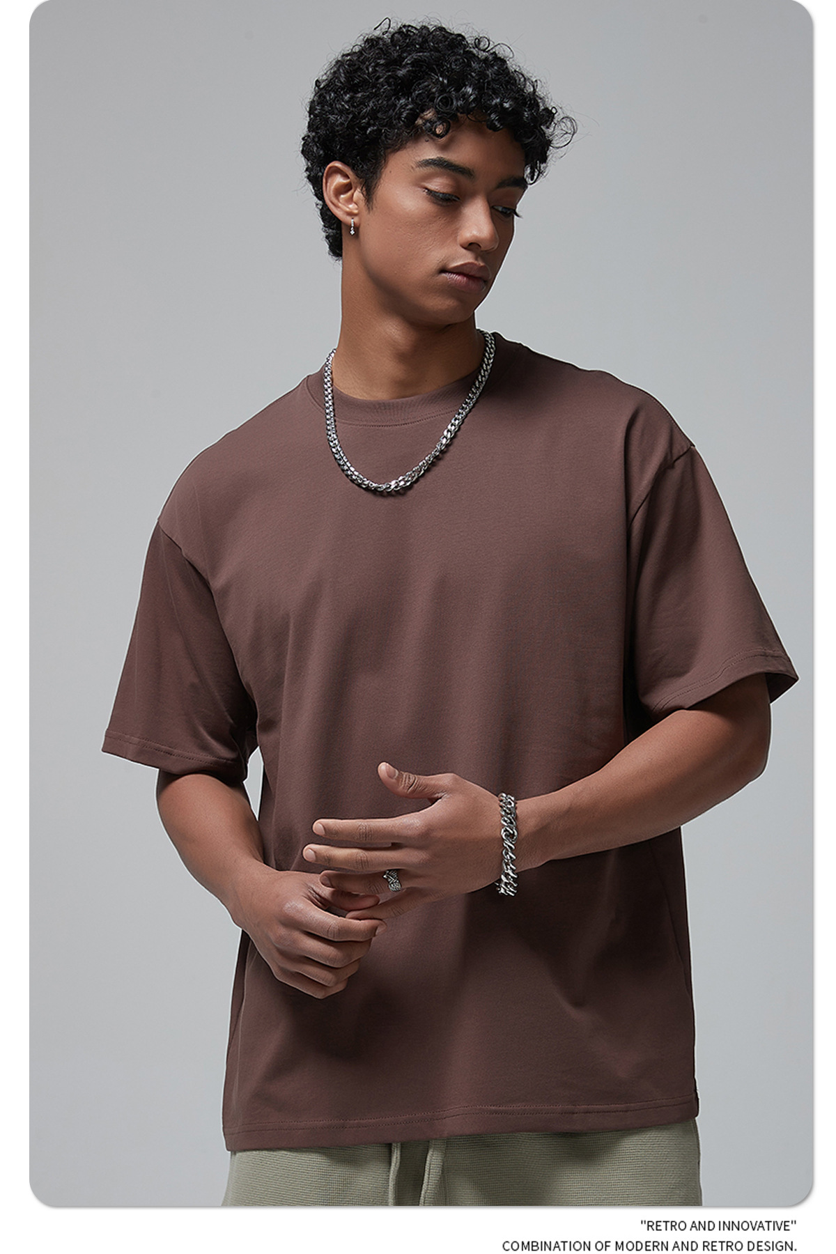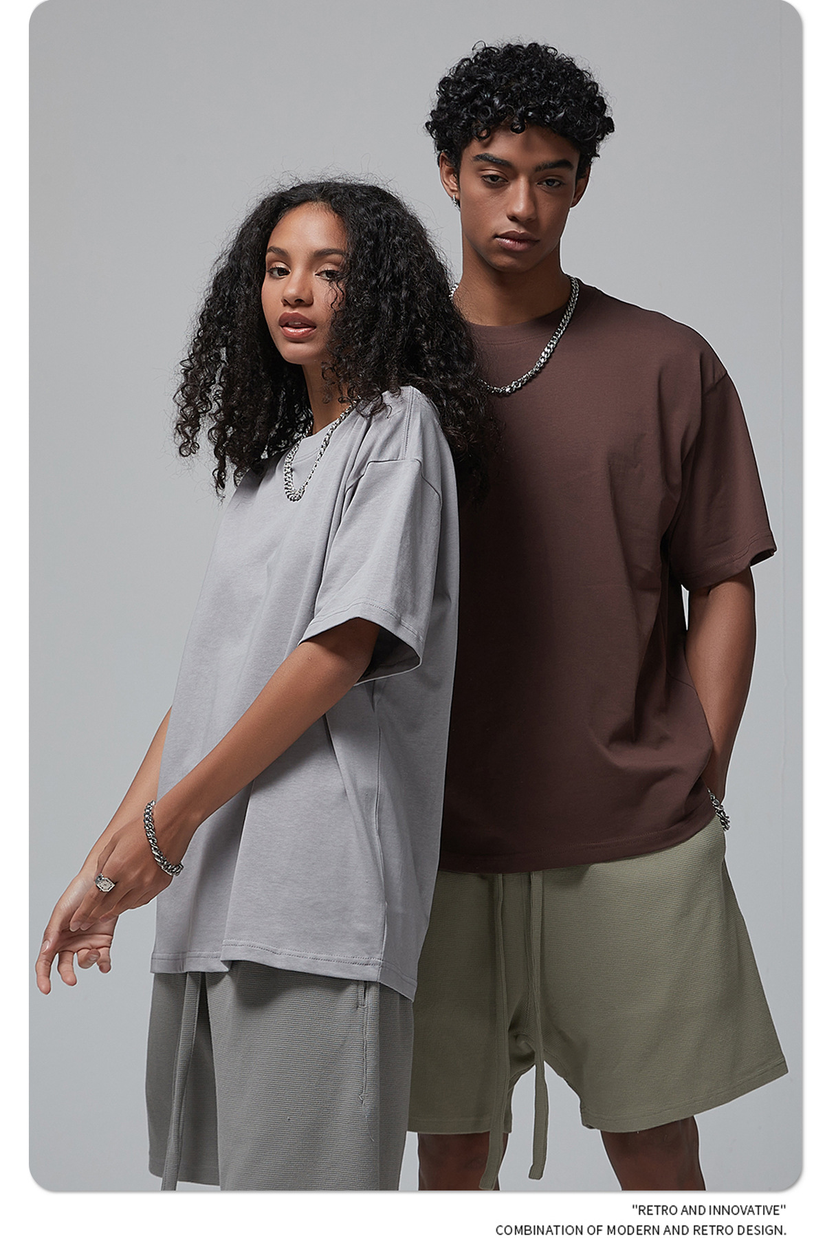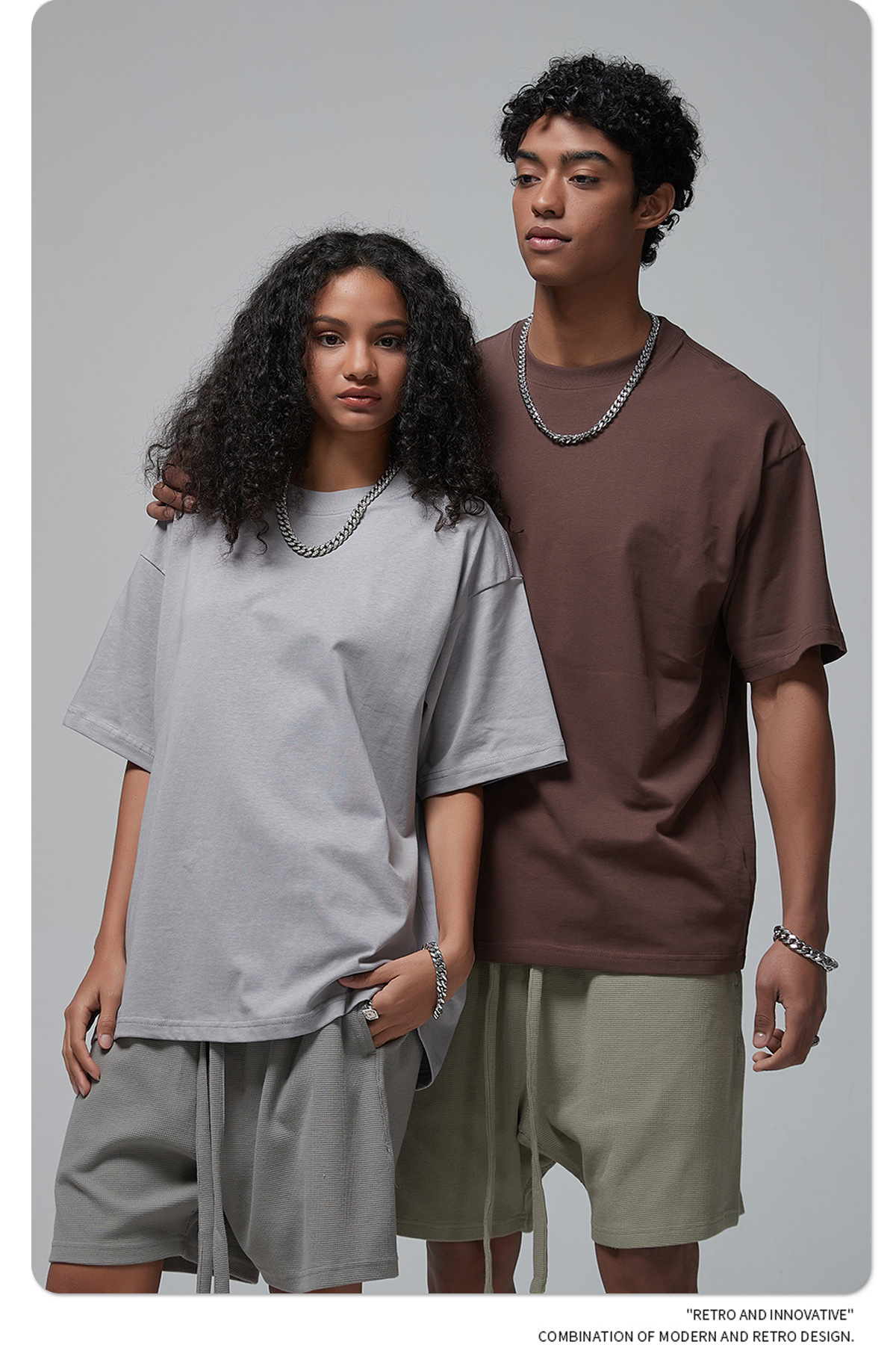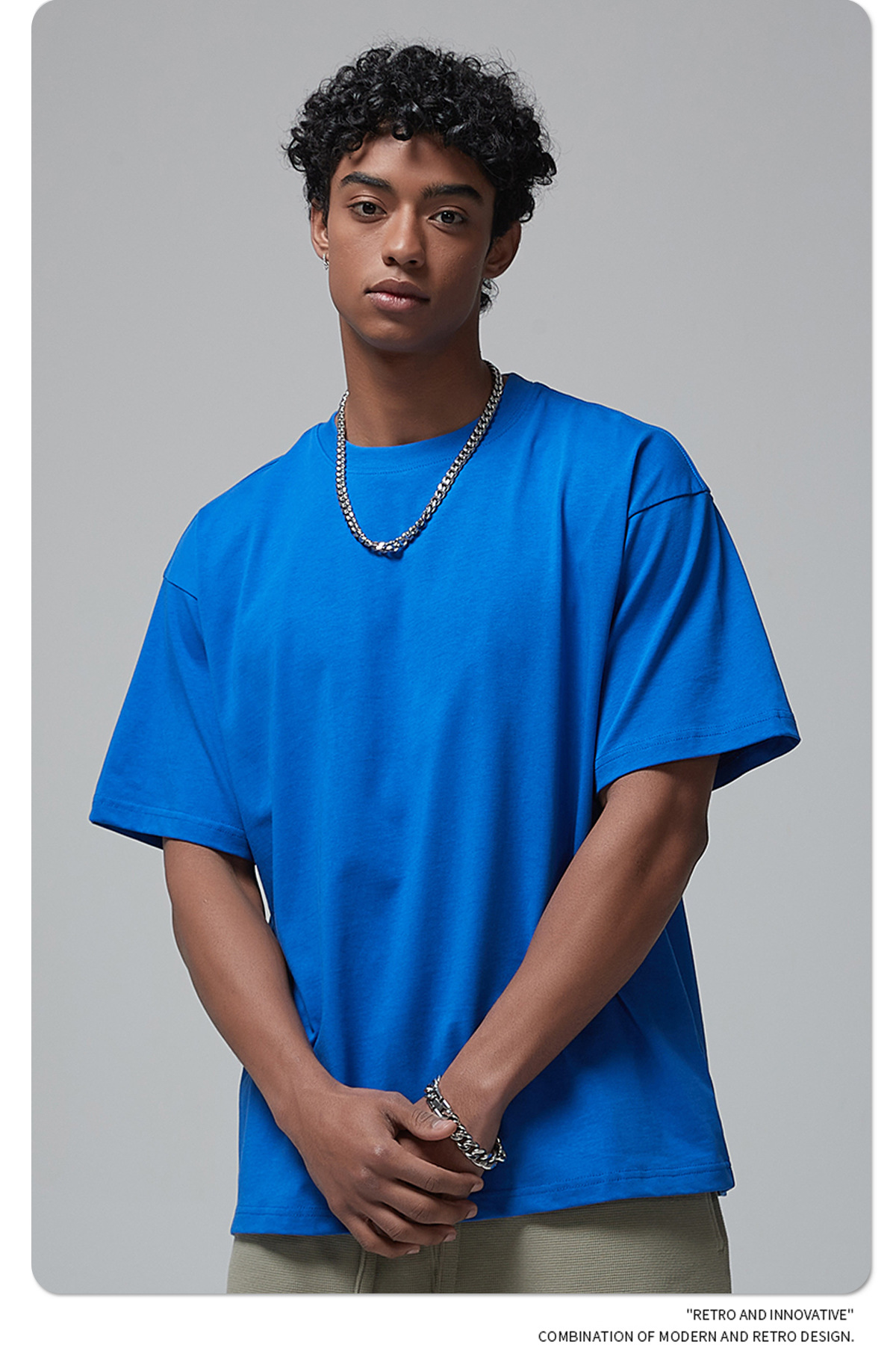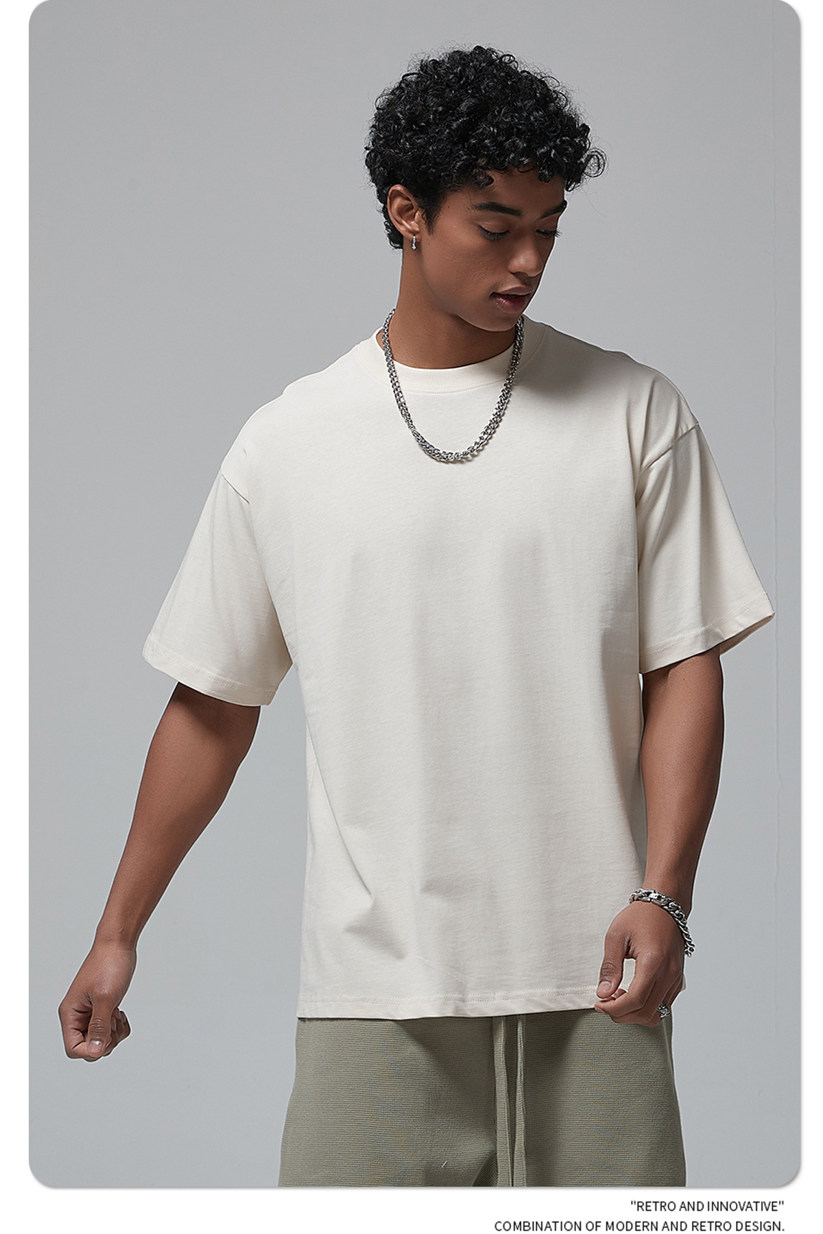 Мужская футболка унисекс из чистого хлопка, летняя, 2025, двойная пряжа, 230 г, со спущенным плечом, свободный крой, в американском стиле, модная, брендовая, без принта, с коротким рукавом