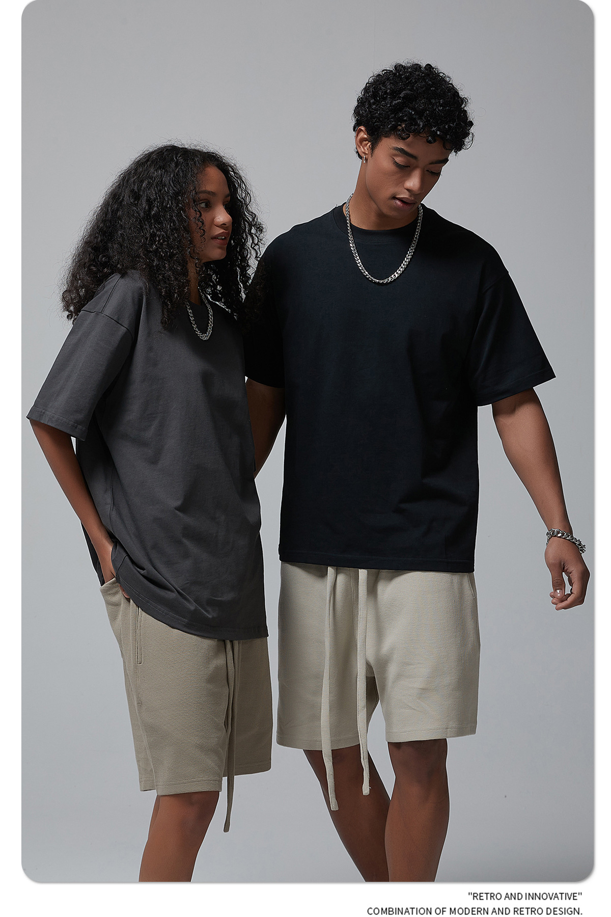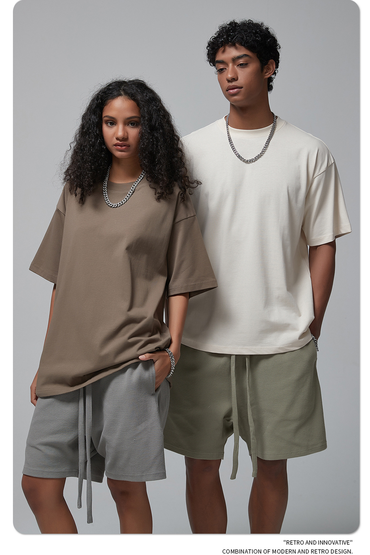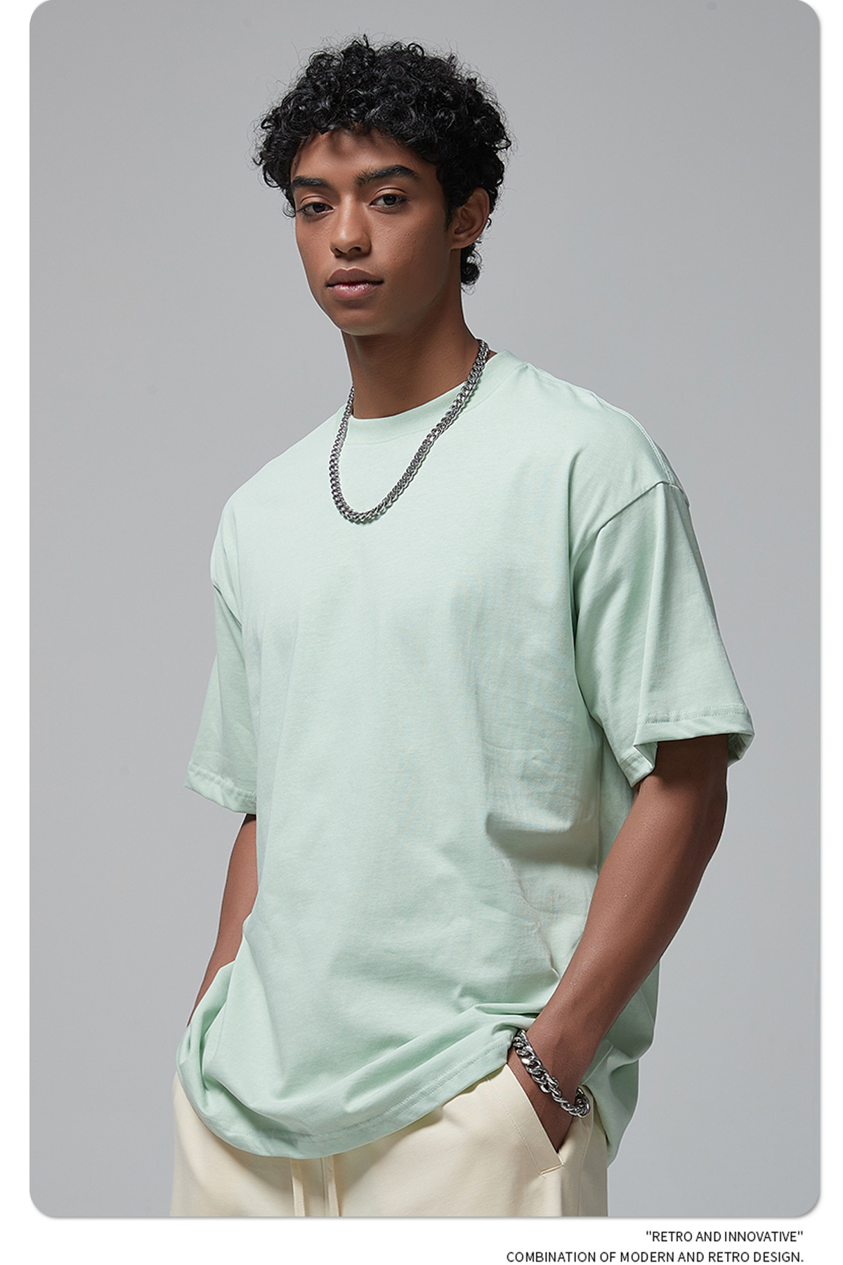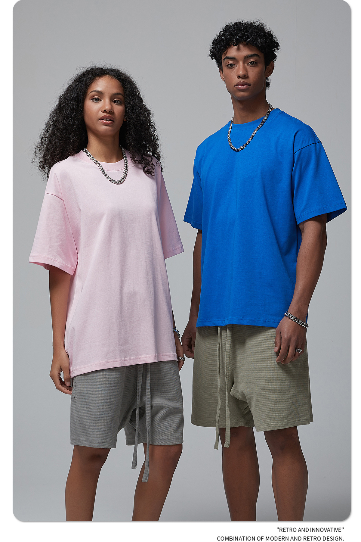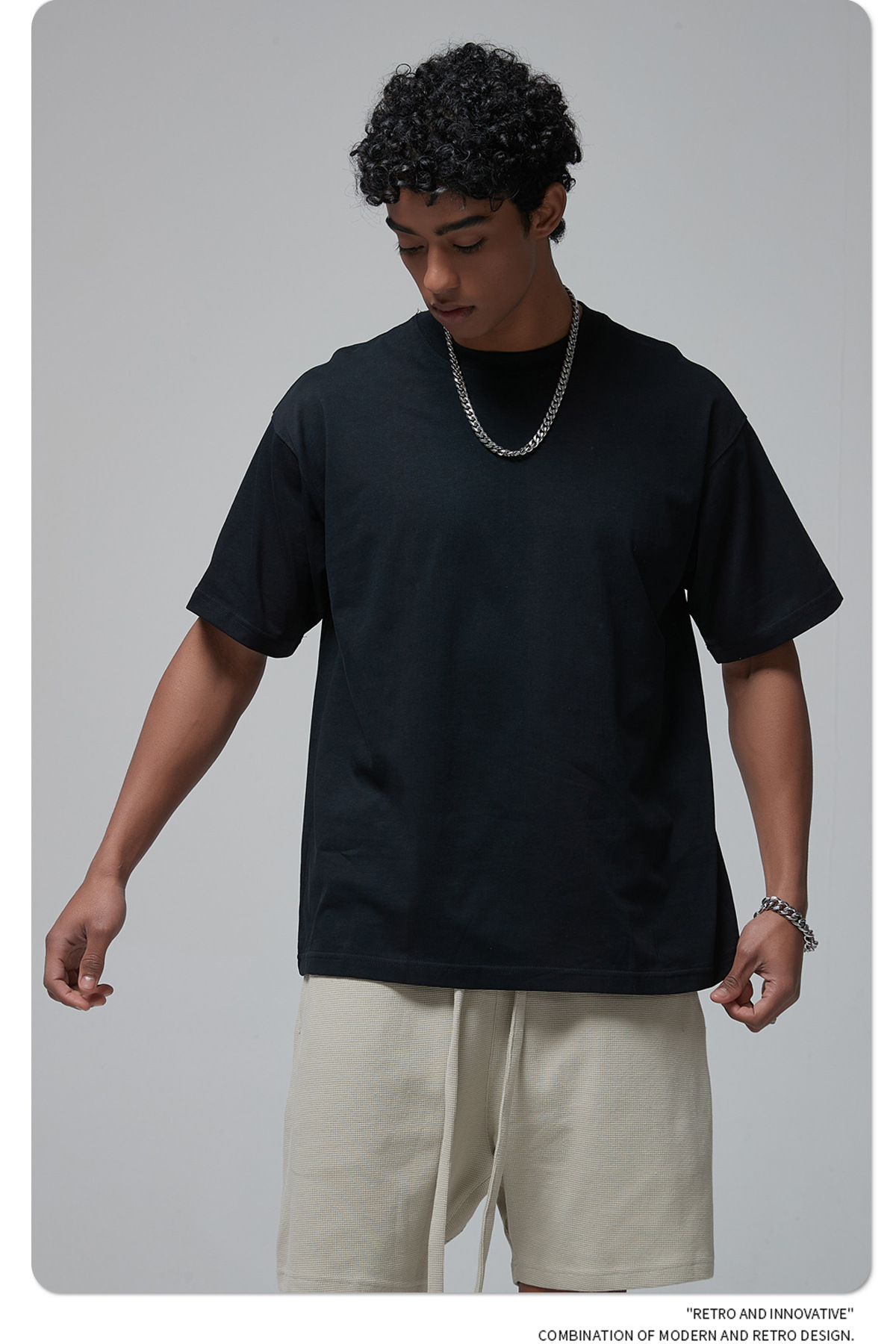 Мужская футболка унисекс из чистого хлопка, летняя, 2025, двойная пряжа, 230 г, со спущенным плечом, свободный крой, в американском стиле, модная, брендовая, без принта, с коротким рукавом