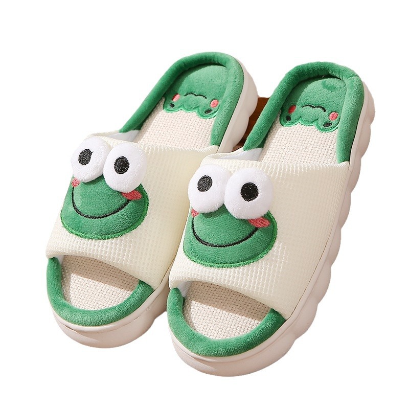 新款春夏季男女生居家情侣亚麻拖鞋四季防滑厚底卡通青蛙凉拖批发
