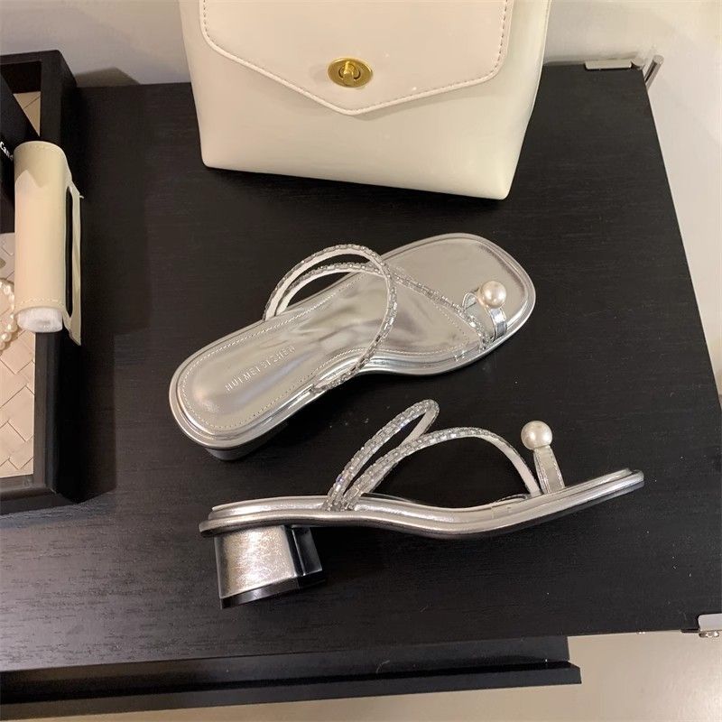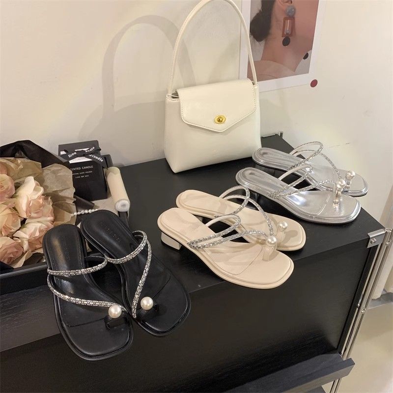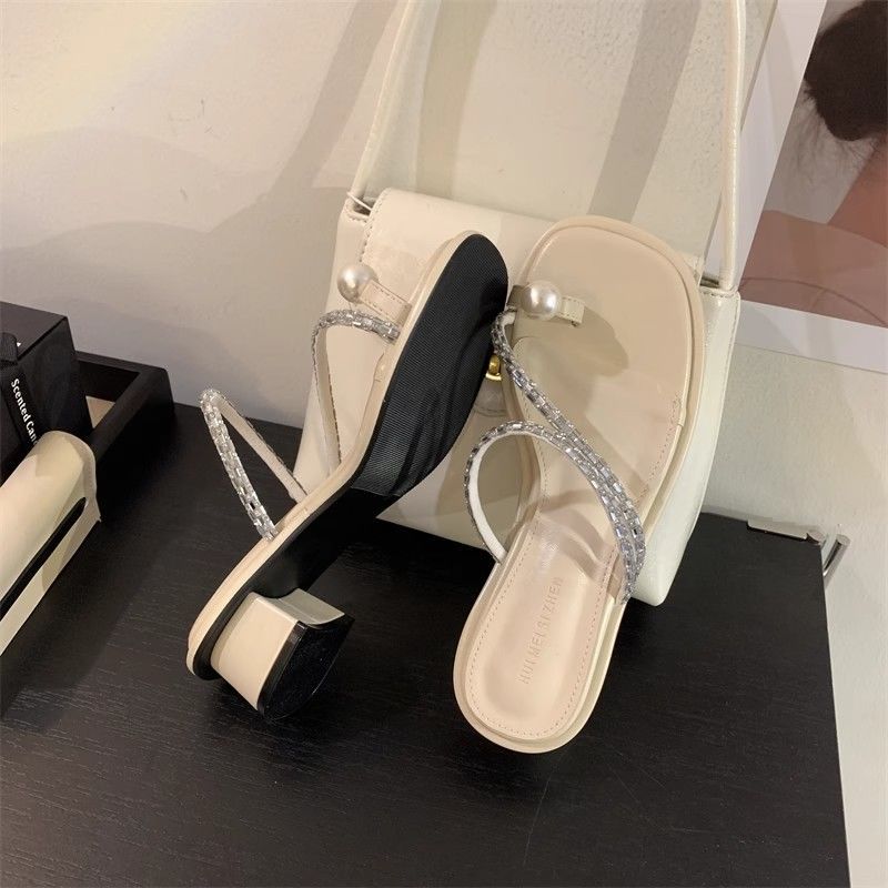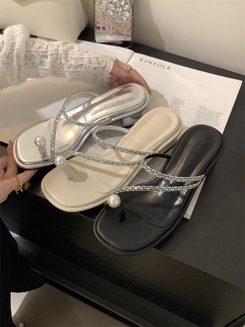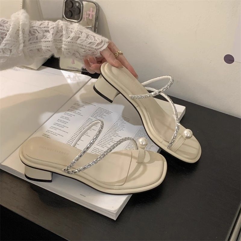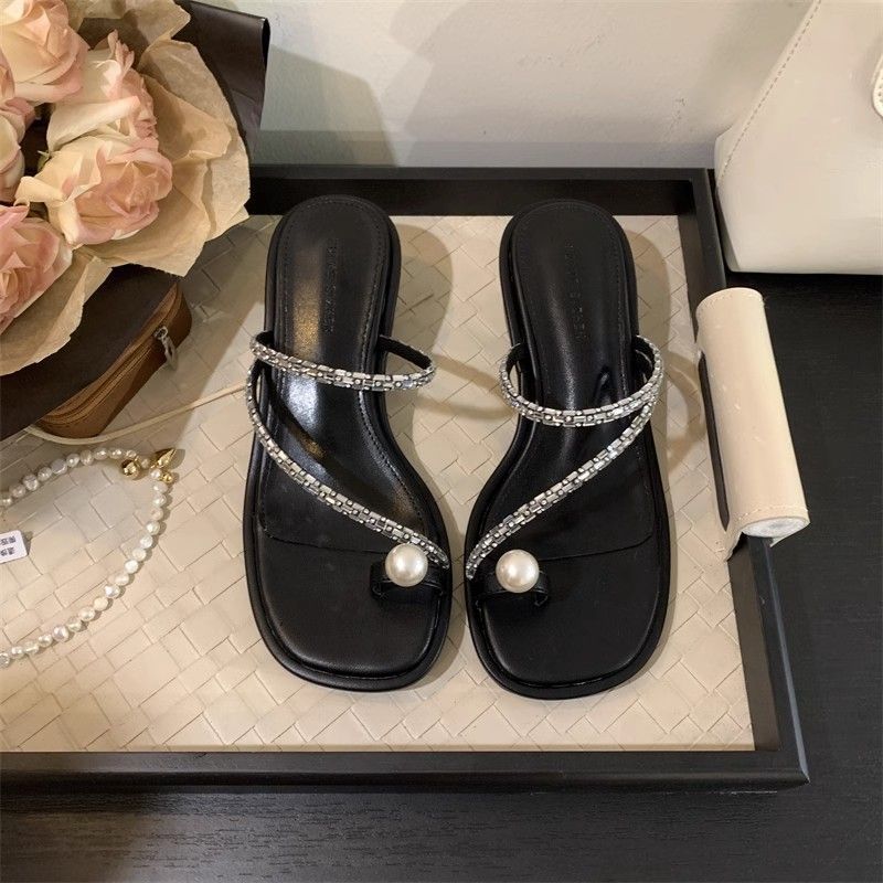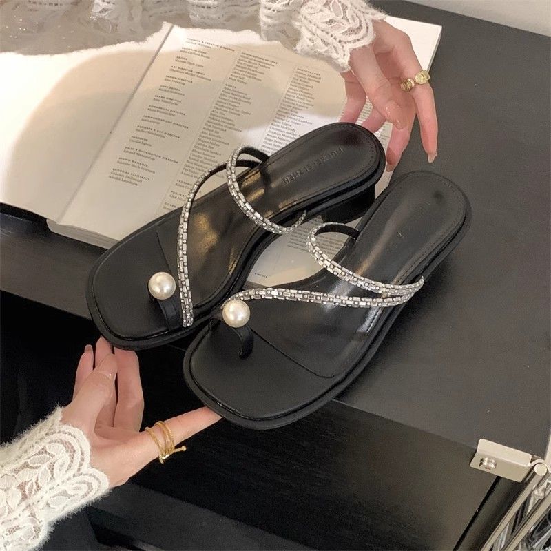 Фея стиль толстый на каблуке с жемчужным шлепанцем для женщин, носящая 2024 новые стразы