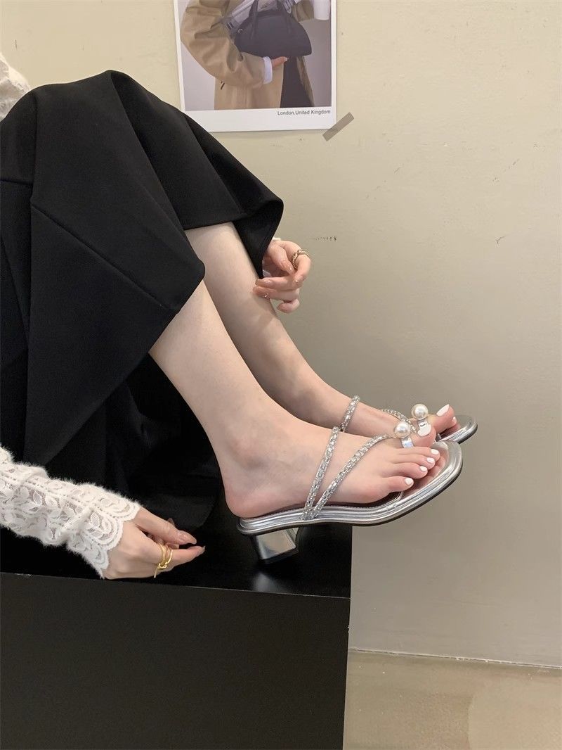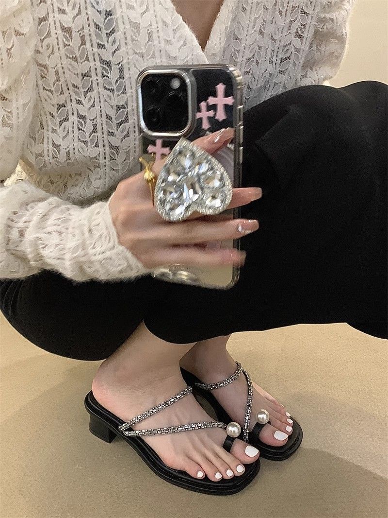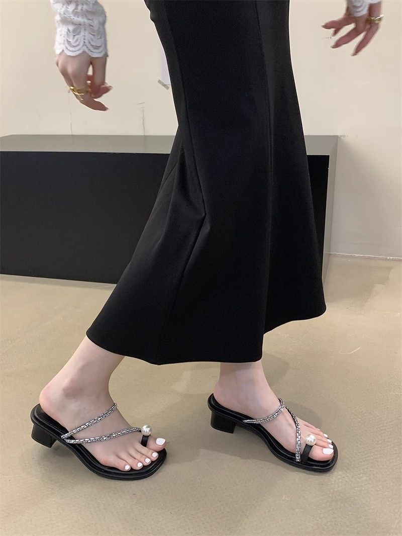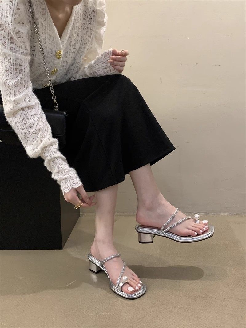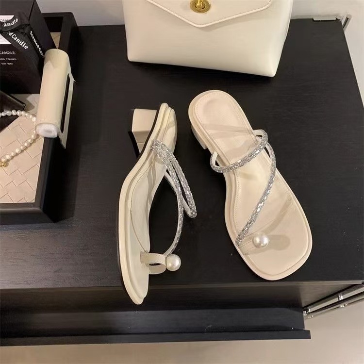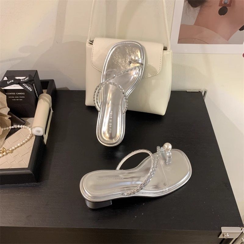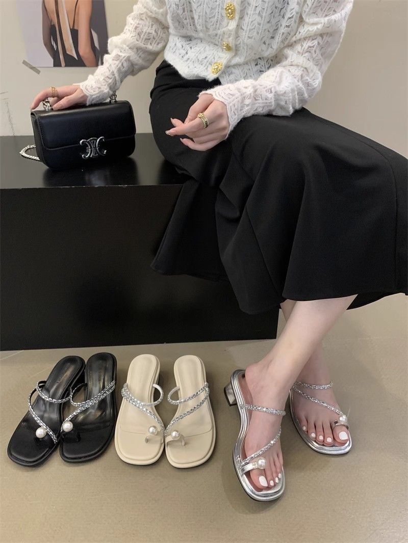 Фея стиль толстый на каблуке с жемчужным шлепанцем для женщин, носящая 2024 новые стразы