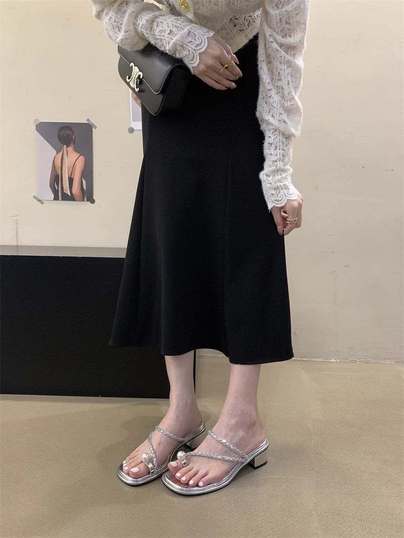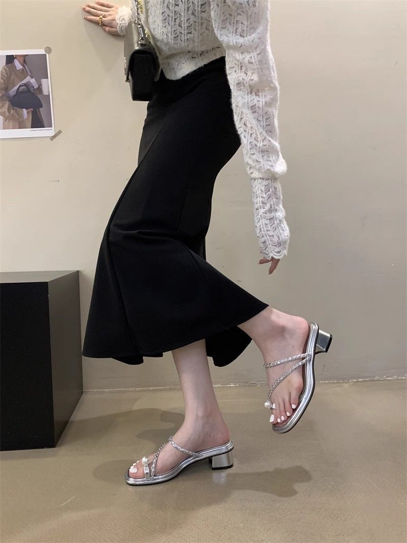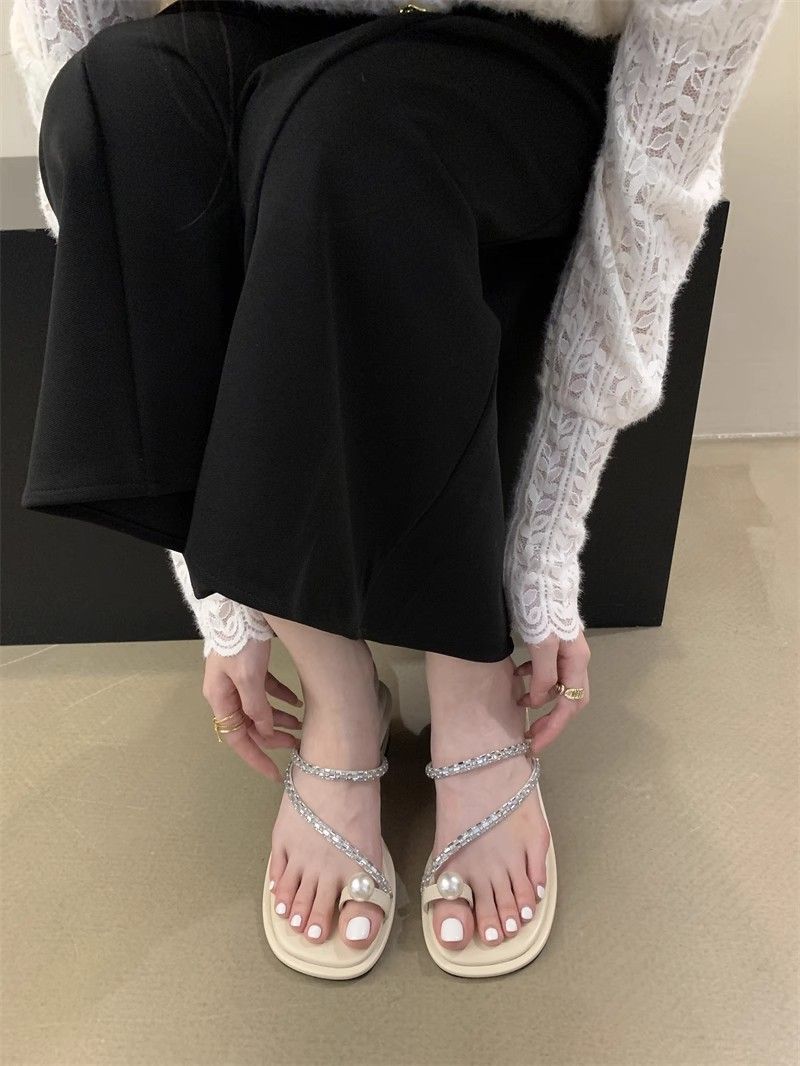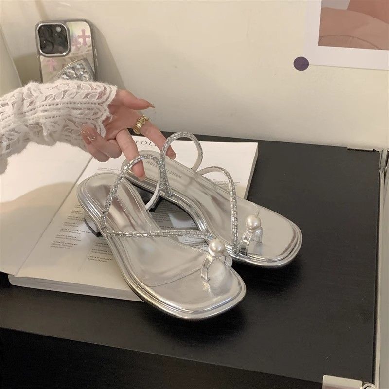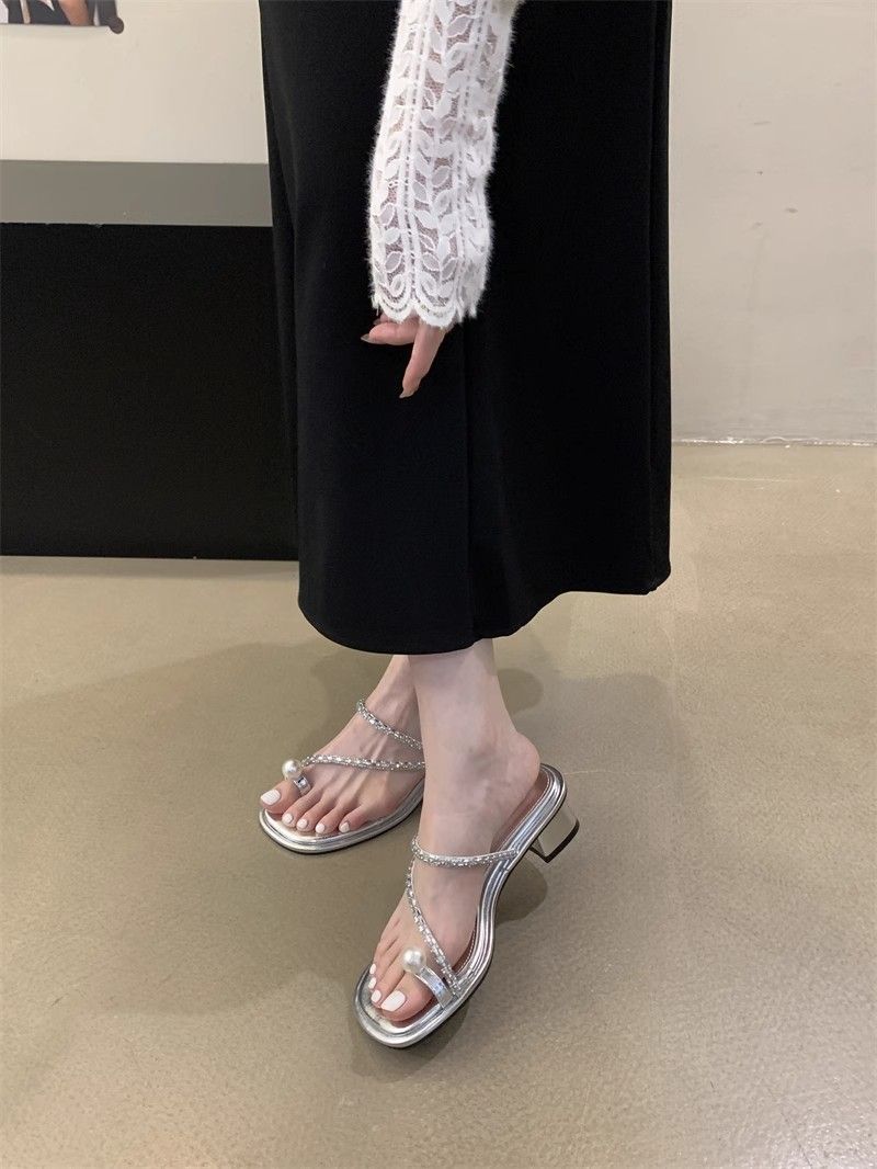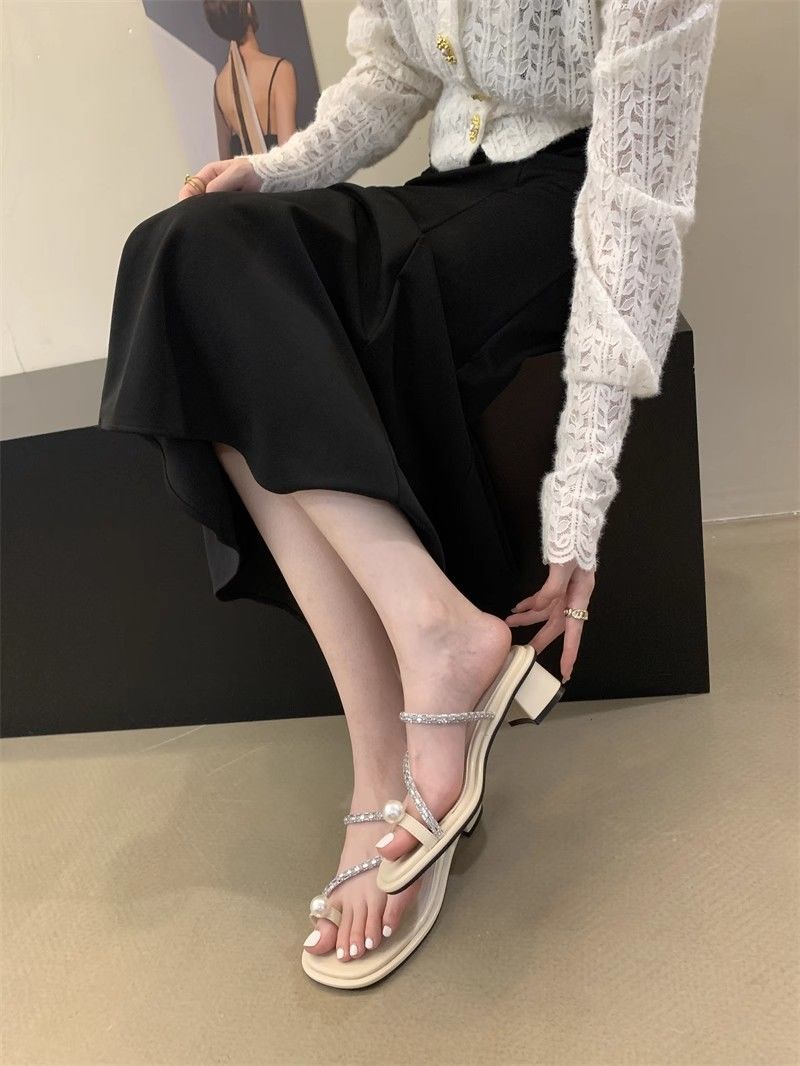 Фея стиль толстый на каблуке с жемчужным шлепанцем для женщин, носящая 2024 новые стразы