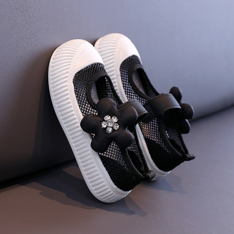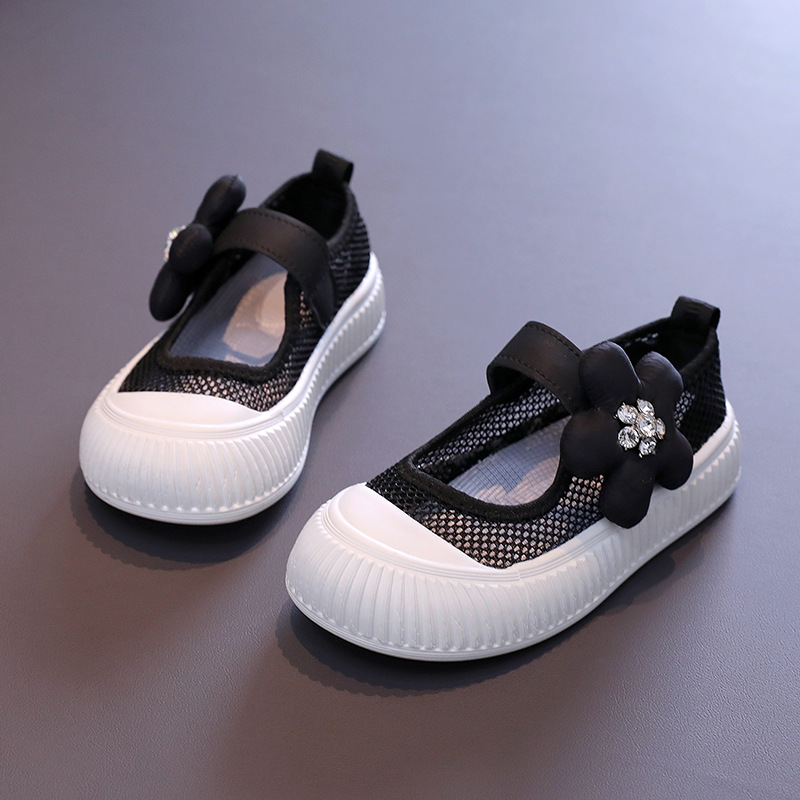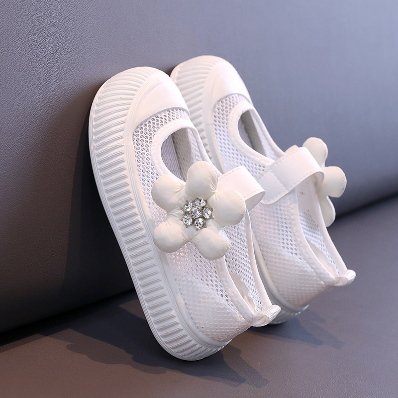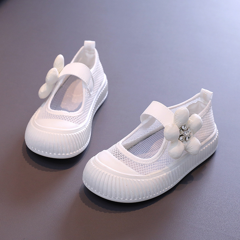 Детские стразы большие цветочные туфли 2024 летняя новая девушка сетка мелко рот маленькие белые туфли маленькие дети повседневные туфли