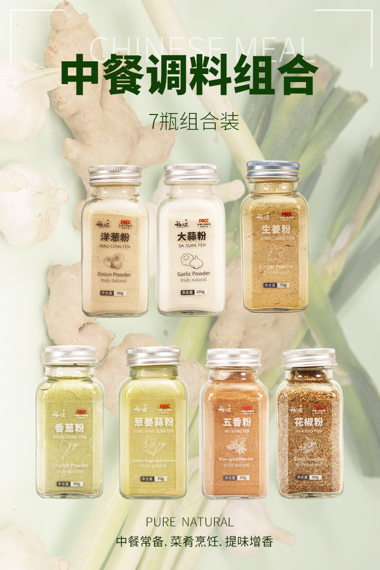 Луковый порошок 90г; 100 г чесночного порошка; 80 г порошка из пяти специй; 70 г порошка чили; 70 г порошка лука, имбиря и чеснока; 80 г порошка куркумы; 80 г порошка корицы; 80 г порошка сичуаньского перца; 70 г имбирного порошка; Порошок зеленого лука 70г