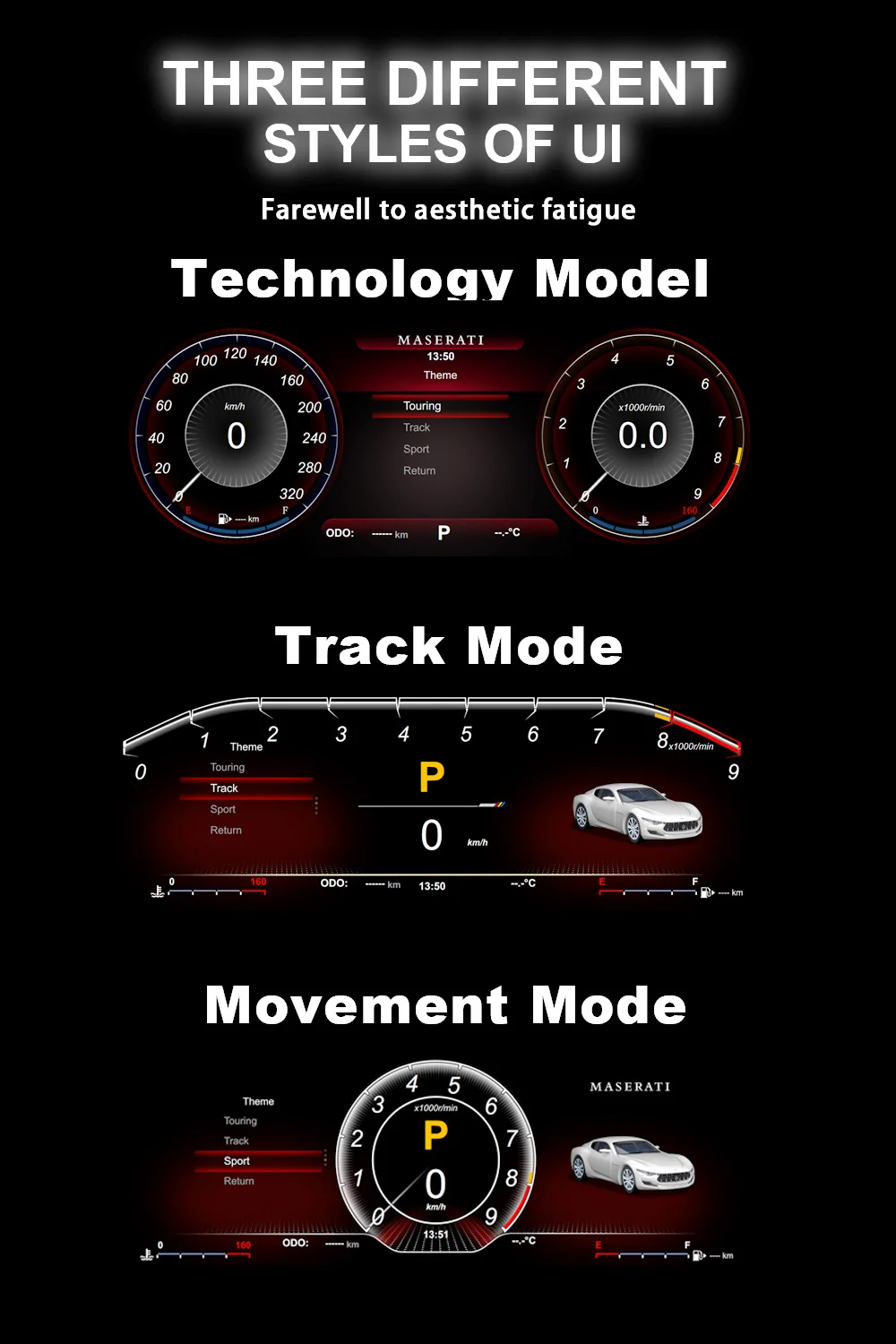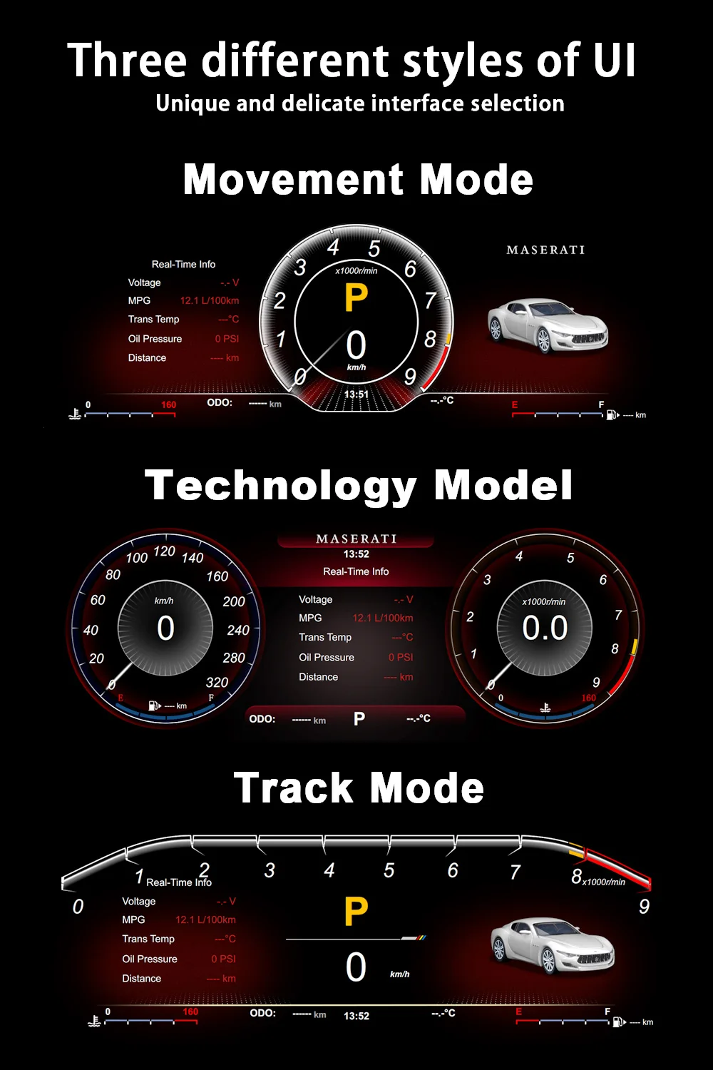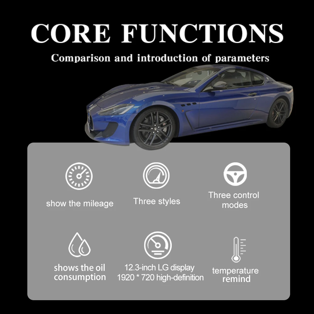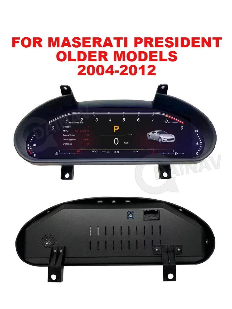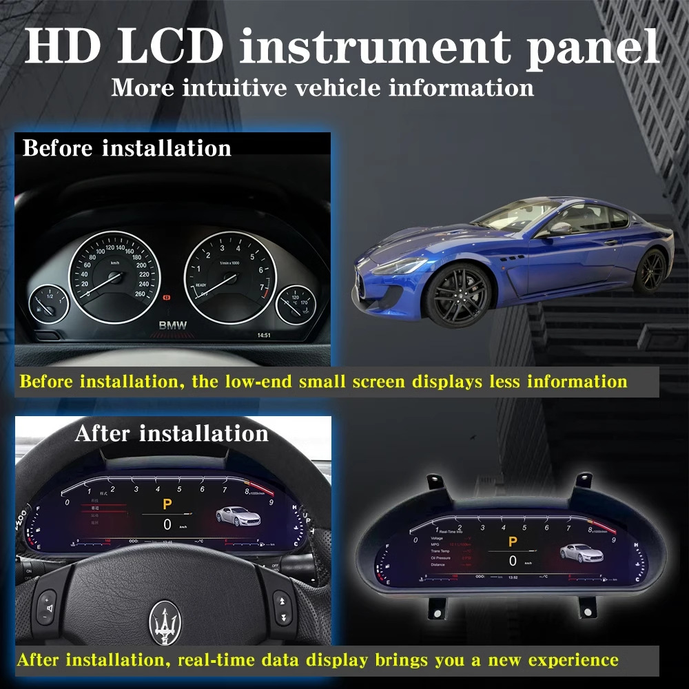 Maserati GT 2001-2018model year (Maserati Oldsmobile LCD instrument 2004-2012optional) + LINUX system + 12.3-inch HD display+ CPU4 core_main frequency 1.5GHZ + 1G running memory + 4G storage +1920*720 HDresolution