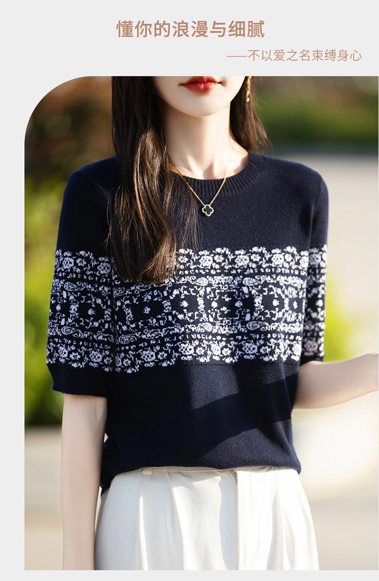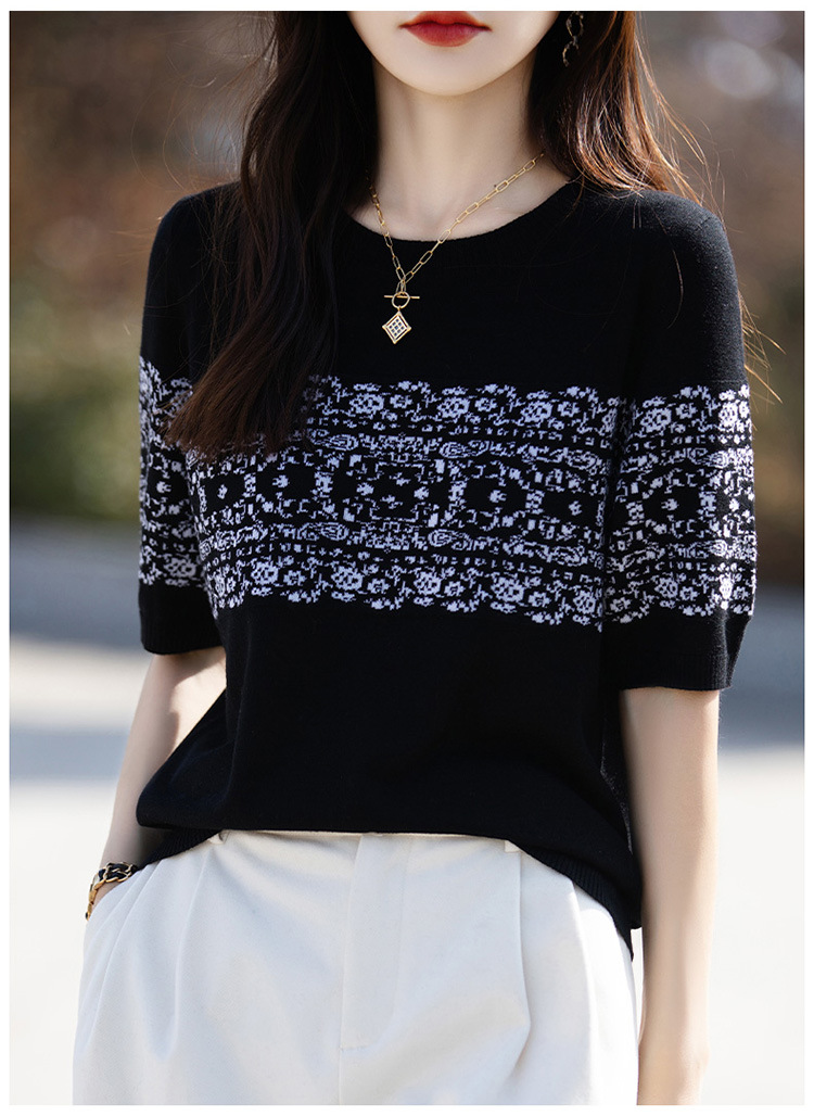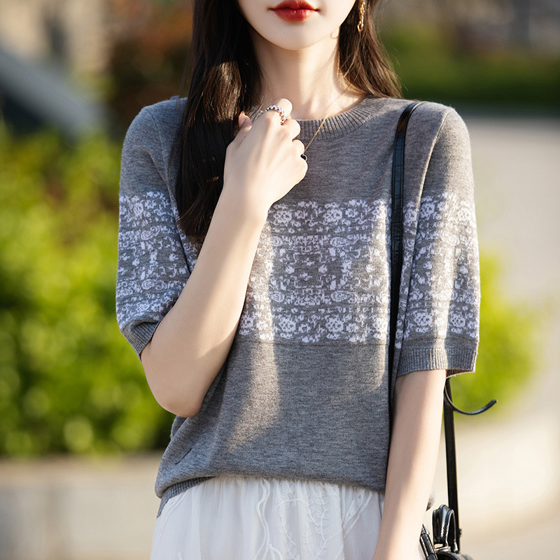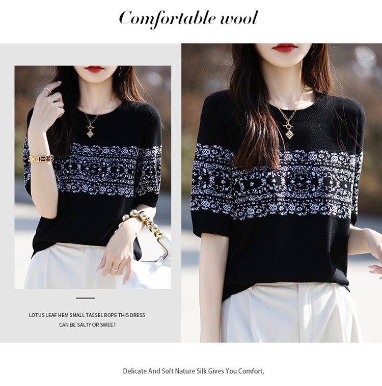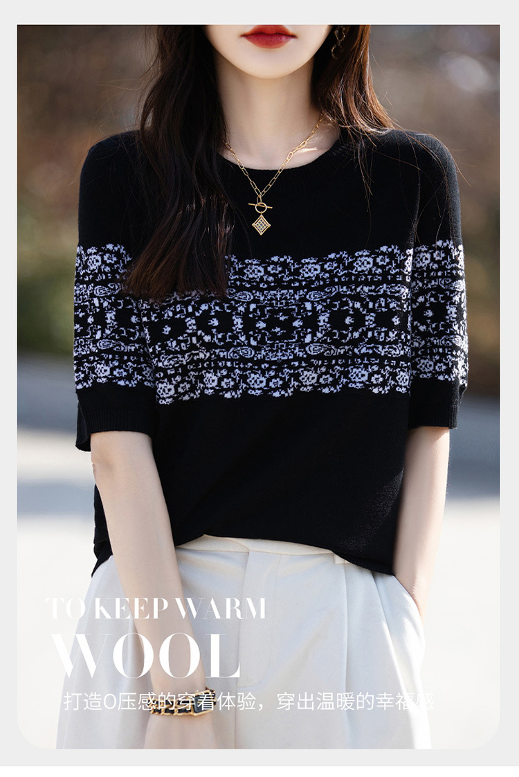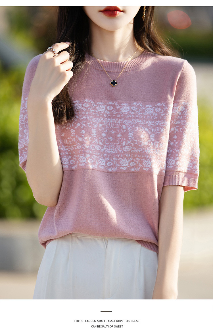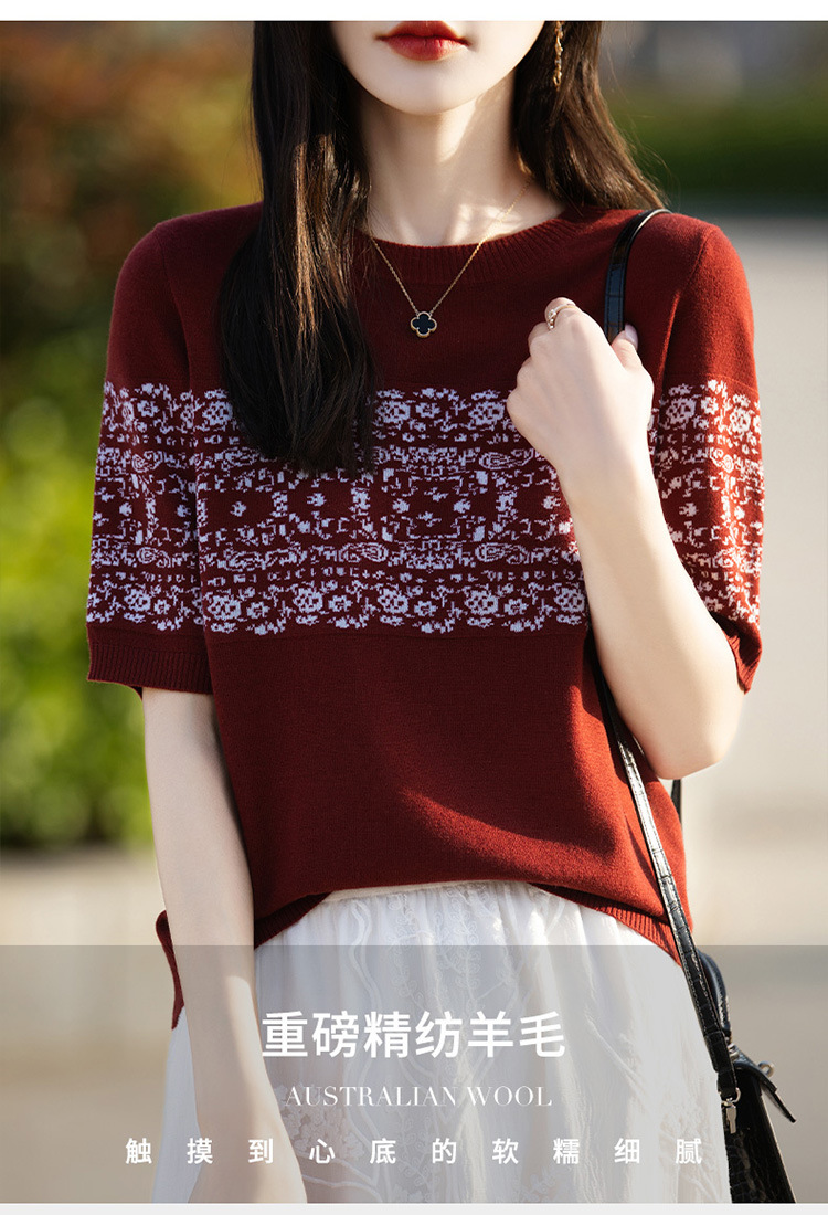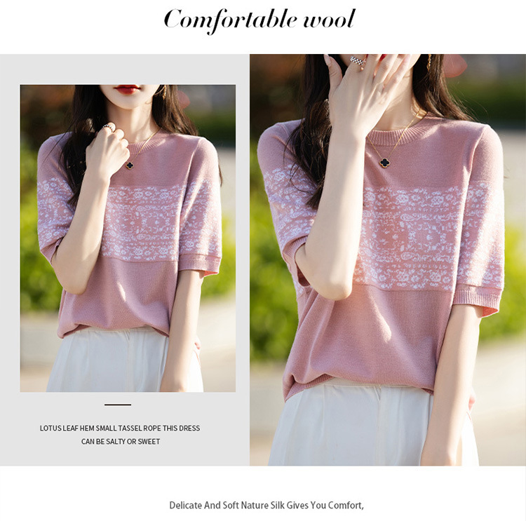 2024 лето новый камвольный шерстяной свитер с короткими рукавами женский округлый воротник жаккардовый цвет свободный модный топ