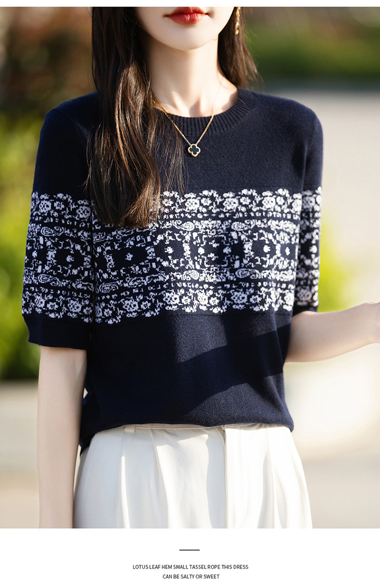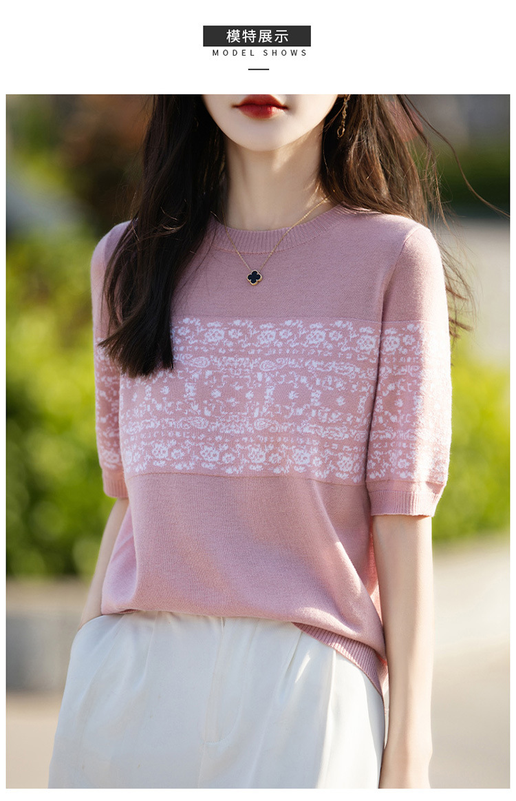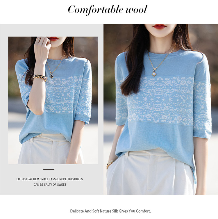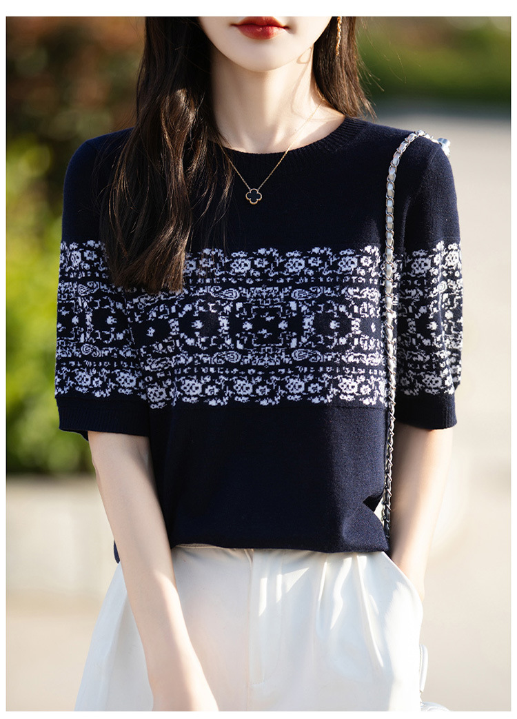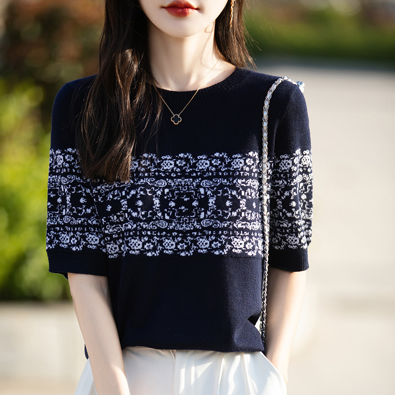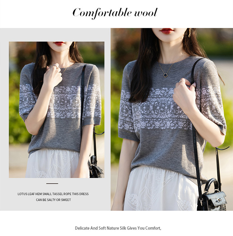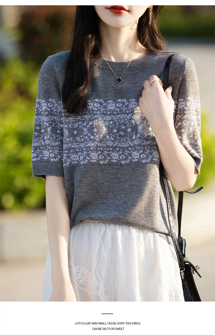 2024 лето новый камвольный шерстяной свитер с короткими рукавами женский округлый воротник жаккардовый цвет свободный модный топ
