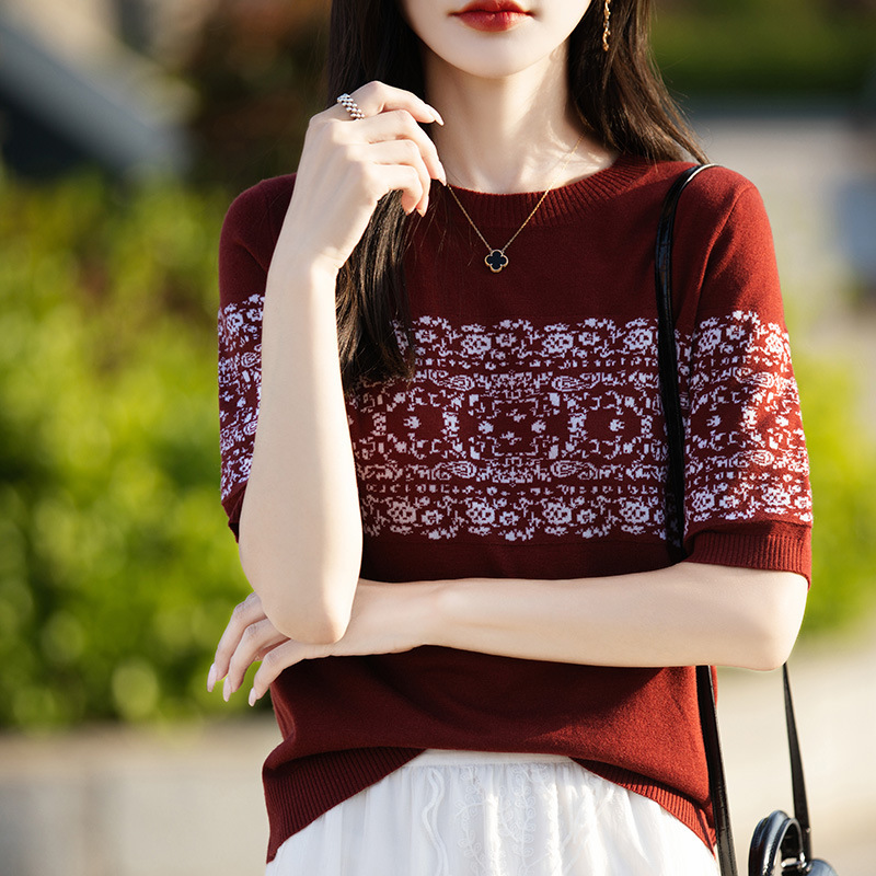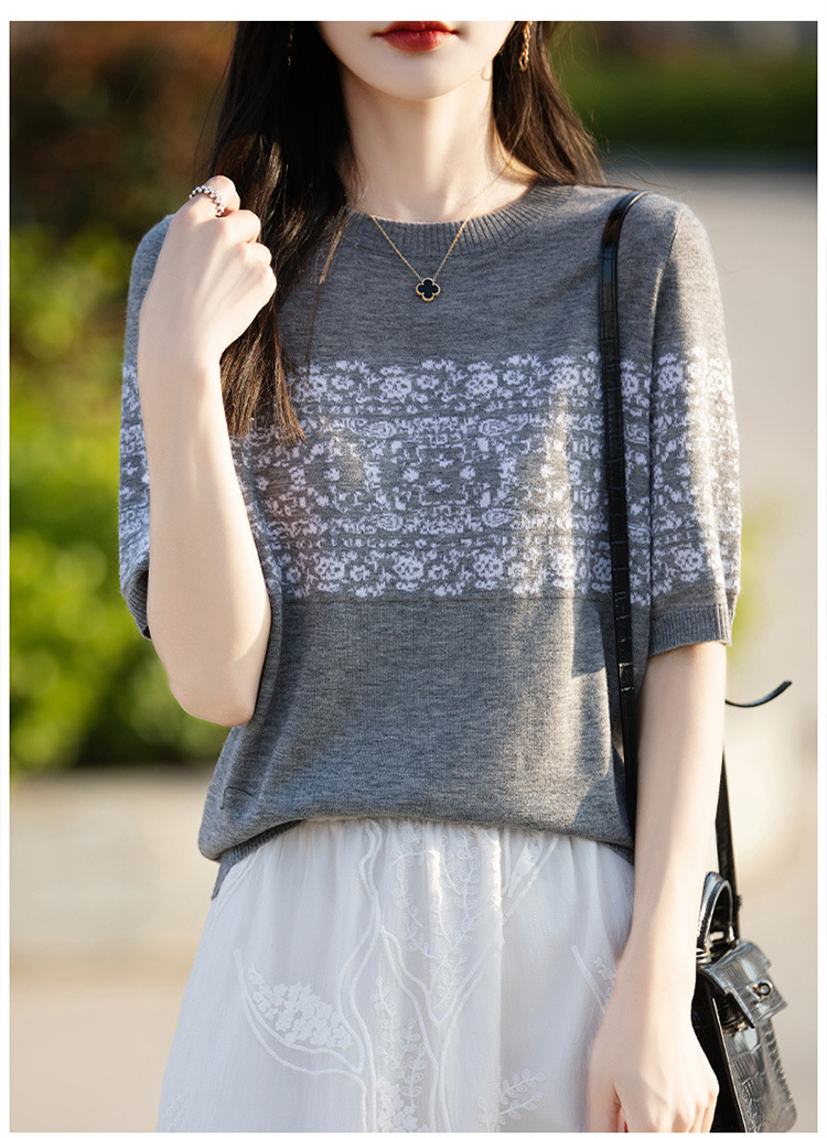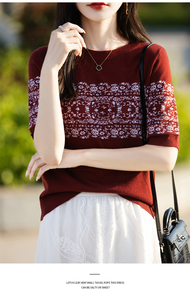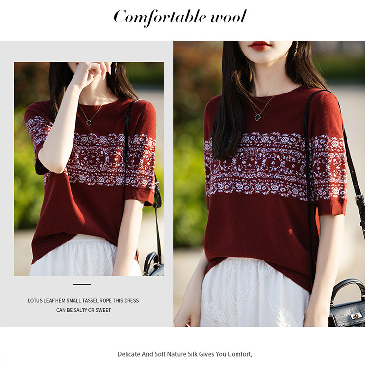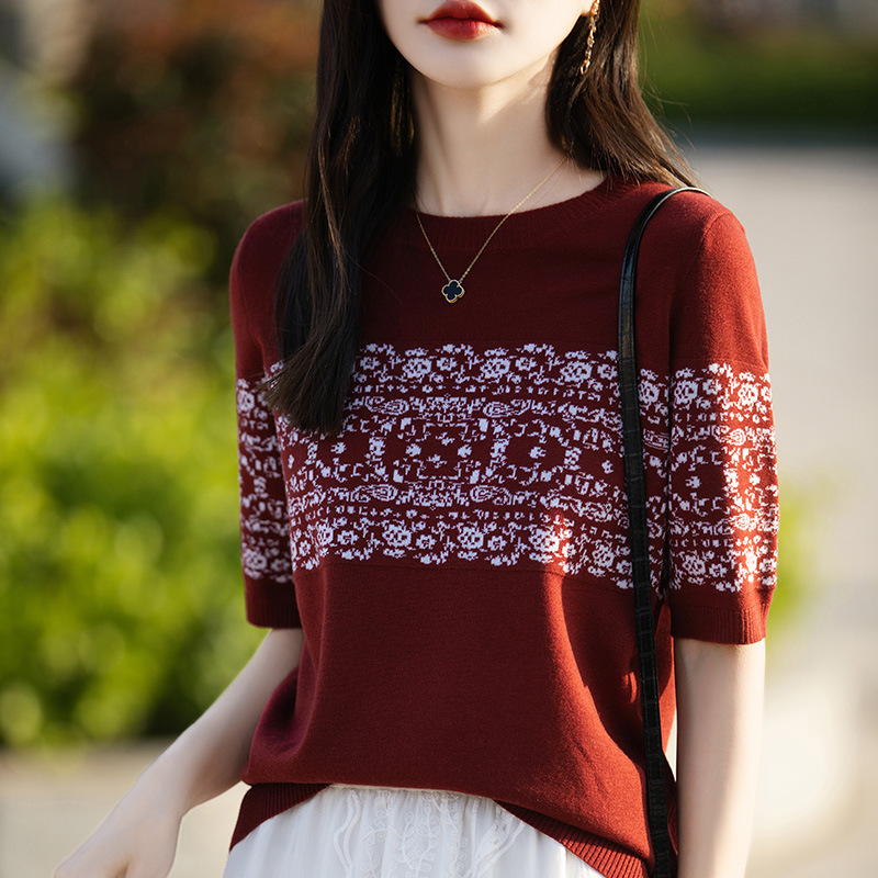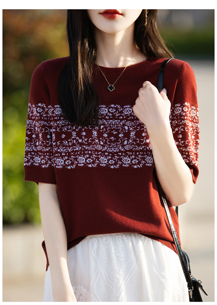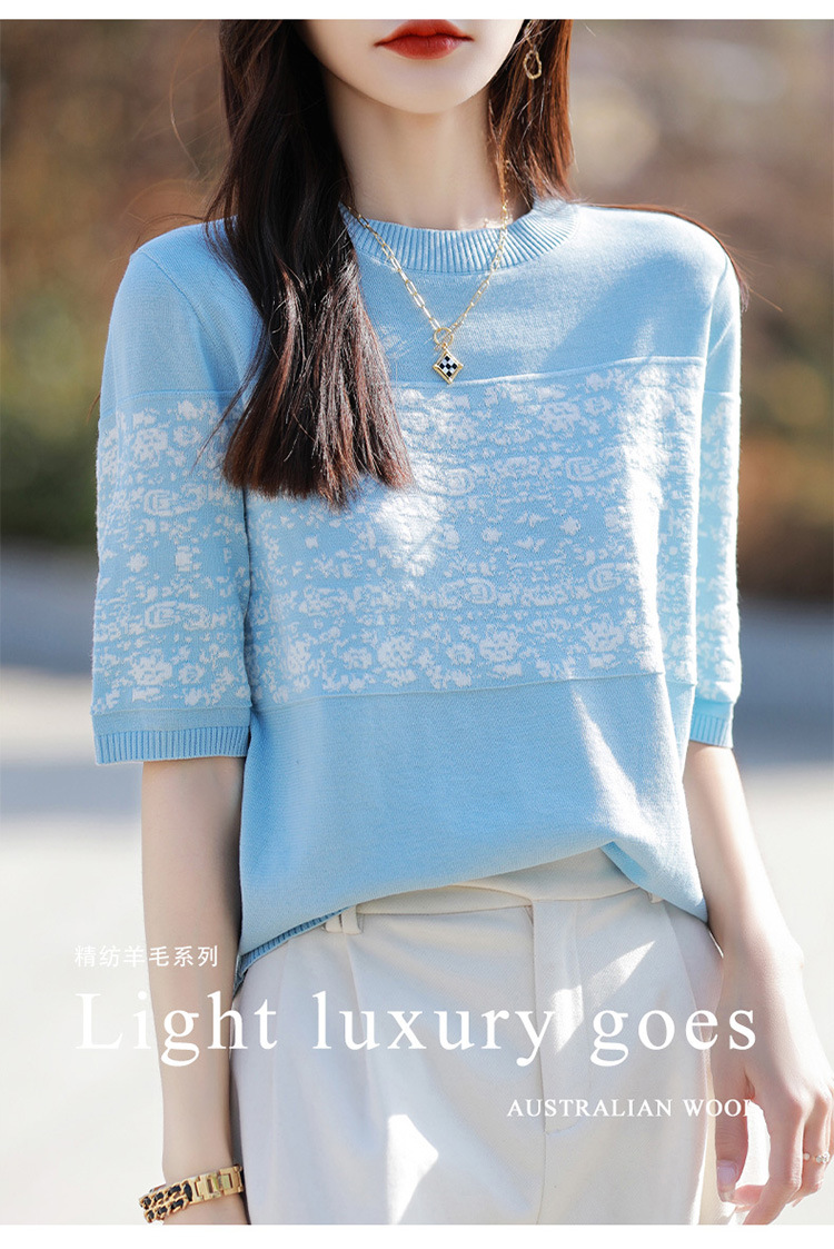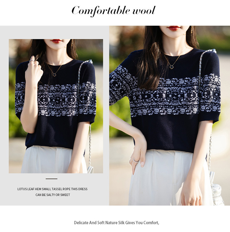 2024 лето новый камвольный шерстяной свитер с короткими рукавами женский округлый воротник жаккардовый цвет свободный модный топ