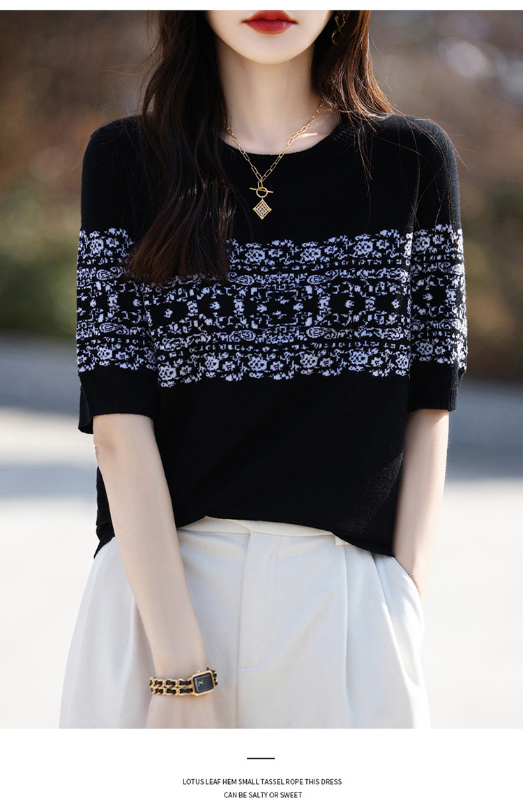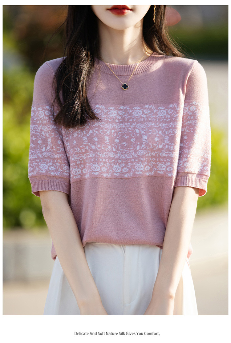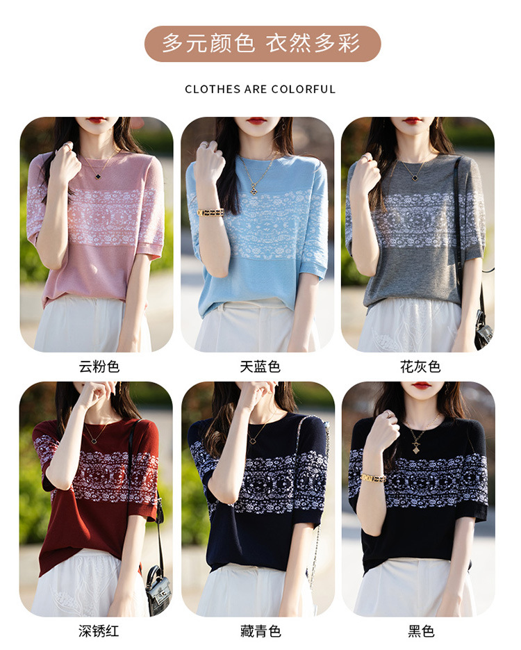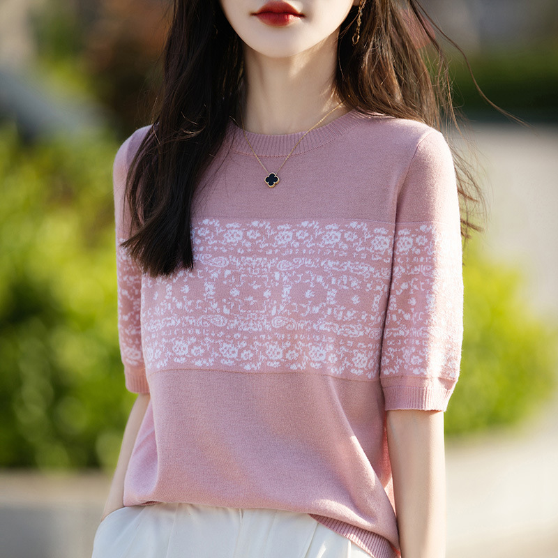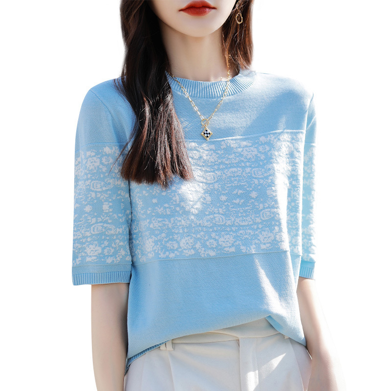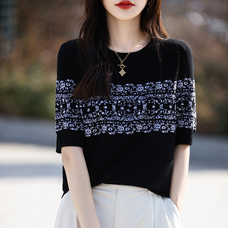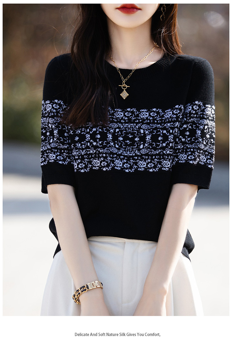 2024 лето новый камвольный шерстяной свитер с короткими рукавами женский округлый воротник жаккардовый цвет свободный модный топ